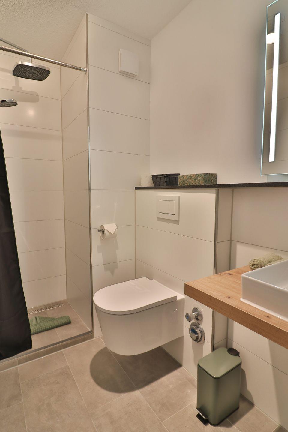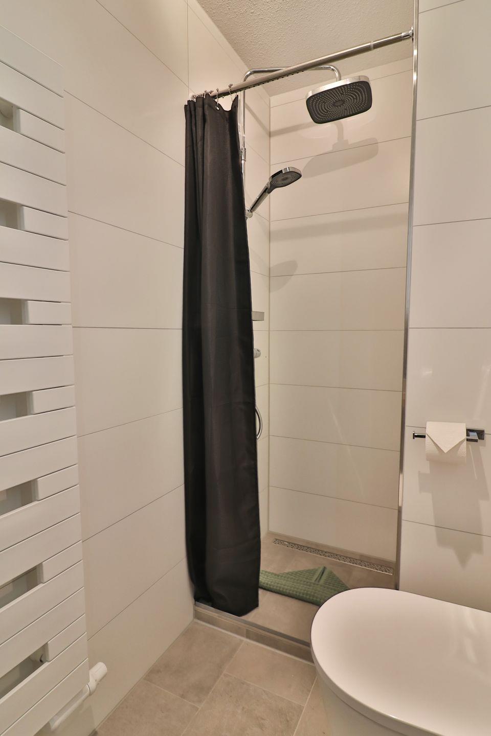 Im Badezimmer – ausgestattet mit einer offenen Dusche mit Duschvorhang, Waschbecken, WC, Spiegel und Haartrockner – finden Sie moderne Funktionalität und eine helle Atmosphäre.
