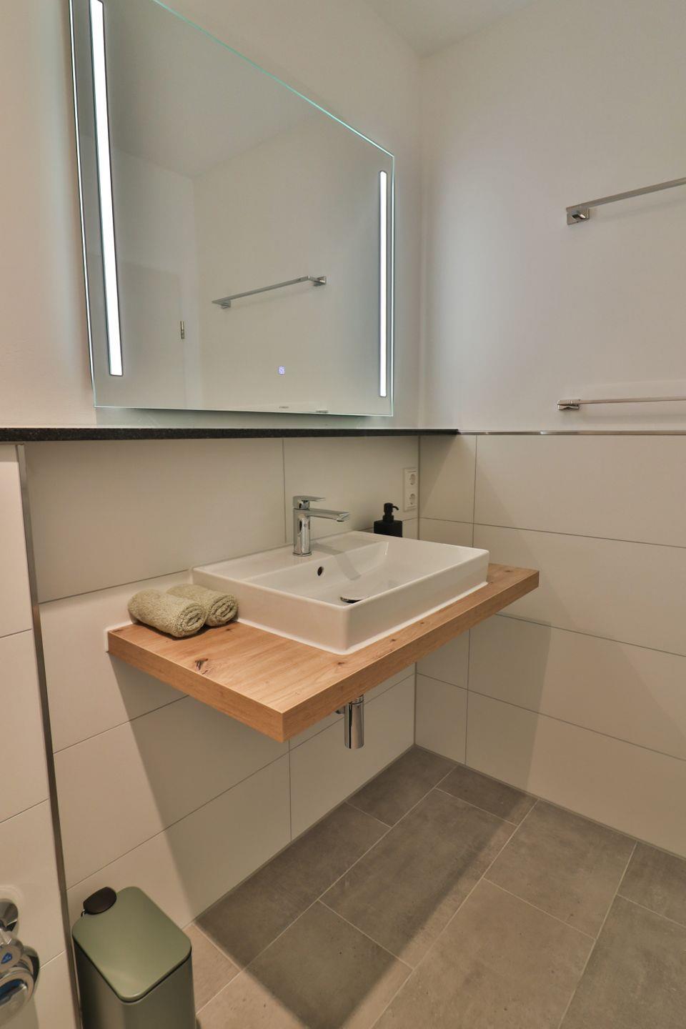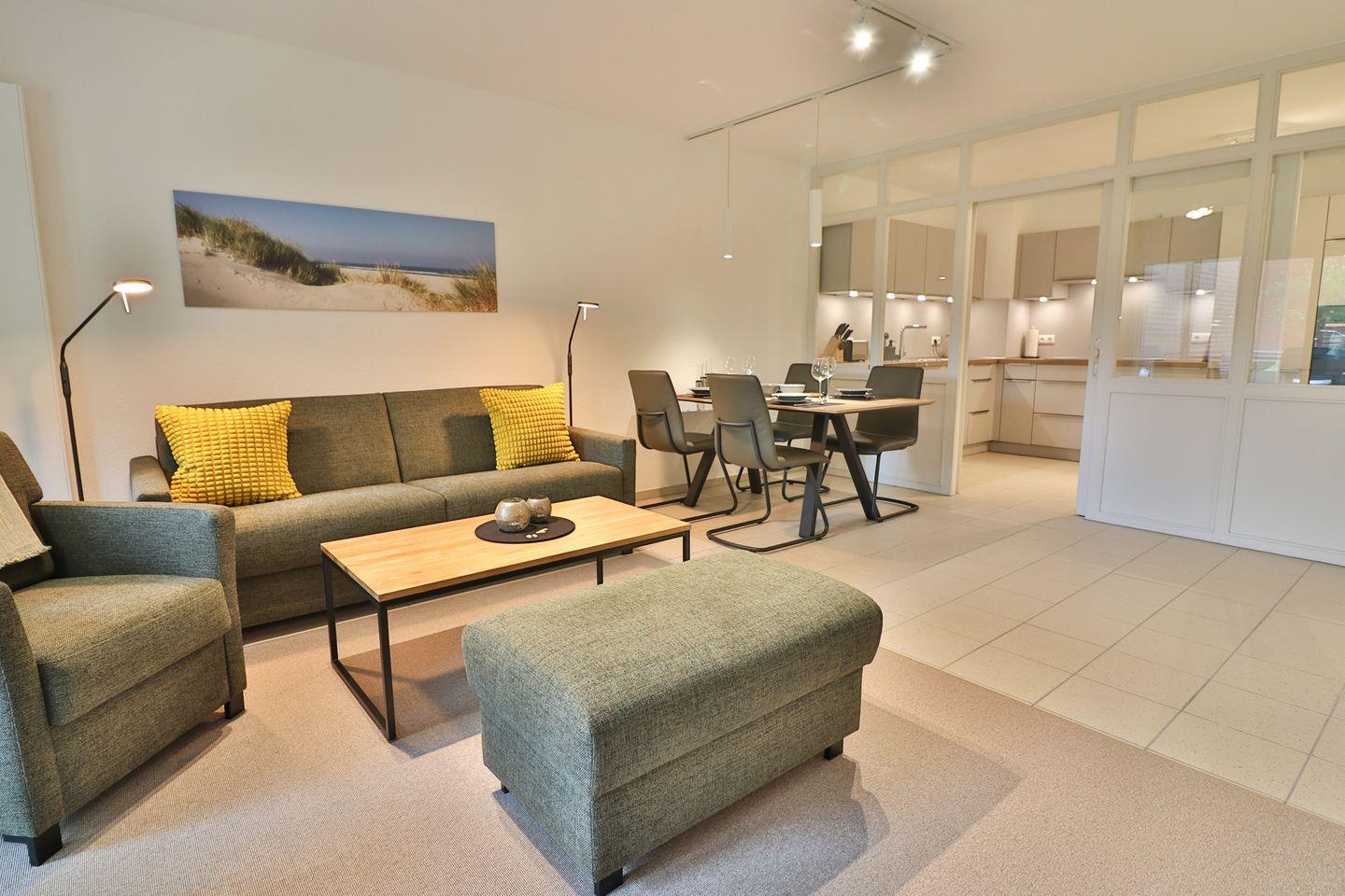 Im großzügig geschnittenen Wohnzimmer stehen Ihnen eine Sofaecke mit (Schlaf-)Sofa (160 x 190 cm) und Sessel, ein TV sowie ein Essbereich mit Esstisch zur Verfügung. Für gemütliche Lesestunden oder gesellige Abende sorgen bereitgestellte Bücher und Spiele. Die abgeschlossene, großzügige Küche ist modern ausgestattet: Neben einem Induktionsherd und Backofen finden Sie einen Kühlschrank inklusive Gefrierfach, eine Spülmaschine, Mikrowelle, Wasserkocher, Toaster sowie sämtliche Küchenutensilien, Geschirr und Besteck vor.
