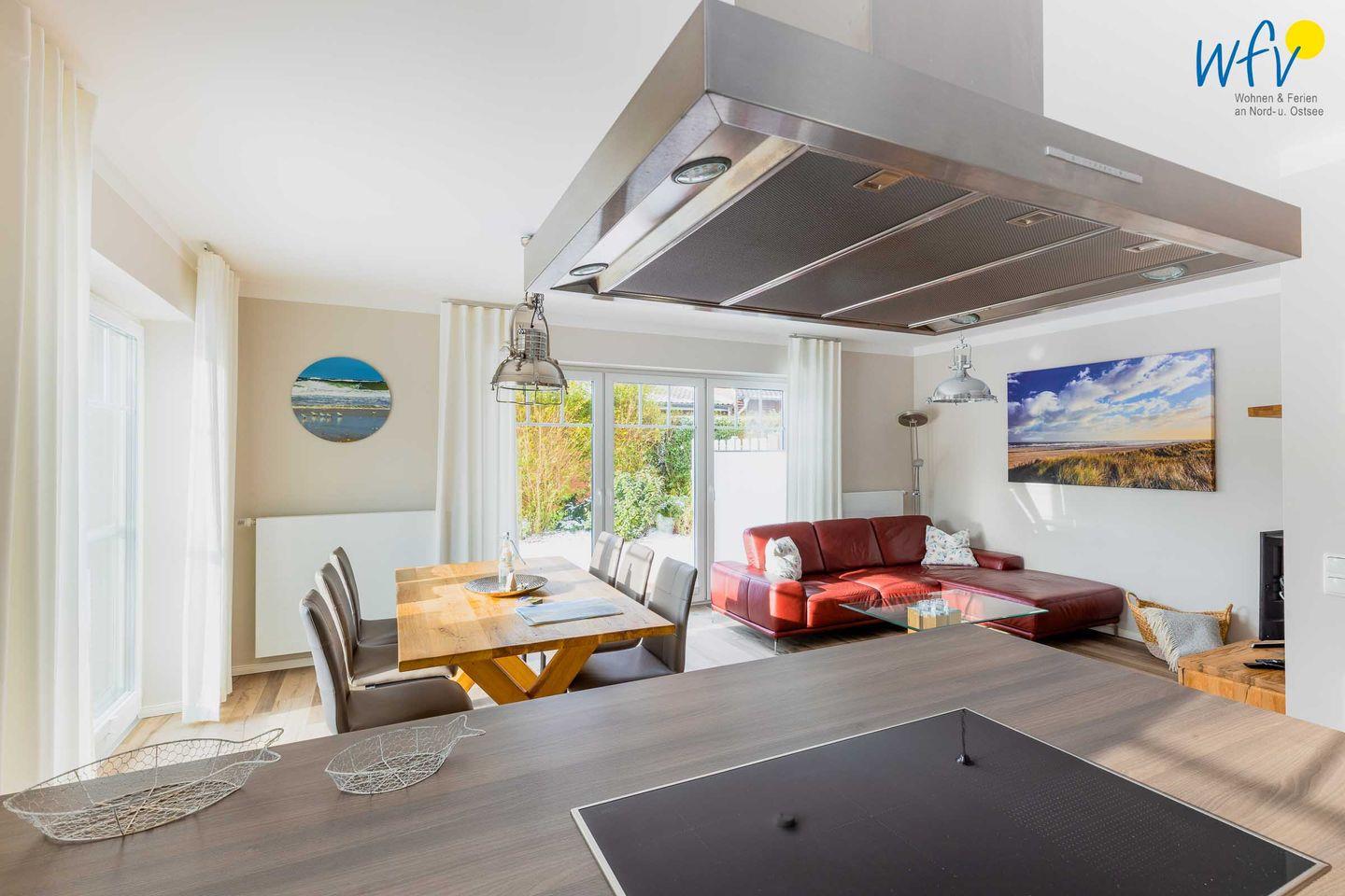 Oder Sie finden Ihren Lieblingsplatz in der offenen modernen Küche mit Küchenzeile, Kochinsel und schönem Blick in die Umgebung - ein herrlicher Platz zum gemeinsamen Kochen und Klönen! Mit den hochwertigen Elektro- und Kleingeräten wie Mikrowelle, Ceranherd, Backofen, Kaffeemaschine, Wasserkocher und Toaster lassen sich schnell und einfach leckere Gerichte zaubern oder Snacks für den Ausflug zubereiten. Die Spülmaschine übernimmt den Abwasch für Sie.
