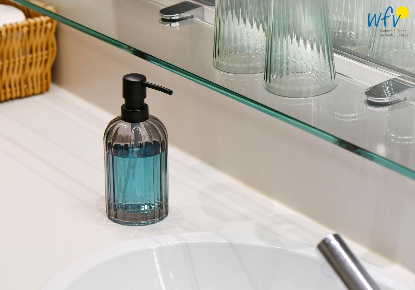 Für zusätzlichen Wohnkomfort sorgt das elegante Badezimmer mit Dusche, breitem Waschtisch, großem Spiegel sowie Kosmetikspiegel, Föhn und Handtuchheizung.