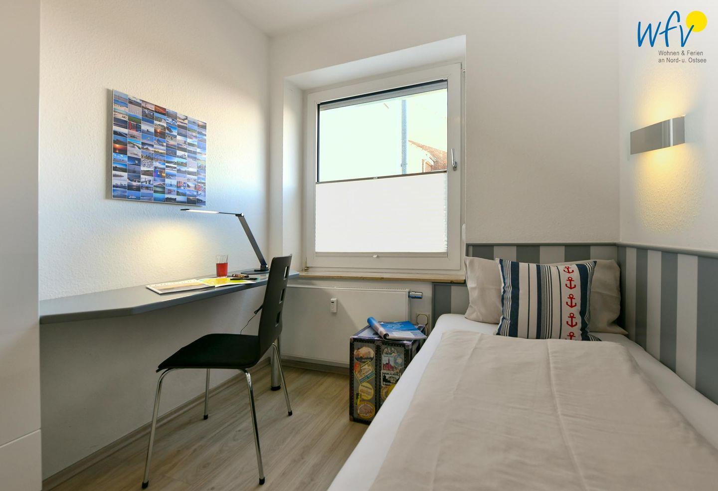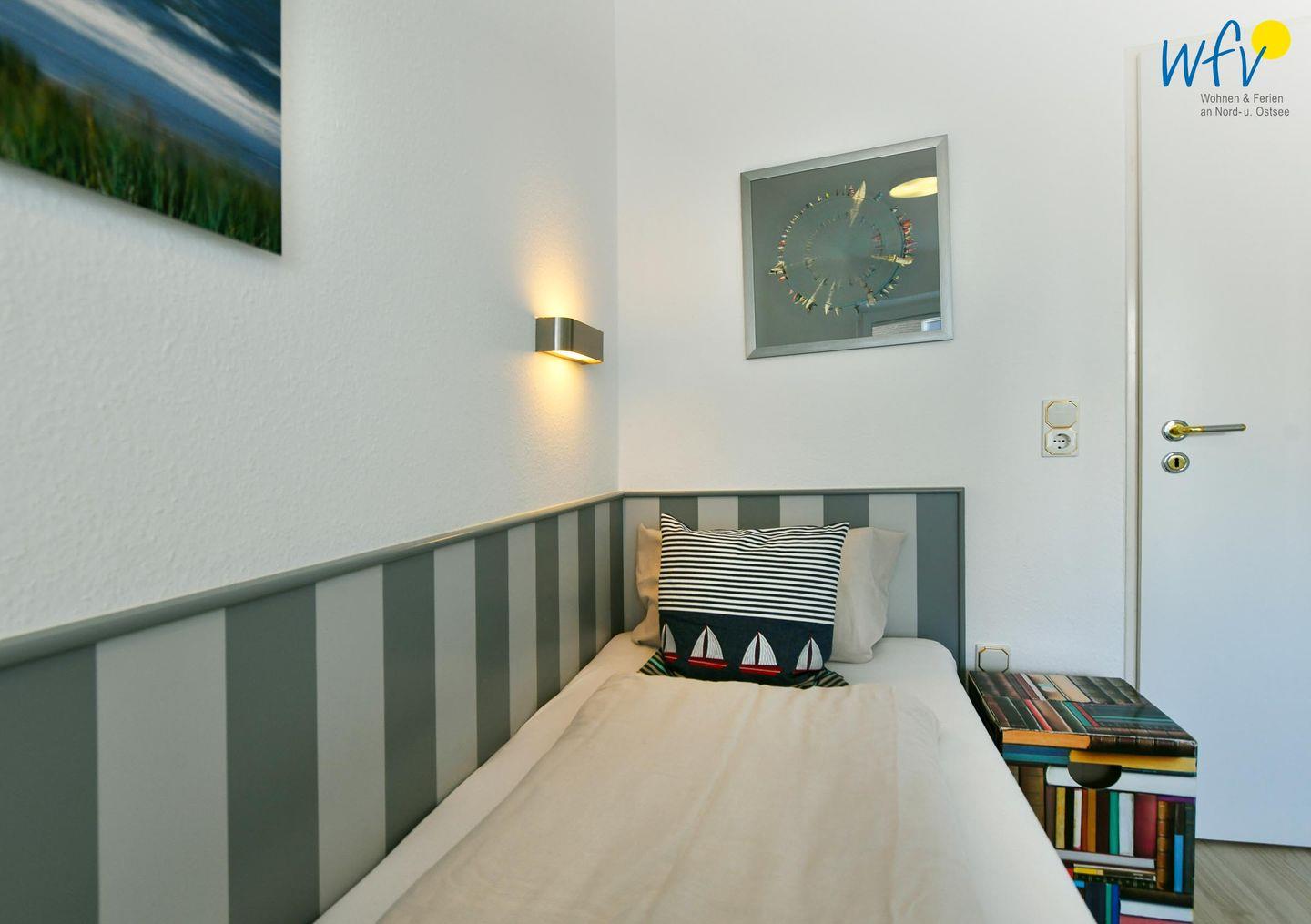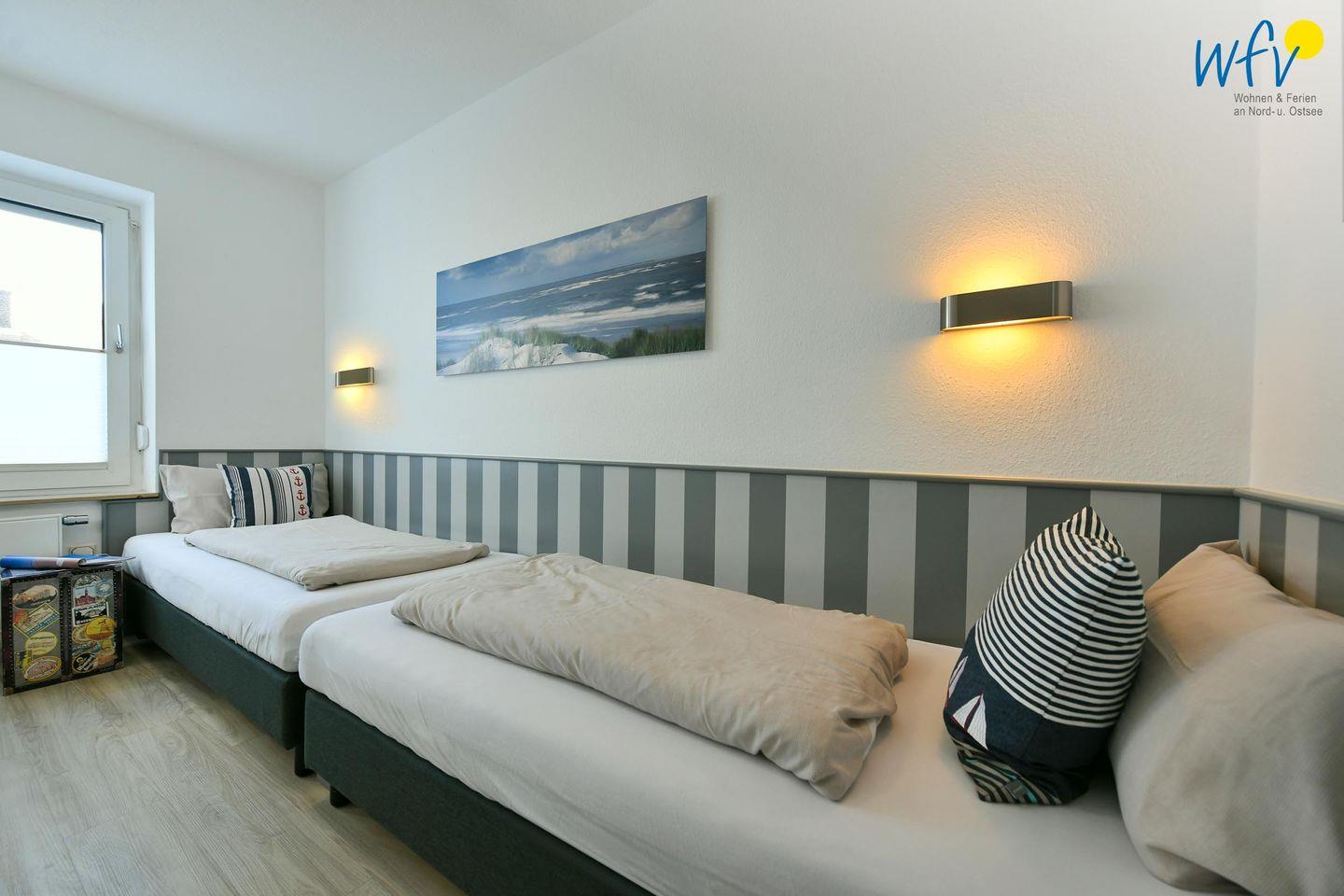 Wenn auf Langeoog die Sonne untergeht, bieten Ihnen zwei separate Schlafzimmer einen wohligen Rückzugsort. Das Elternschlafzimmer ist mit einem Doppelbett ausgestattet (180 cm x 200 cm), das Kinderzimmer mit zwei Einzelbetten (je 90 x 190 cm). Für Ihre Urlaubsgarderobe sind geräumige Kleiderschränke vorhanden, zudem befindet sich im Elternschlafzimmer ein TV.