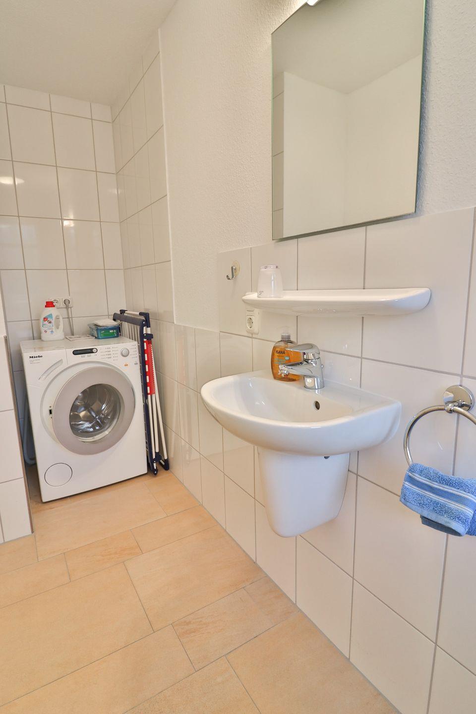 Eine durchdachte Ausstattung mit Fußbodenheizung, Sichtschutz an allen Fenstern sowie Wäscheständer, Bügelbrett, Bügeleisen und Staubsauger sorgen für zusätzlichen Komfort.