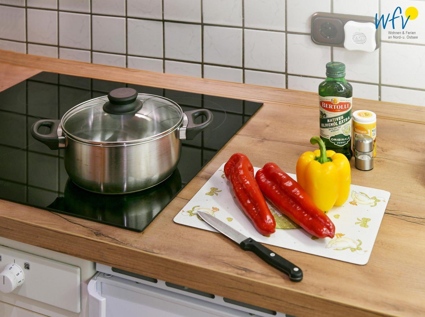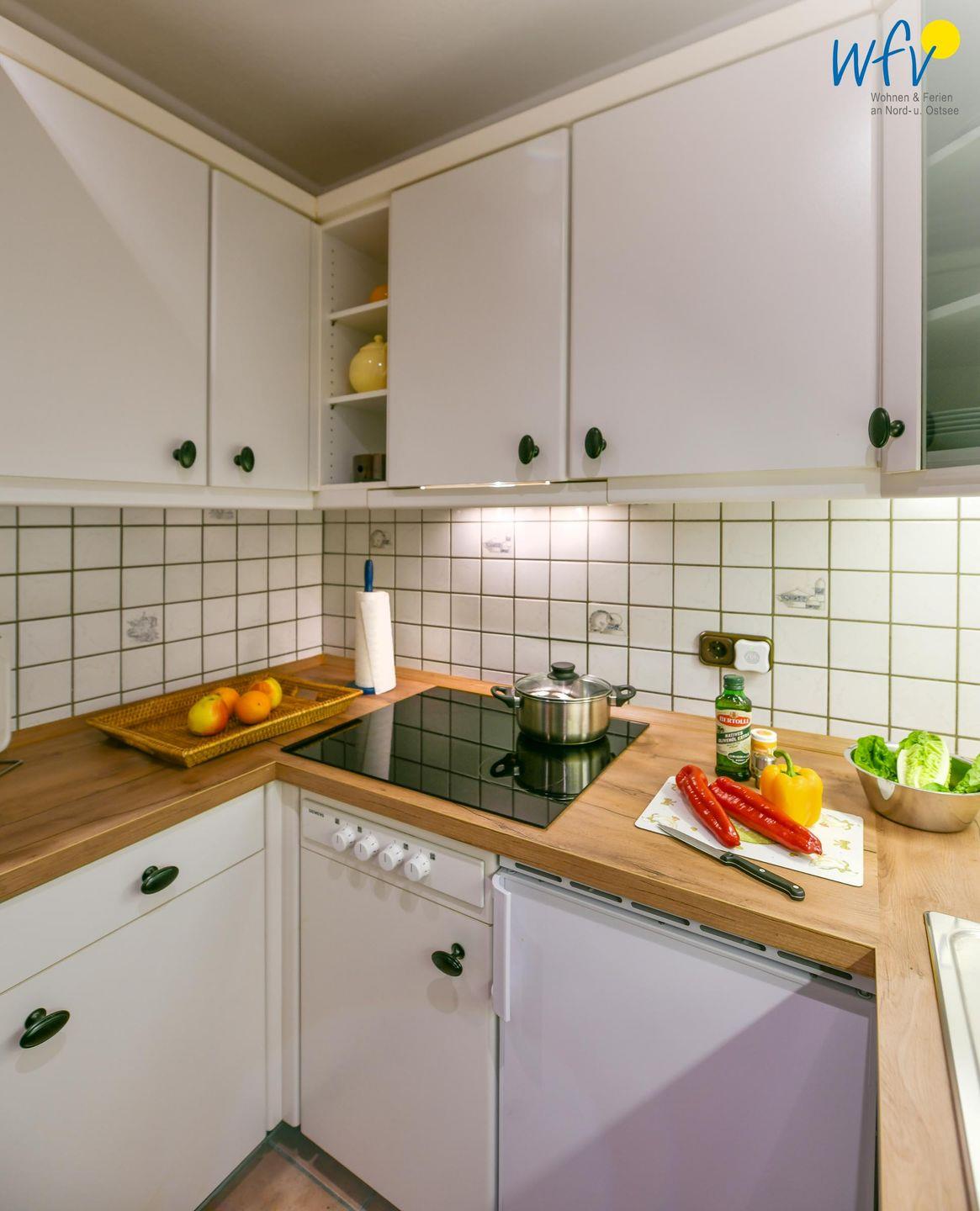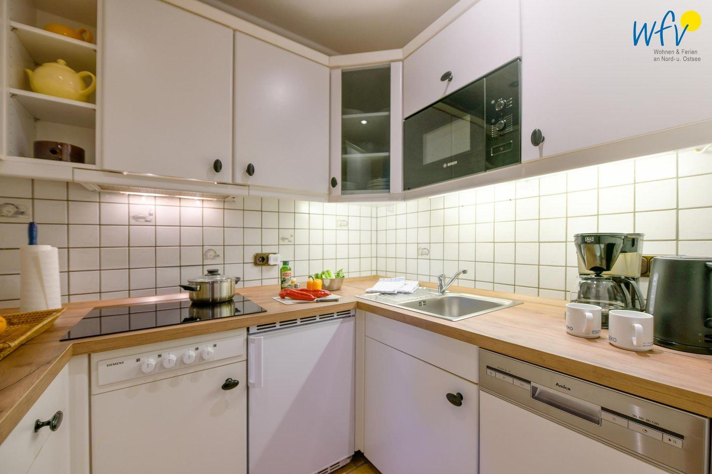 Snacks für den Ausflug, das Ferienfrühstück oder das Dinner lassen sich bequem in der komplett eingerichteten Küchennische zubereiten. Sie verfügt u.a. über Induktionsherd, Mikrowelle, Spülmaschine, Spüle, Toaster, Kaffeemaschine und Kühlschrank mit Eisfach.