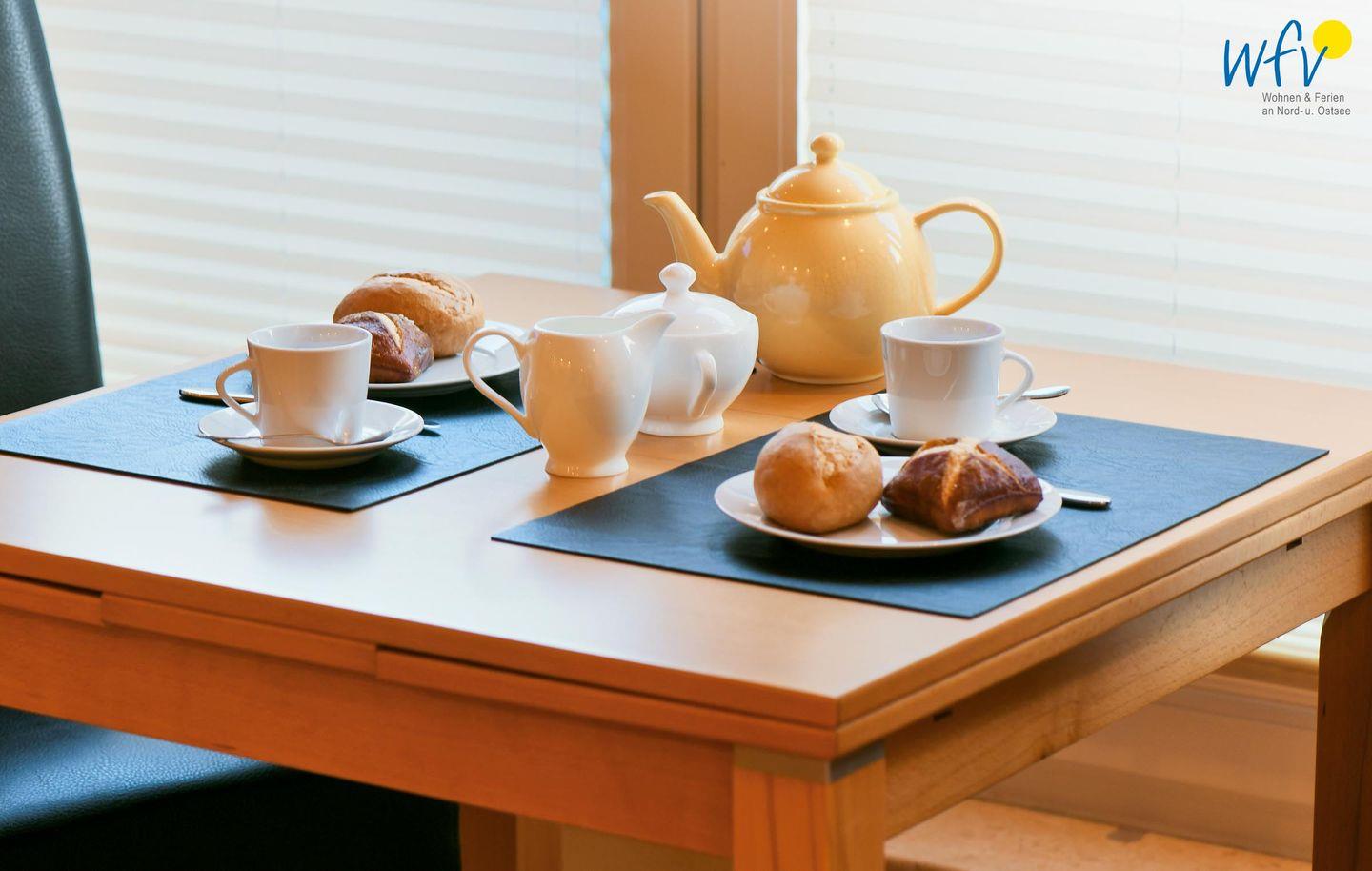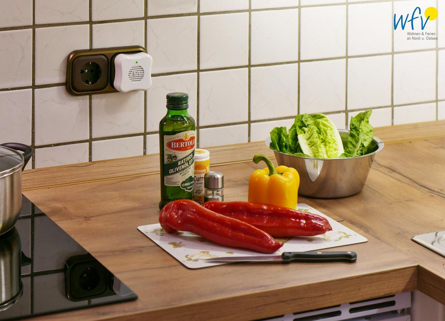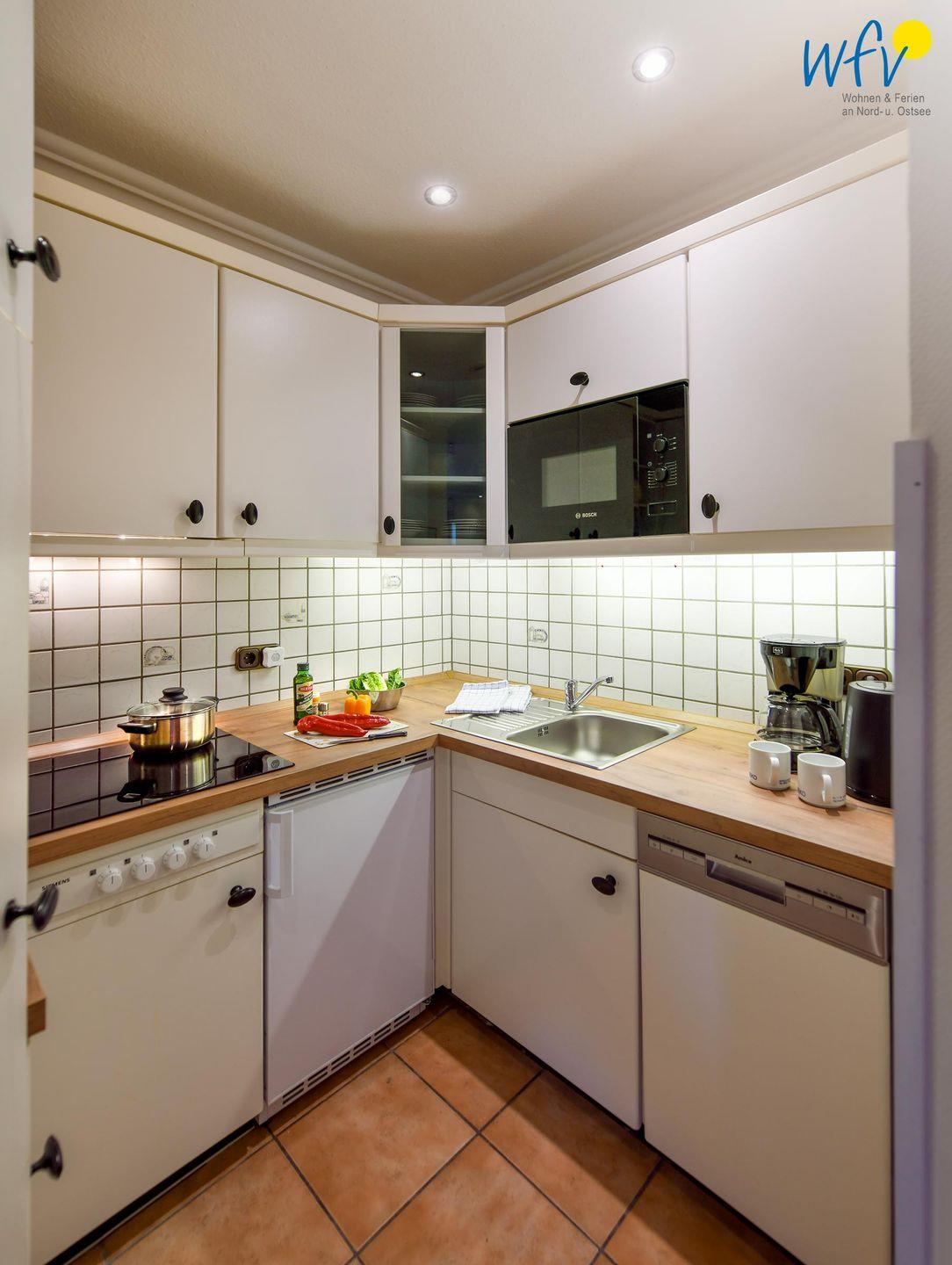 Snacks für den Ausflug, das Ferienfrühstück oder das Dinner lassen sich bequem in der komplett eingerichteten Küchennische zubereiten. Sie verfügt u.a. über Induktionsherd, Mikrowelle, Spülmaschine, Spüle, Toaster, Kaffeemaschine und Kühlschrank mit Eisfach.