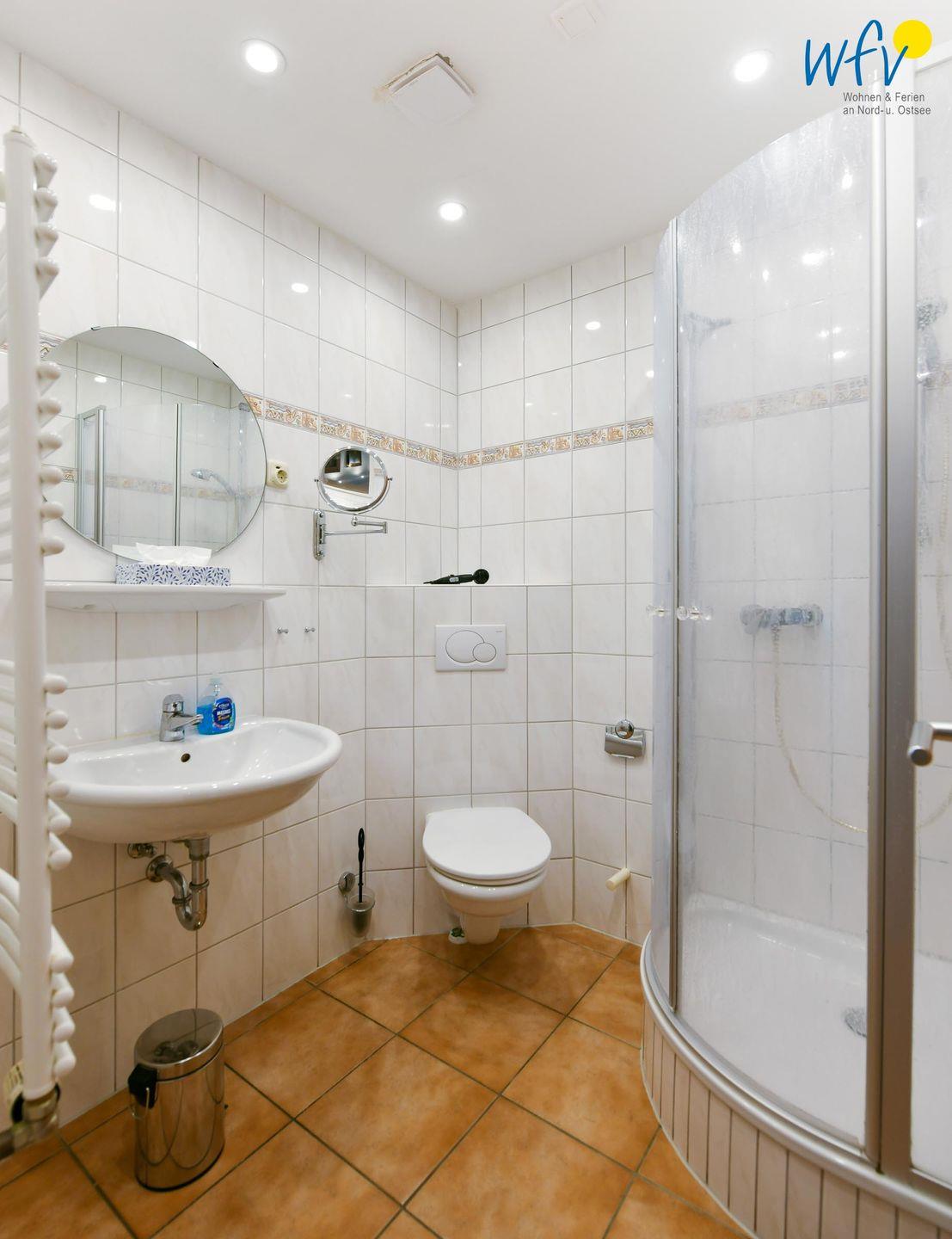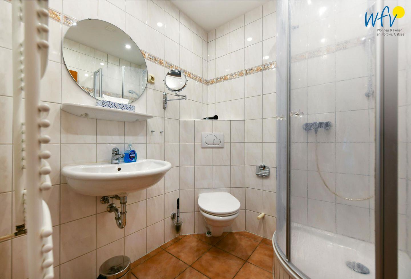 Für weiteren Wohnkomfort sorgt das moderne Badezimmer mit Dusche und WC sowie Schminkspiegel und Föhn.
