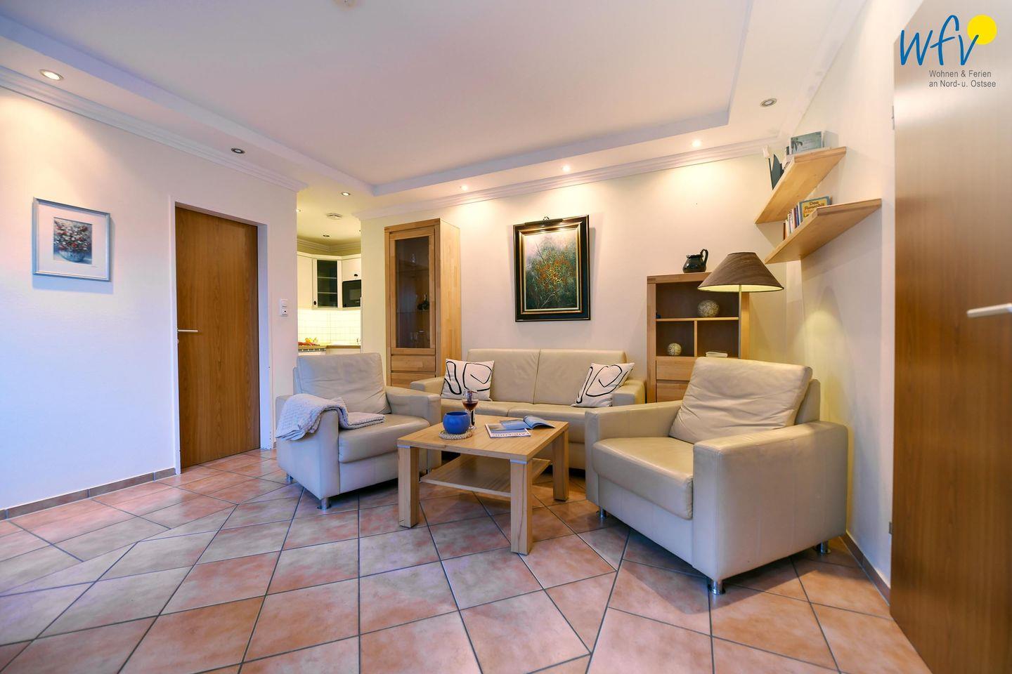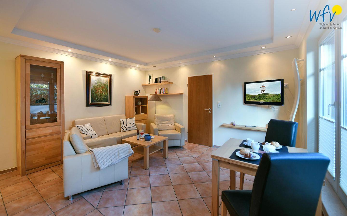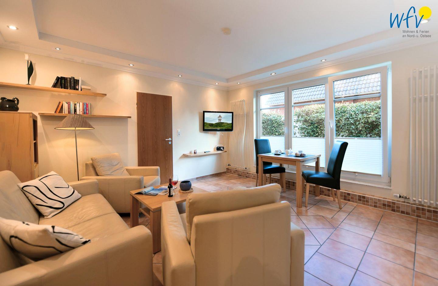 Nach der Fahrradtour oder dem Strandspaziergang lädt der gemütliche Wohnbereich mit Couch, Sesseln und Esstisch zu gemeinsamen Stunden zu zweit ein. Bodentiefe Fenster sorgen hier und auch im Schlafzimmer für eine helle und freundliche Atmosphäre.