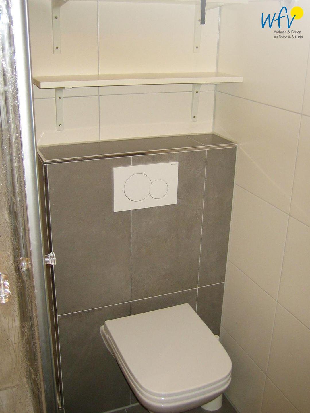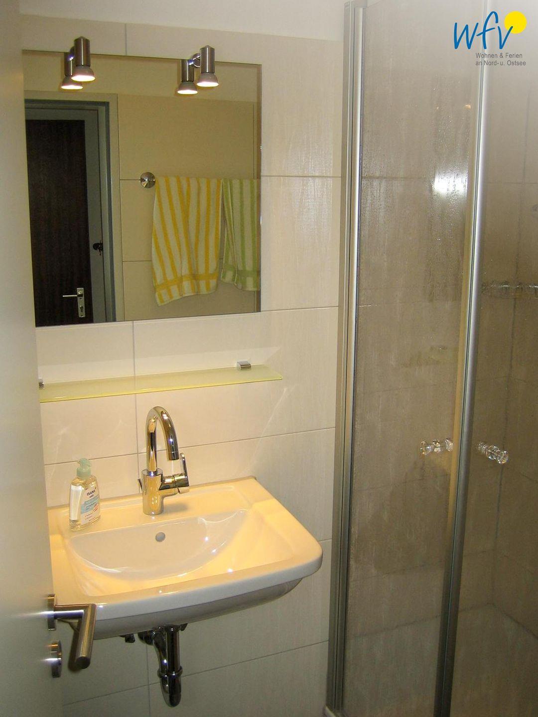 Wohnkomfort bietet Ihnen auch das moderne Badezimmer mit Dusche, Waschbecken, WC und beleuchtetem Spiegel.