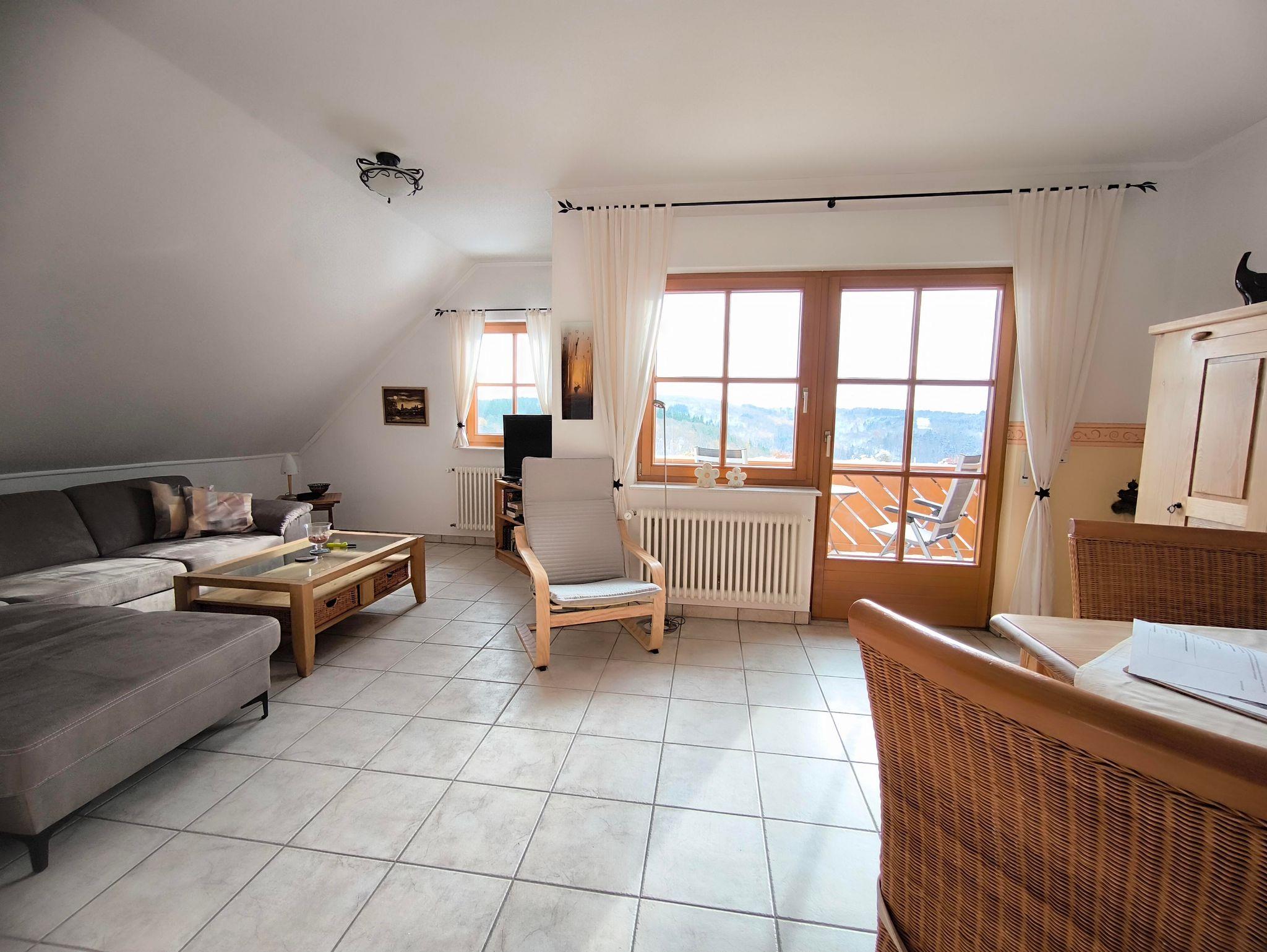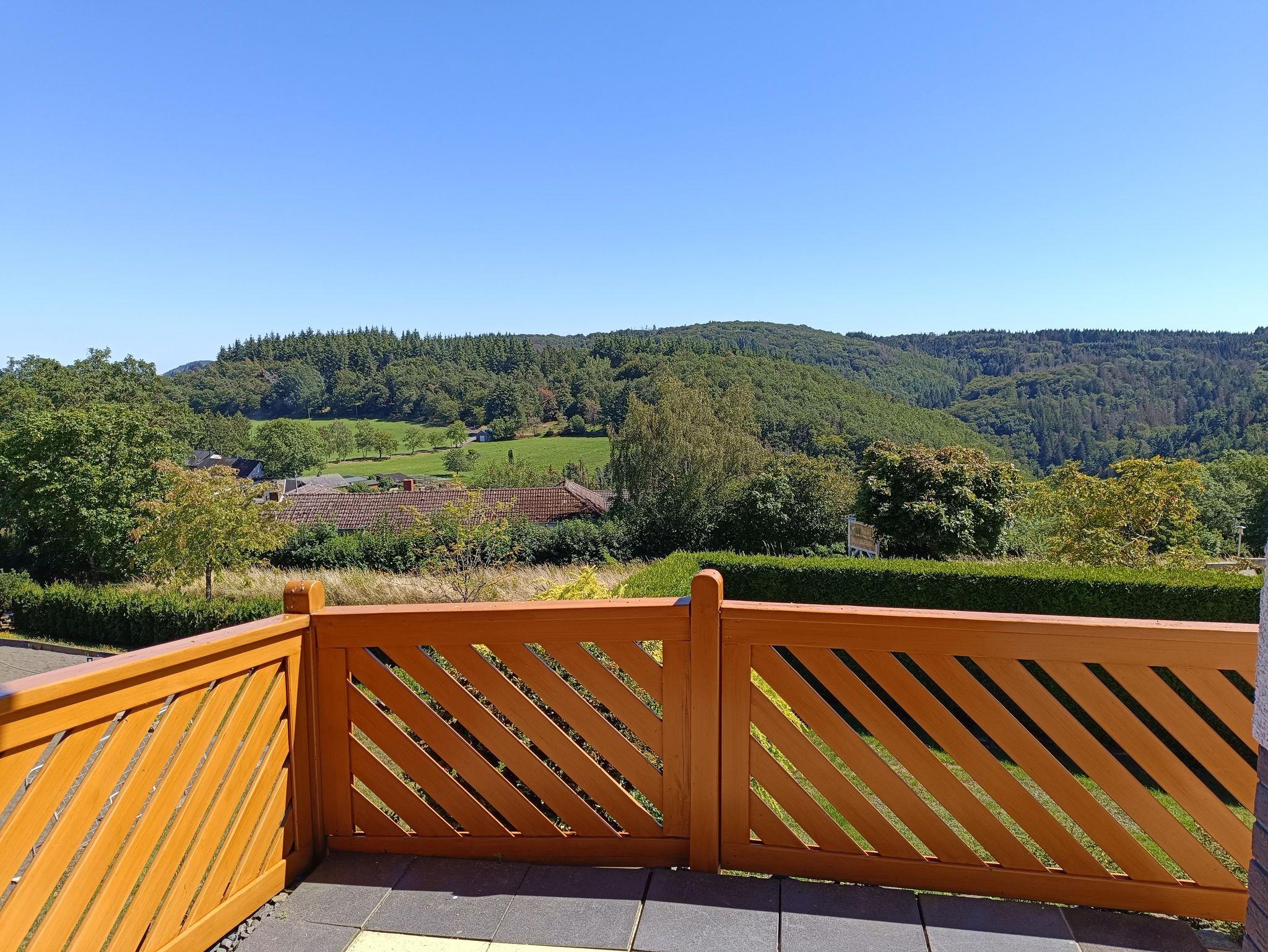 Der Balkon mit Süd-Ost Ausrichtung hat einen ungehinderten, weitschweifenden Blick über die wunderbare Eifellandschaft. Die Gartenstühle mit Auflagen, Tisch und Tischdecke und ein Sonnenschirm gehören auch zur Ausstattung.