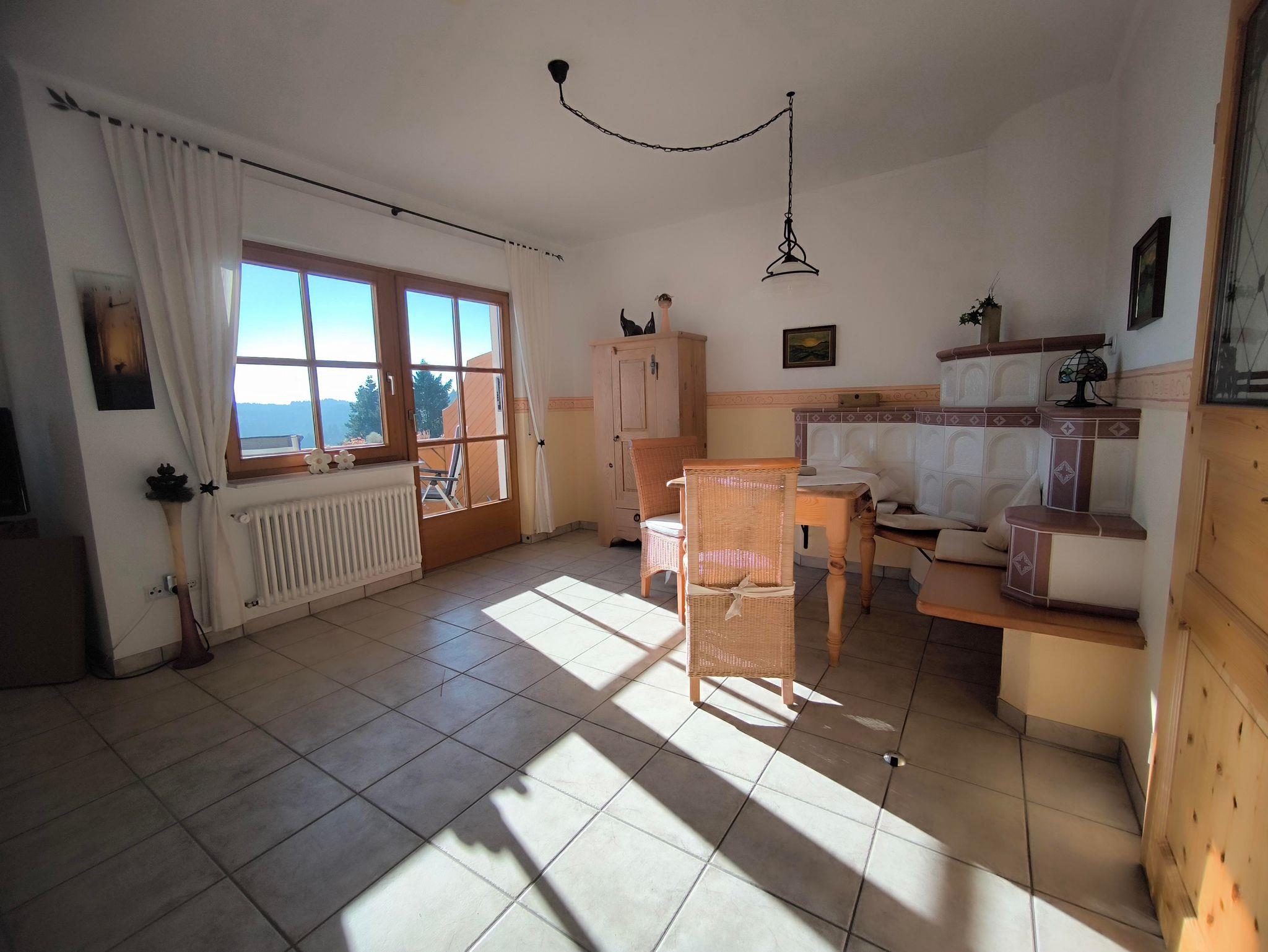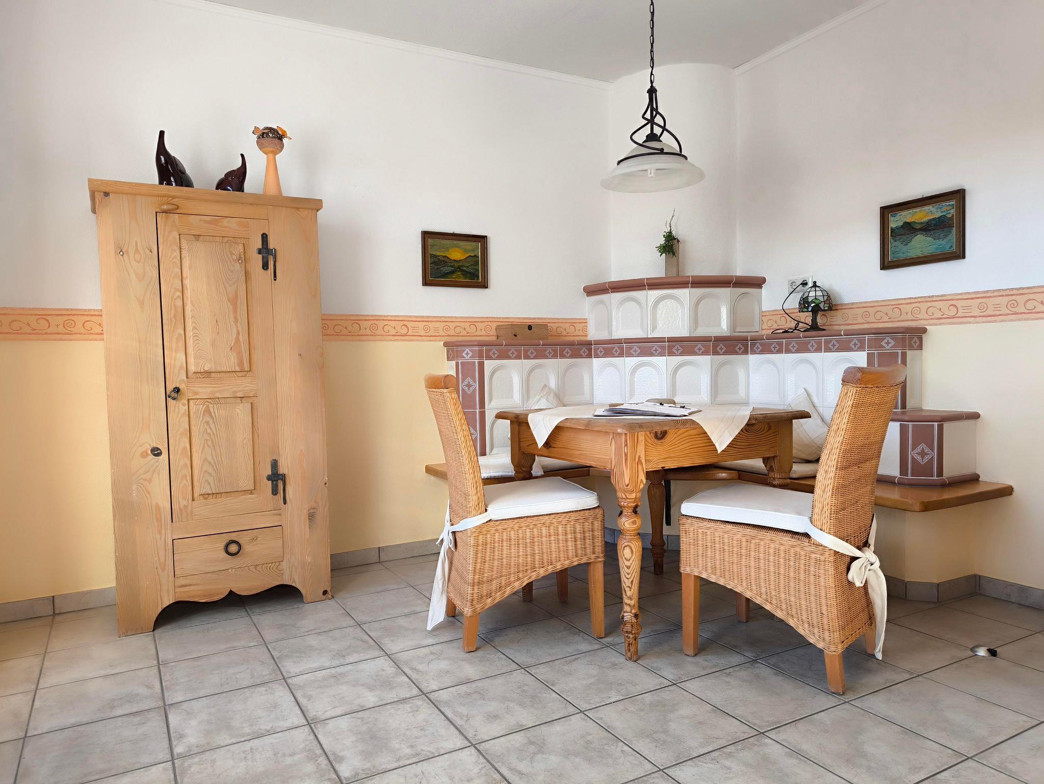 einem Wohn- und Esszimmer mit einer gemütlichen Couch-Ecke mit LCD-TV, Stereoanlage und DVD Player. In der Essecke steht ein zentral beheizter Kachelofen mit gemütlicher Holzofenbank, ein Tisch und zwei Stühle.