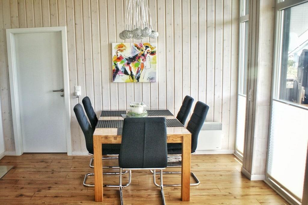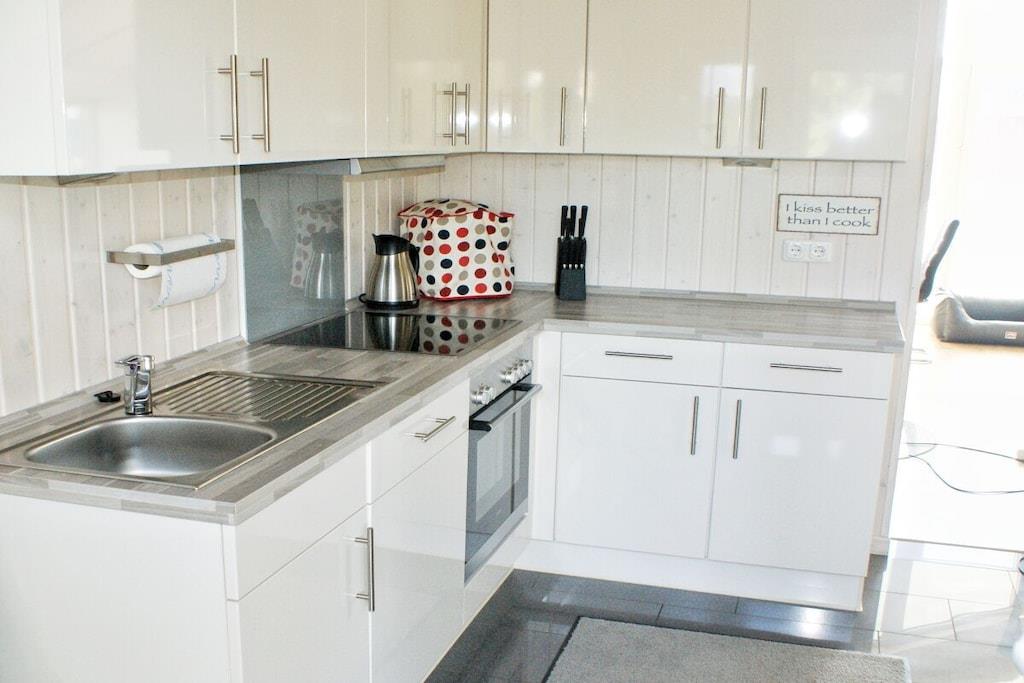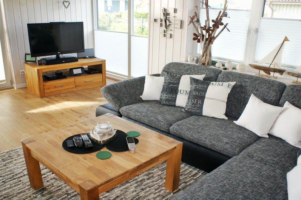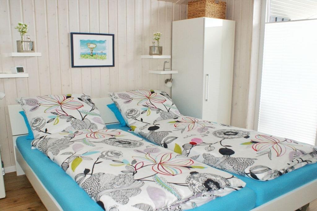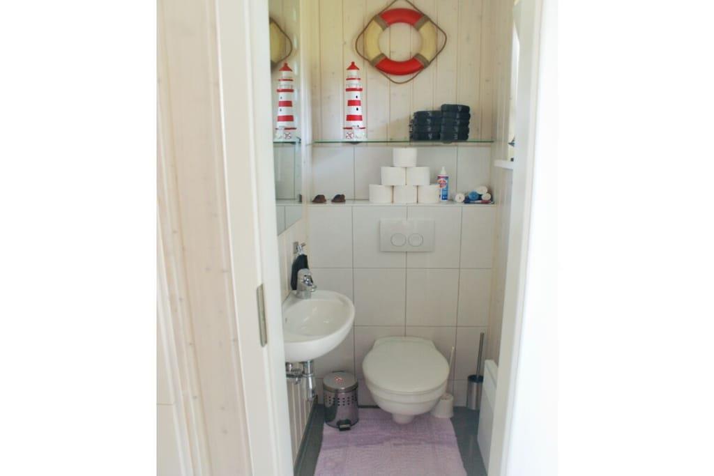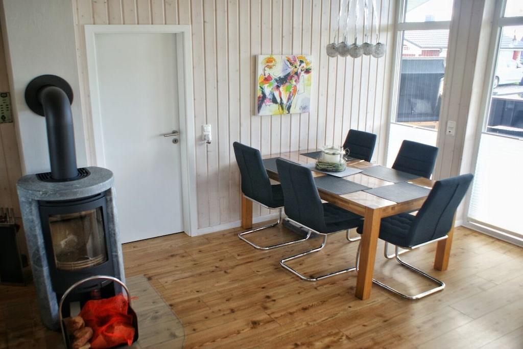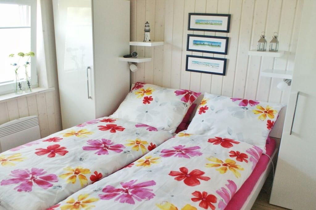 The holiday home "Nordseebrise" is tastefully furnished and offers ample space for up to four people with two bedrooms (one with a double bed 1.80m, the other with a double bed 1.60m). A sleeping loft (a "Hems" with additional sleeping space) is available at your own risk. The high-quality fitted kitchen is fully equipped. The open-plan living and dining area features a wood-burning stove, a comfortable sofa, and a dining table for up to five people. A flat-screen TV, stereo/CD player, and DVD player complete the amenities. The spacious bathroom offers our guests a sauna, a whirlpool bathtub, and a walk-in shower. A washing machine and tumble dryer are also available for quick laundry needs. Please note that pets are not allowed on the sofa or beds.