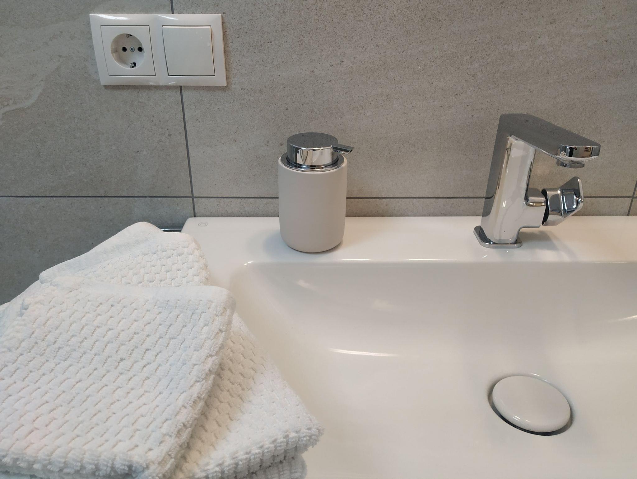 Unsere Ferienwohnung (75qm) überzeugt durch Großzügigkeit und Behaglichkeit mit geradlinigem, stilvollem Design. Die Wohnung ist hochwertig und modern ausgestattet und verfügt über eine Südterrasse. Sie bietet Platz für zwei Personen, ist barrierefrei und das ganze Jahr über zu mieten. Die Wohnung besteht aus einem modern eingerichteten Wohnzimmer, einem gemütlichen Schlafzimmer mit Doppelbett, einem Badezimmer mit begehbarer Dusche (Duschgel, Shampoo und Handseife sind vorhanden), einer Wohnküche mit Vollausstattung und einer geräumigen Diele. Vom Wohnzimmer aus kommen Sie auf eine eigene mediterran anmutende Terrasse mit Sonnenschirm, Essgruppe und zwei Liegestühlen. Hier dürfen Sie Ihre Seele baumeln lassen und herrlich entspannte Tage genießen! Wlan und Parkplatz sind kostenfrei, auch Waschmaschine und Trockner können kostenfrei genutzt werden. Bei der Wohnung handelt es sich um eine Nichtraucherwohnung.