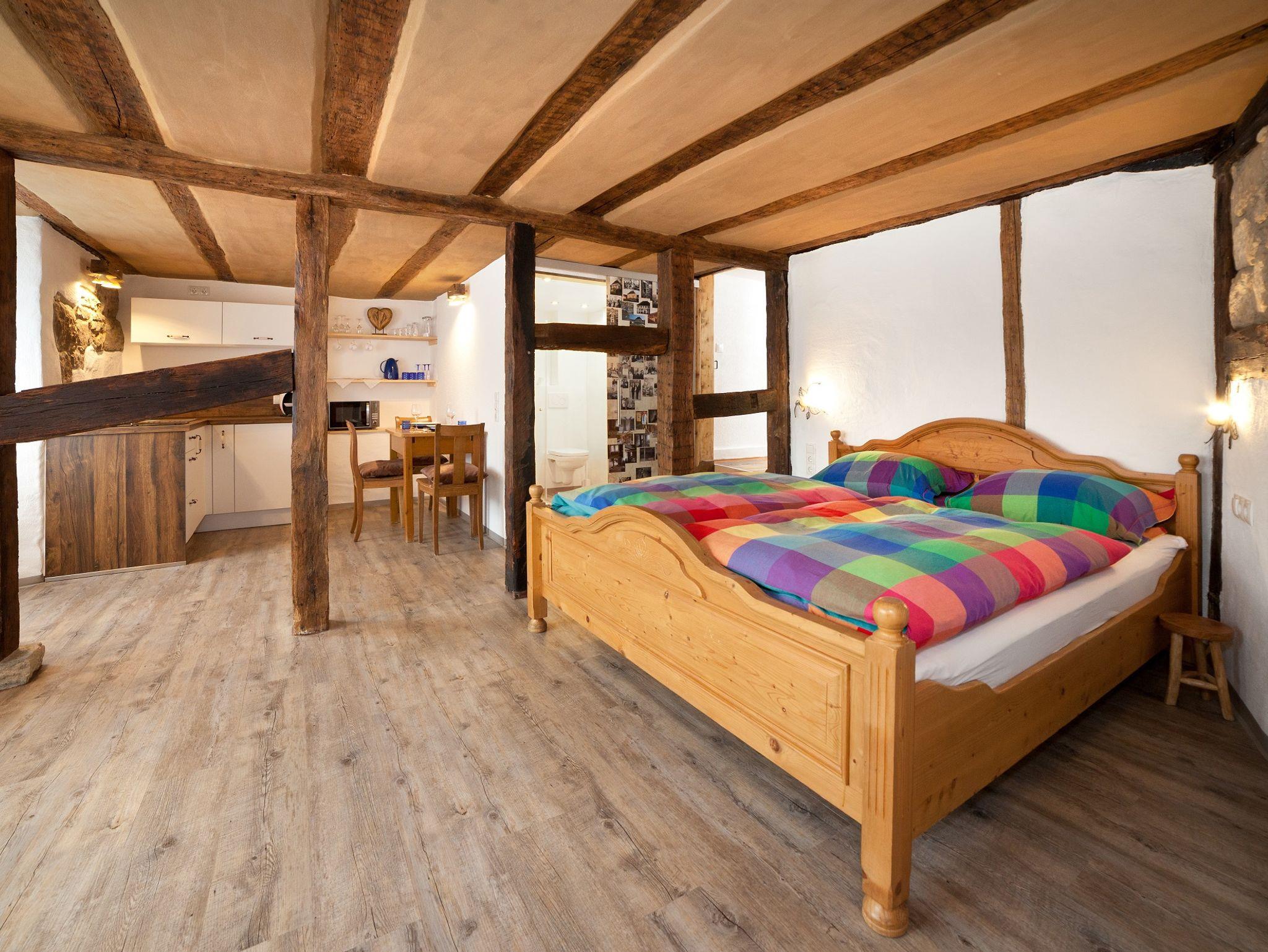 Im ca. 30 qm großen Nichtraucher Apartment beim Schloß Michel trennt das alte Fachwerk den Schlafbereich von Küche und Bad.