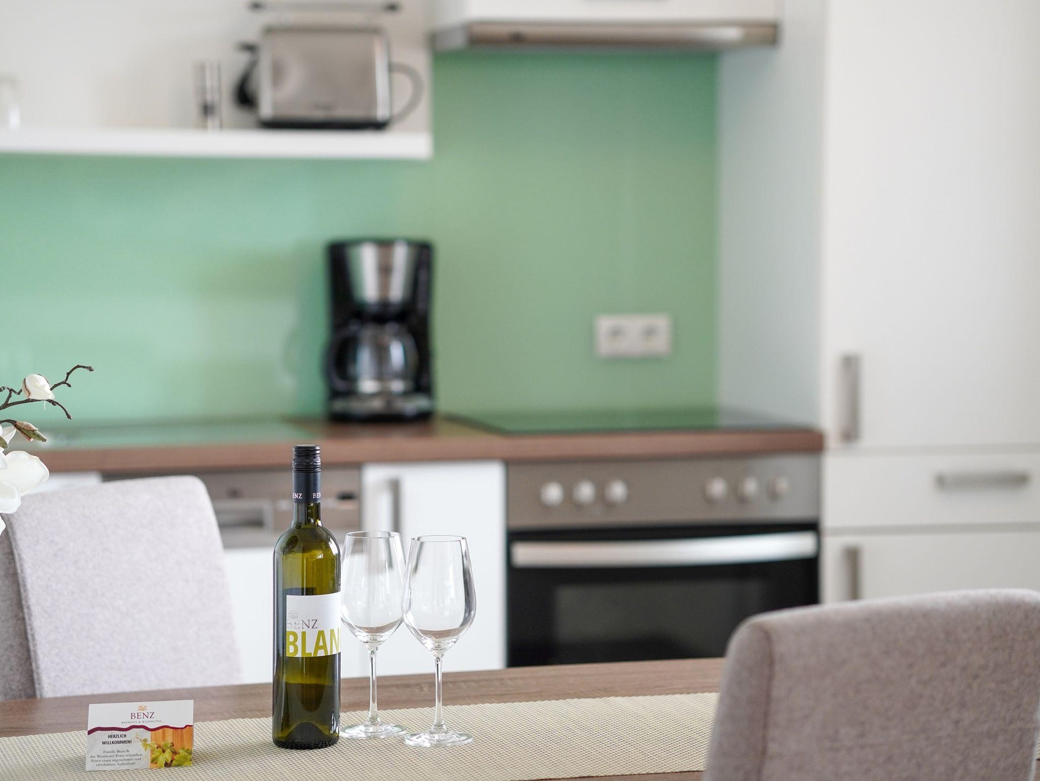 Genießen Sie regionale Spezialitäten in der modernen Appartement-Küche oder lassen Sie sich verwöhnen bei einem Sektfrühstück und werden Sie von der Morgensonne geküsst! Frisches Obst, im Sommer von unseren Streuobstwiesen, Kaffeespezialitäten von der regionalen Kaffeerösterei, Wurst vom heimischen Metzger …so starten Sie gestärkt in den Tag. Für den Schwung sorgt unser Winzersekt oder unser fruchtiger Traubensaft. Bei schönem Wetter lädt die Terrasse zum Frühstücken ein.