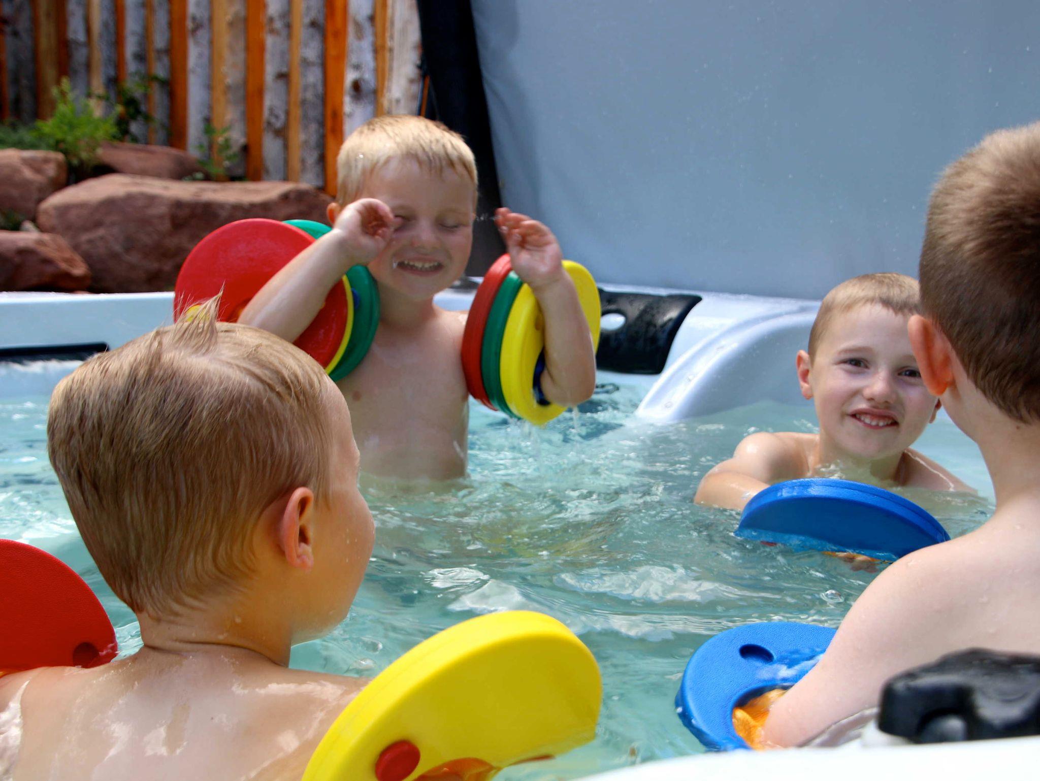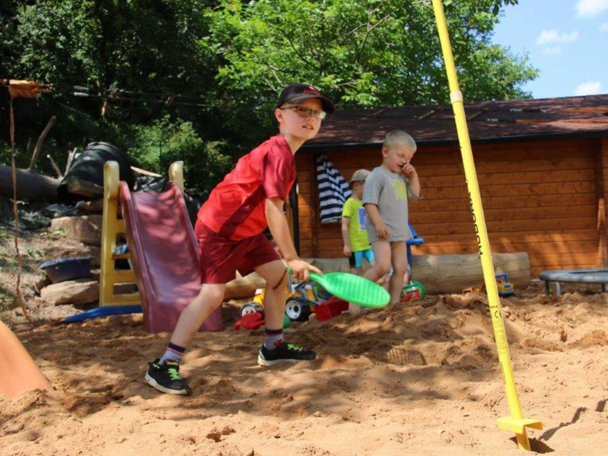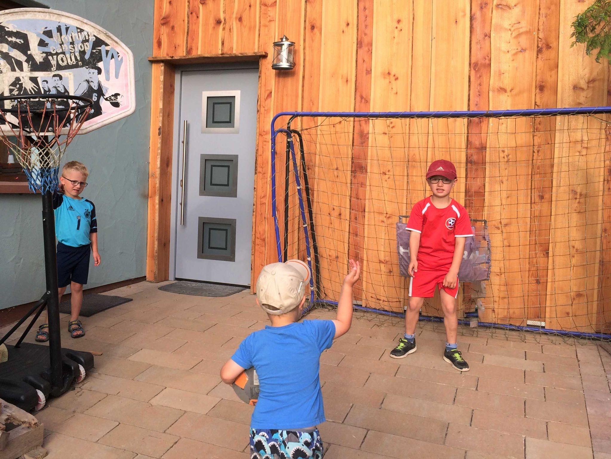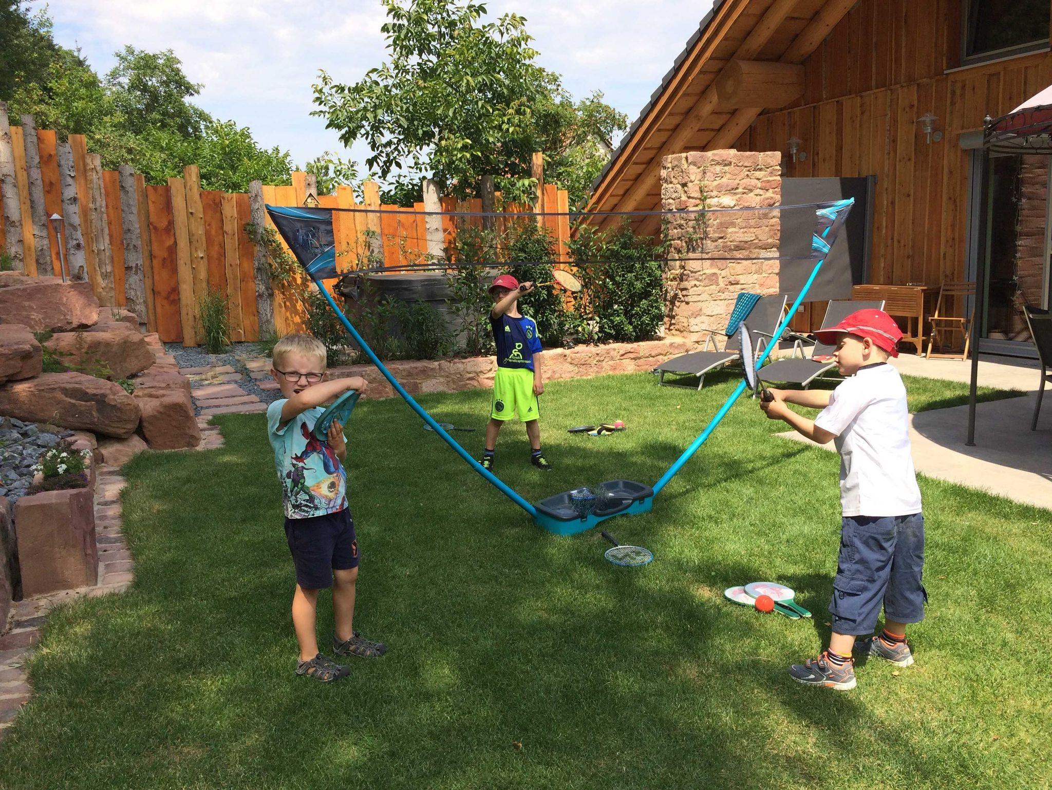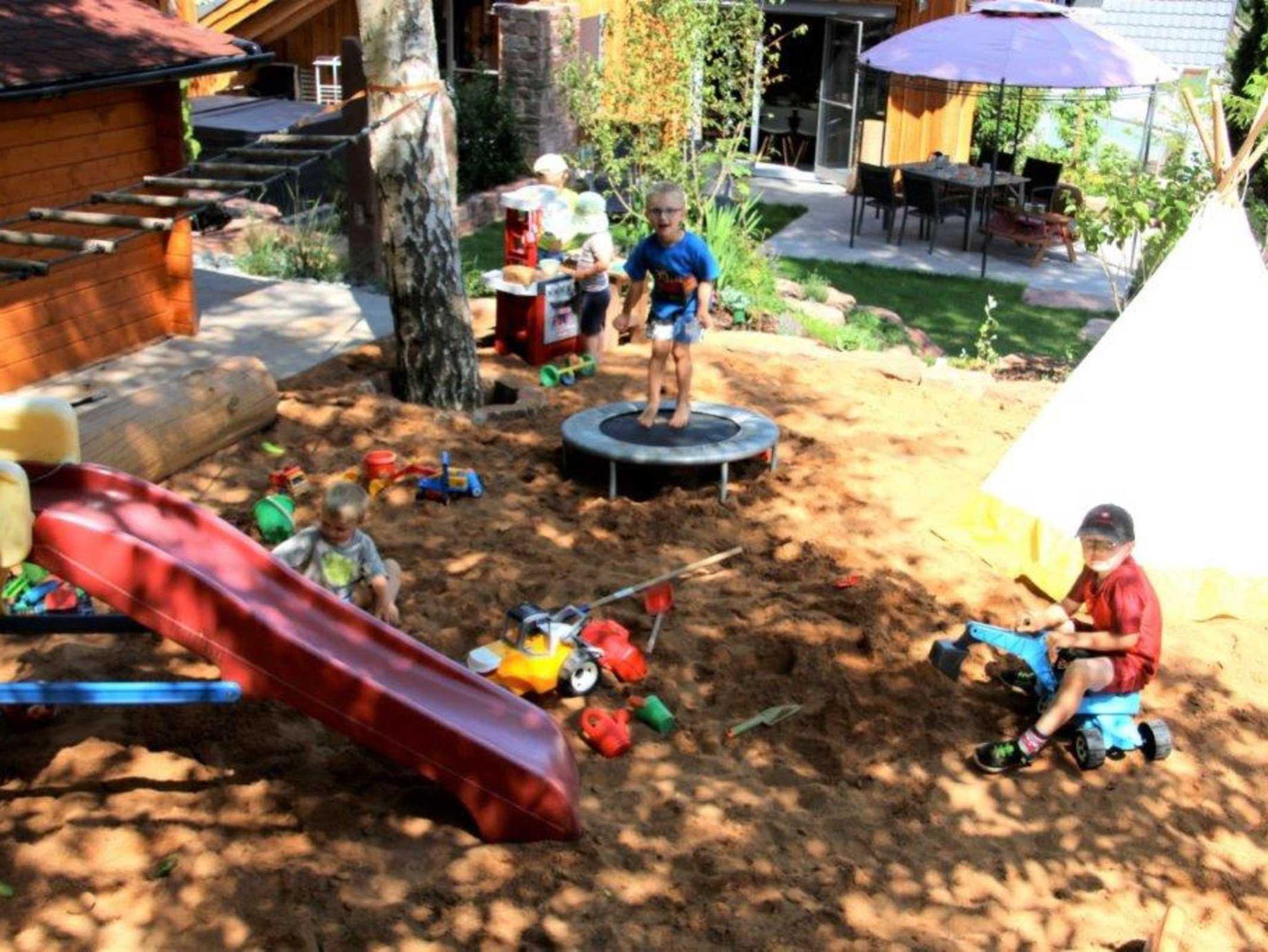 Auf dem großen Spielplatz mit Megarutsche und ganz viel Sand für die größten Burgen, die je gebaut worden sind die Kleinen und Großen direkt in Sichtweite zum Haus. Bei Regen haben die Kinder auf Wunsch einen „Indoor“ Spielplatz mit Namen „Abenteuerland“. Im Haus ist alles kindersicher und dennoch kinderfreundlich. Die große Terrasse lädt im Sommer wie auch im Winter zum Grillen ein, auf Wunsch mit Gas, Holzkohle oder ganz zünftig mit offenem Feuer. Vom offenen Whirlpool aus haben die Eltern Ihre Kinder während dem Spielen immer voll im Blick. Oder Sie können auch abends in der Blockhaus-Sauna ganz entspannt genießen, und haben Ihre Schützlinge über Babyphone am Ohr.