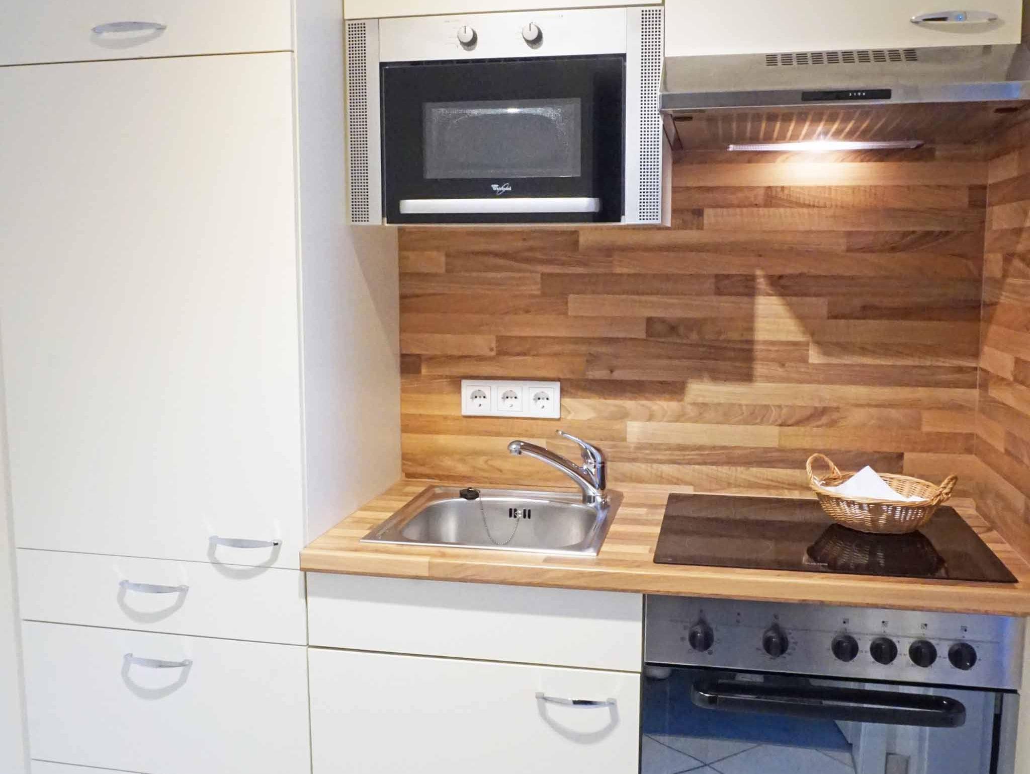 Die Küchenzeile ist vollausgestattet mit Mikrowelle, Herd mit Backofen, Kühlschrank, Kaffeemaschine, Geschirr und lädt ein zu gemütlichen Kochabenden.
