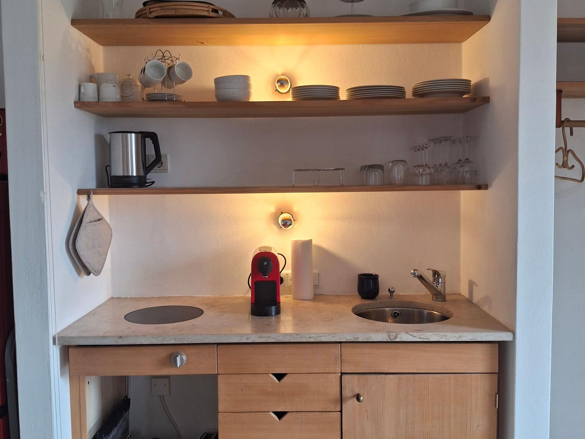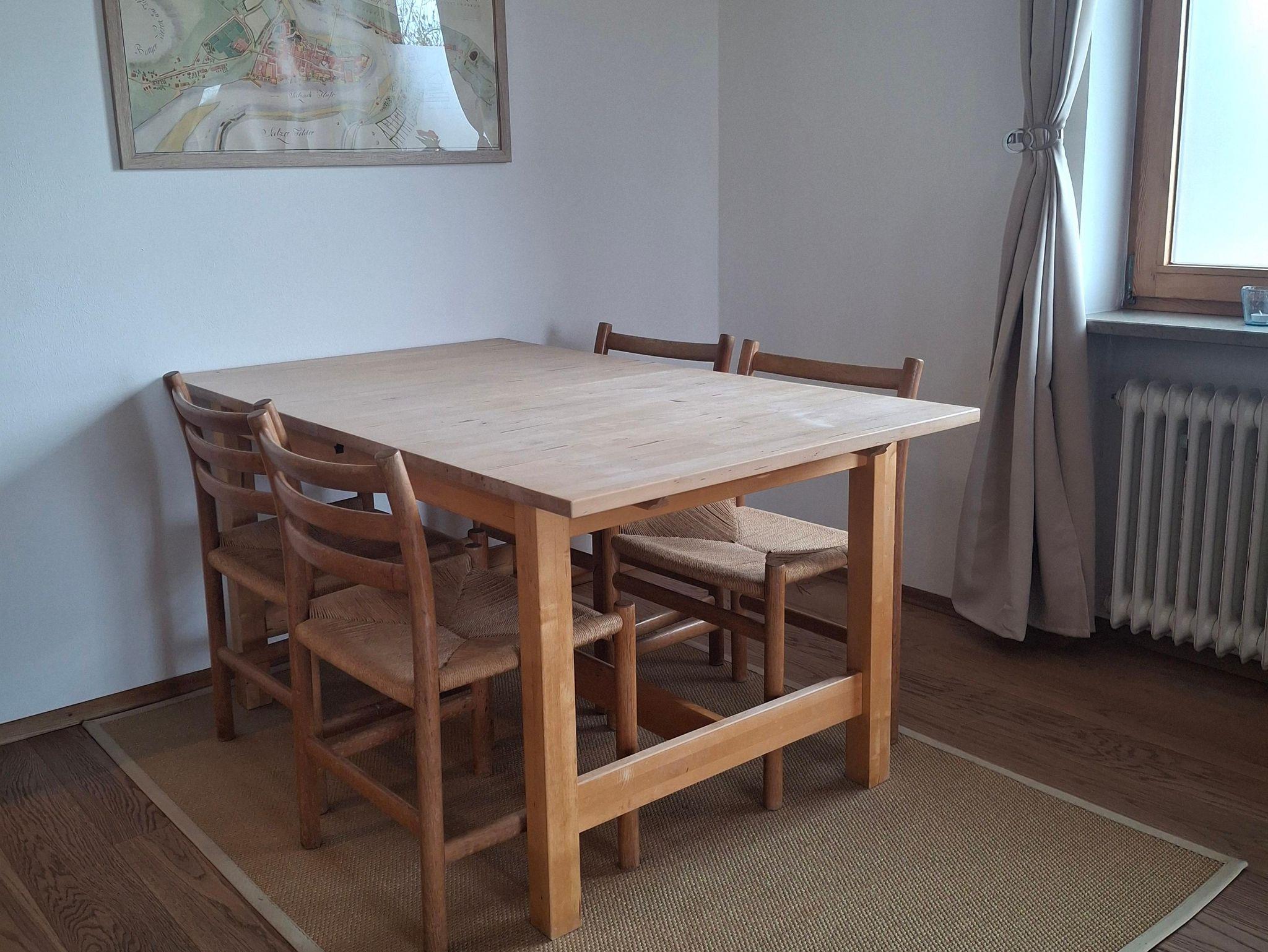 Ausgestattet mit Naturholzmöbeln strahlt die Wohnung eine warme und einladende Atmosphäre aus. Der eigene Garten lädt zum Verweilen ein – perfekt für sonnige Frühstücke oder laue Sommerabende mit Blick auf die Berge.