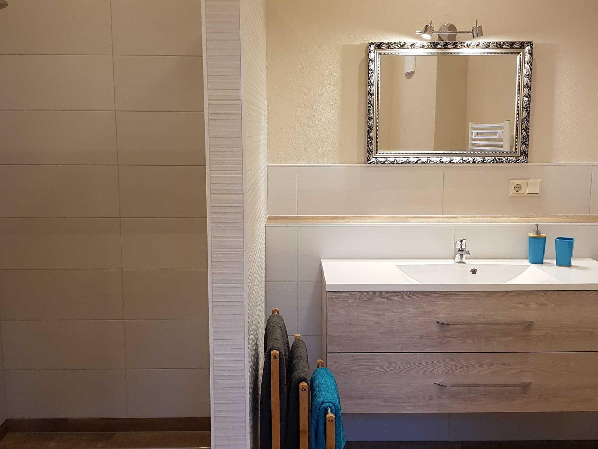 Die 2 Zimmer Ferienwohnung ist ebenerdig begehbar und mit einer offenen Küche eingerichtet. Zur Ausstattung der Küche gehört ein Kühlschrank, Ceran-Kochfelder, Geschirrspülmaschine, Wasserkocher sowie eine Kaffeemaschine. Das Schlafzimmer ist mit einem Doppelbett bestückt und 2 weitere Personen nächtigen auf dem Schlafsofa im Wohn.-Essbereich. Das großzügige Bad ist mit einer ebenerdigen Dusche und WC ausgestattet und alle Räume haben Fußbodenheizung.