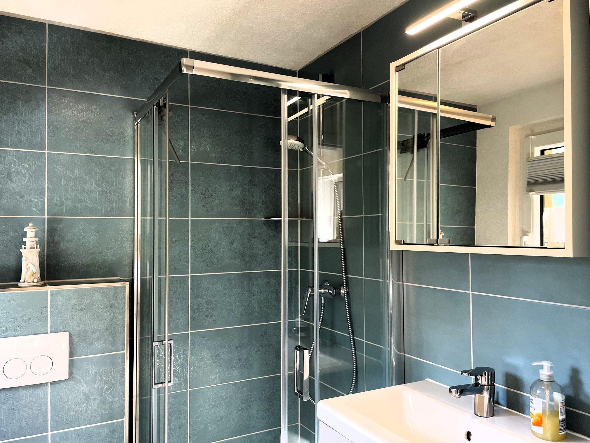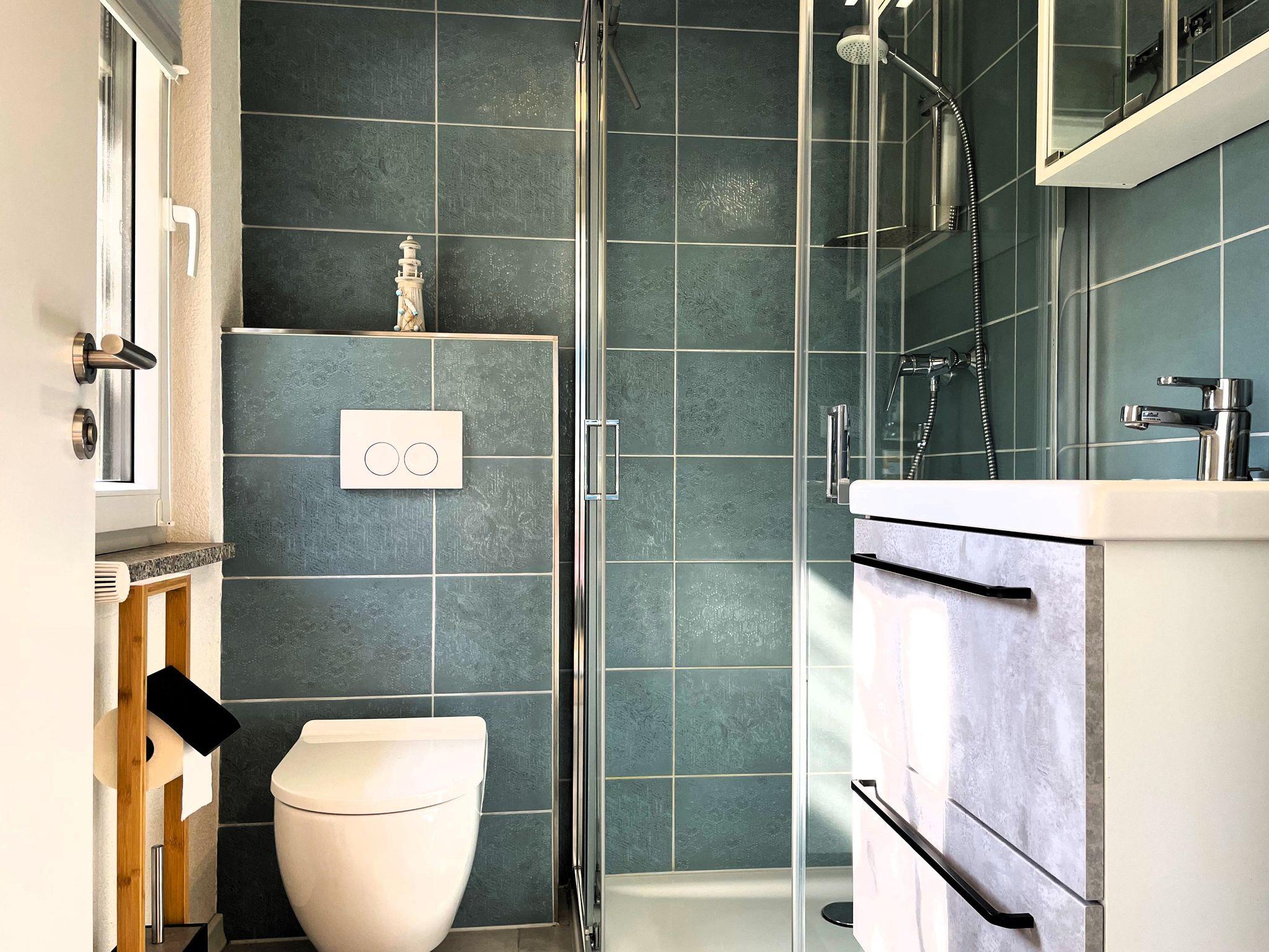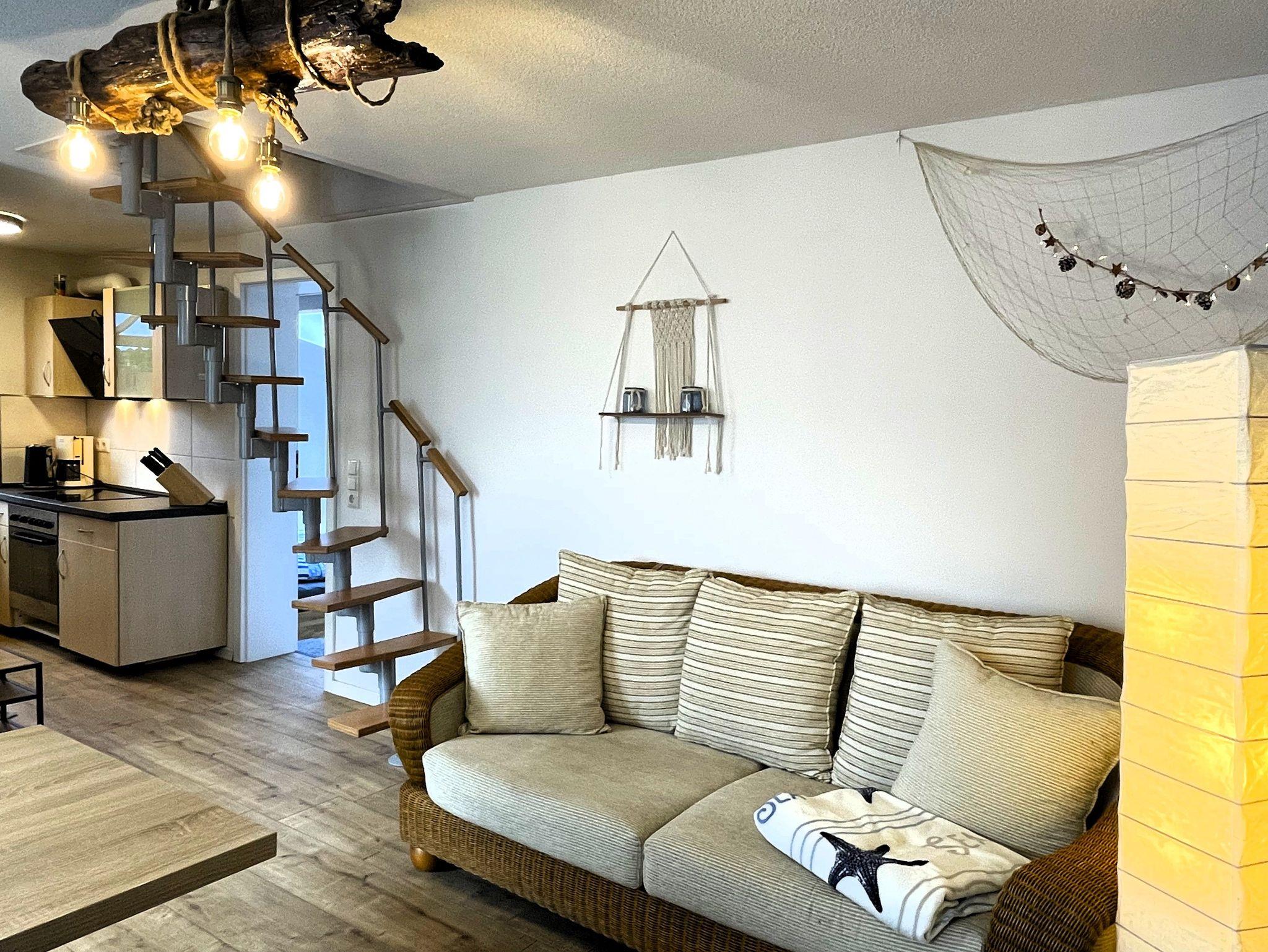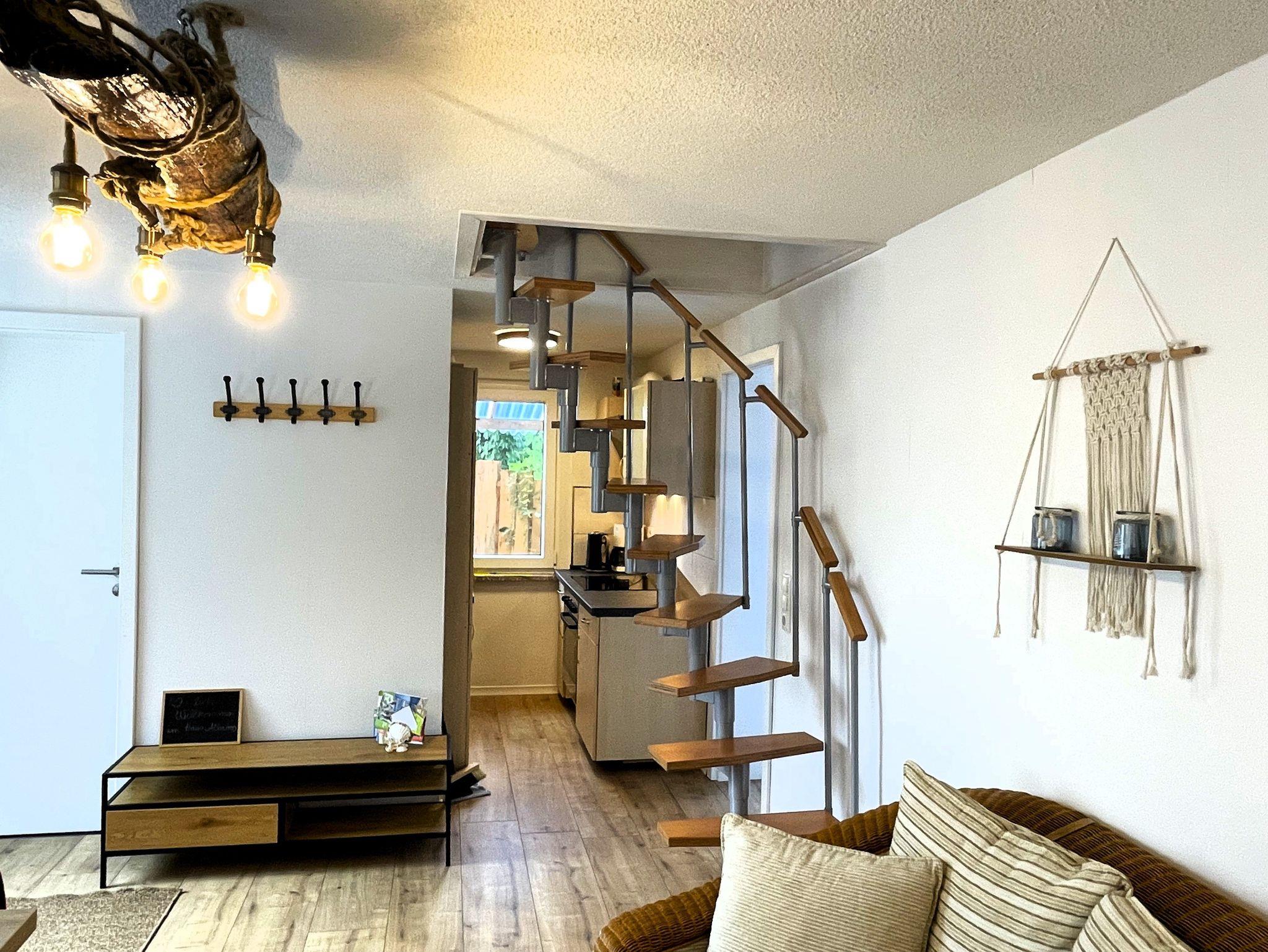 Im Erdgeschoss empfängt Sie ein gemütlicher Wohnbereich mit Sofa, Esstisch und Smart-TV. Die offene Küche ist komplett ausgestattet und lädt dazu ein, gemeinsame Mahlzeiten zuzubereiten. Im angrenzenden Schlafzimmer mit Doppelbett sorgt ein Dachfenster für einen Blick in den Sternenhimmel, während die kleine Terrasse direkt vor der Tür den perfekten Ort für den ersten Kaffee am Morgen bietet. Ein modernes Bad mit Dusche und WC rundet die Etage ab.