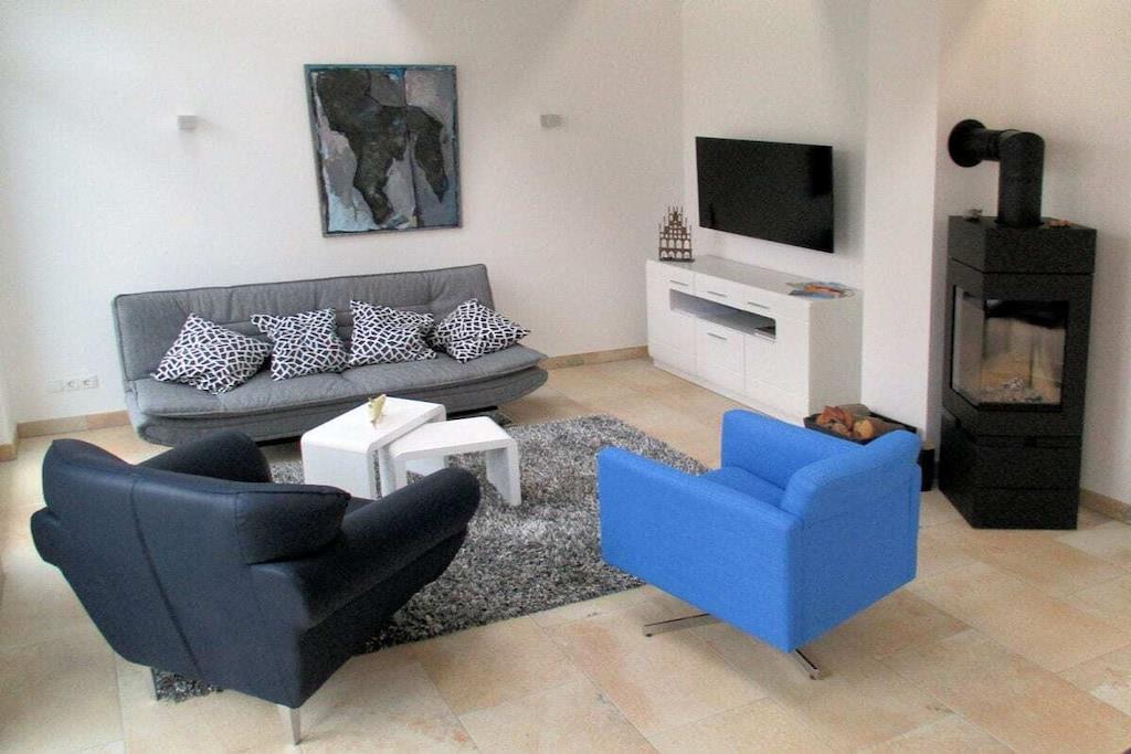 Ground floor: (Kitchen(Egg Cooker, Mixer, Tea Towels, Kitchenette, stove, hob, electric kettle, toaster, cooker, coffee machine, oven, microwave, dishwasher, fridge, freezer, heating), Living/diningroom(Sofa, TV, TV, dining table, fireplace, radio, CD player, heating), guest toilet(Mirror, toilet, washbasin, heating)) On the 1st floor: (bedroom(Bed Linen, double bed, double bed, TV, TV, heating), bedroom(Bed Linen, double bed, double bed, TV, TV, heating), Gallery bedroom(heating), bathroom(Mirror, toilet, shower, washbasin, washbasin, heating)) Hot Water, Internet Access DSL, Vacuum Cleaner, Internet access, Internet access, tumble dryer, washing machine, heating, terrace(Sun Umbrella, garden furniture), garden(Barbecue center, Lawn, garden furniture), parking, ironing board, iron, drying cabinet
