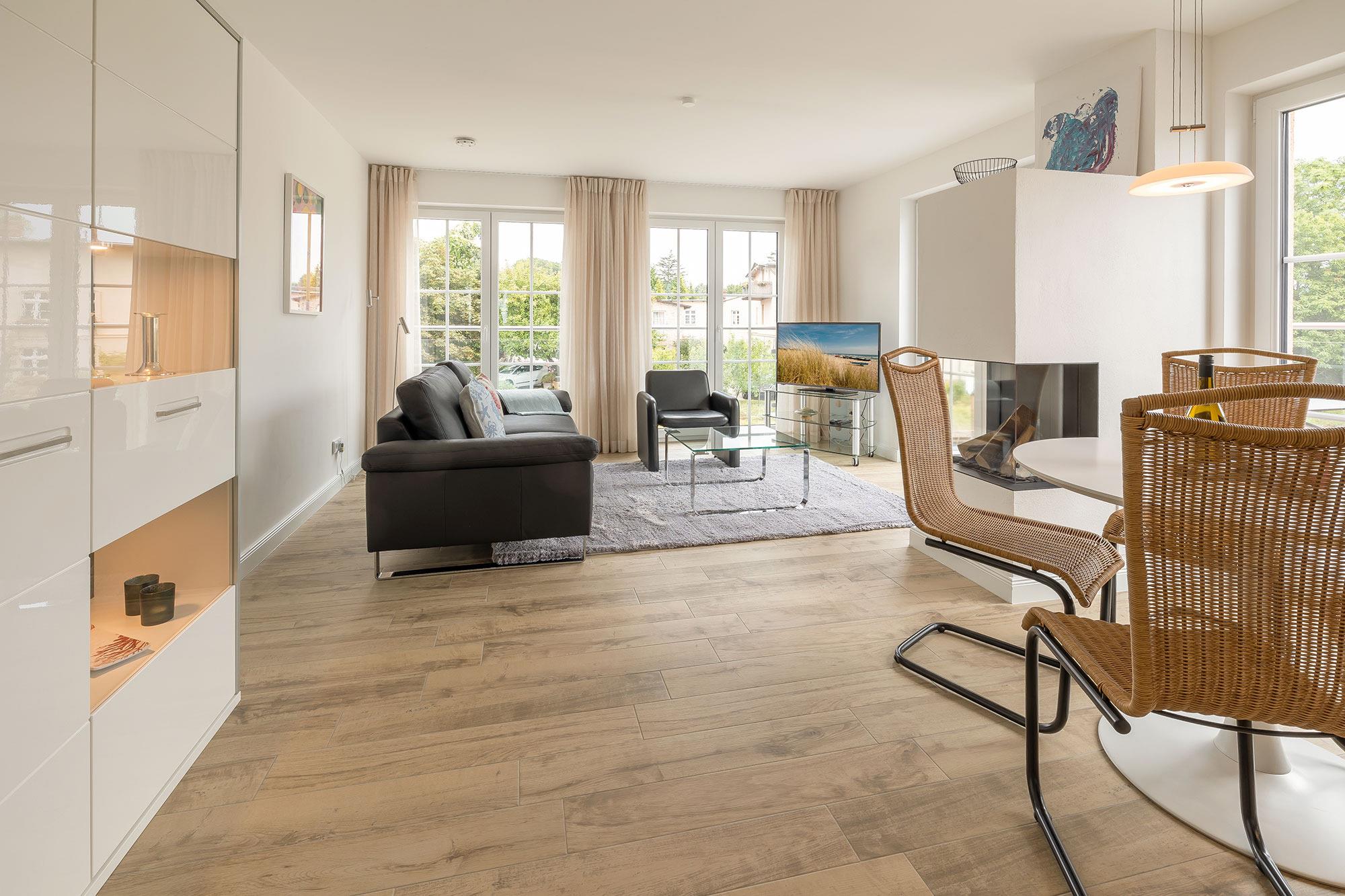 Die Wohnung selbst überzeugt, u.a., mit kostenfreien W-Lan, kostenfreien Parkplatz und ihrer hochwertigen Ausstattung. Die bekannten Seebäder Sellin, Binz und Göhren, sind nur wenige Kilometer entfernt.