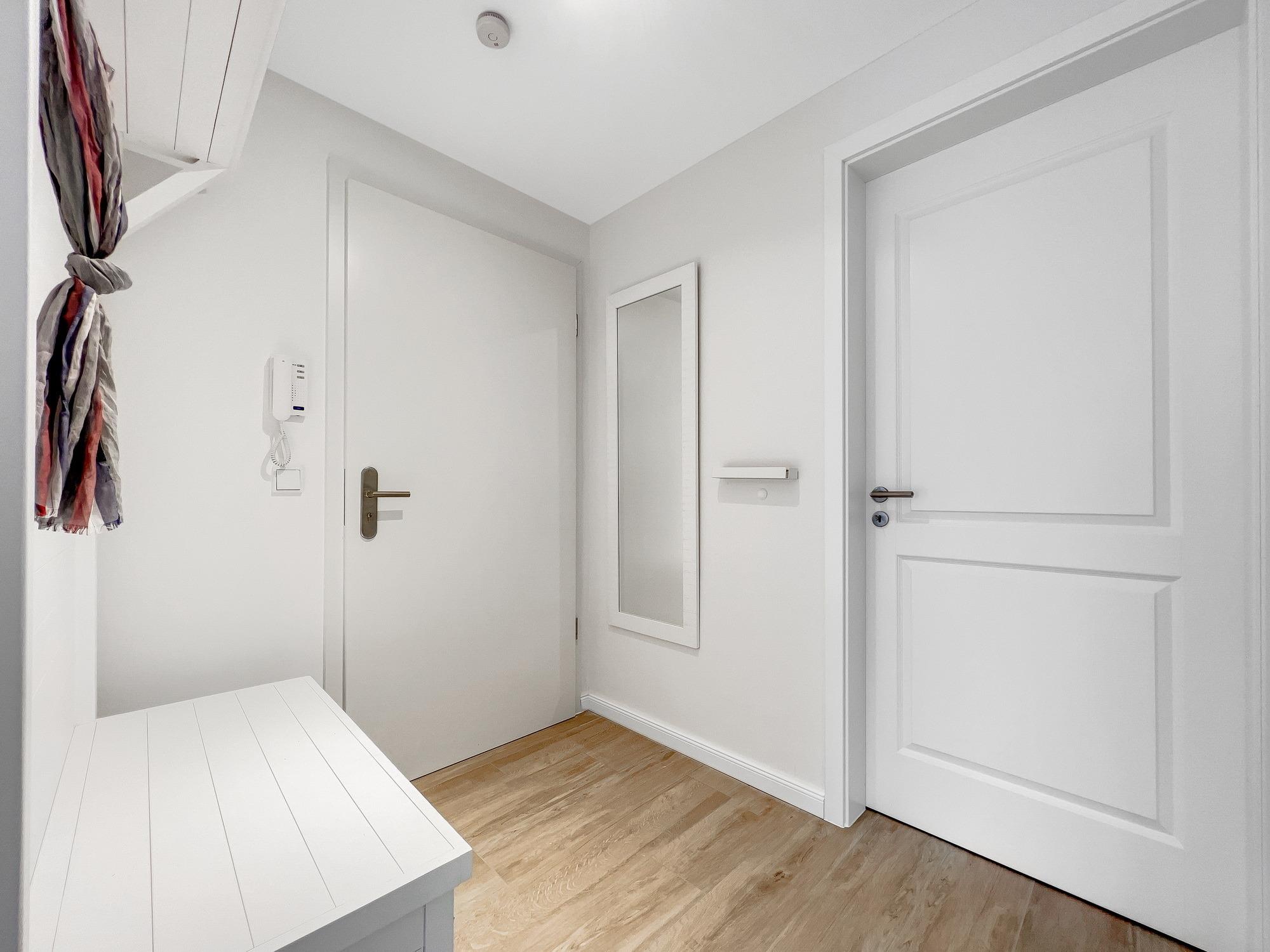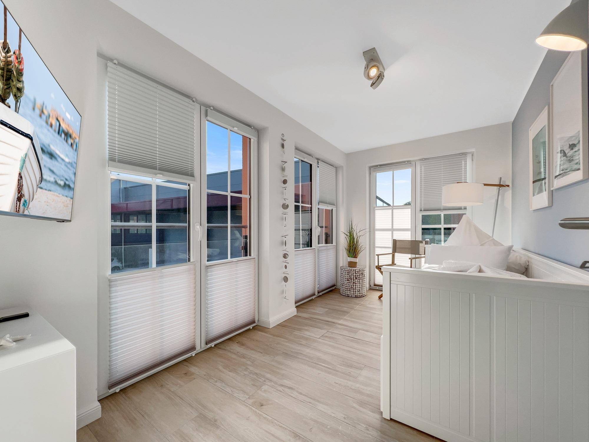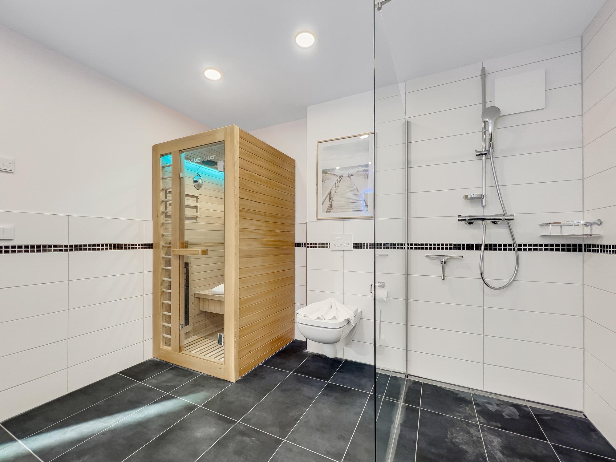 Bequem per Aufzug erreichen Sie den Eingang Ihres 77 m2 großen Feriendomizils. In der Ferienwohnung angekommen, fühlen Sie sich direkt Willkommen. Helle, lichtdurchflutete Räume und eine moderne, luxuriöse Ausstattung im maritimen Design wirken edel und angenehm zugleich. Das 2022 fertiggestellte, barrierefreie Wohnensemble befindet sich nur 100 Meter vom frisch sanierten Hafen von Lauterbach, einem Ortsteil der "Rosenstadt Putbus". Lauterbach wurde 1816 von Fürst Wilhelm Malte zu Putbus als erstes Seebad Rügens gegründet und liegt direkt am Greifswalder Bodden im Südosten der Insel Rügen. Ihr Domizil hat einen schönen Balkon, der vom Wohnzimmer und vom Schlafzimmer aus zugänglich ist. Hier können Sie die milde Abendsonne genießen und den Tag ausklingen lassen. Die Wohnung verfügt zudem über eine kleine Infrarot-Sauna für gemütliche Abende, um nicht nur bei Schmuddelwetter zu entspannen. Modernes Smart-TV in Wohnzimmer, Schlafzimmer und Gäste-/Kinderzimmer ermöglichen Ihnen, mit Ihrem Account Serien und Filme bei Netflix, Amazon Prime, Sky und vielen anderen Anbietern zu sehen. Das schnelle WLAN garantiert Ihnen, mit der Welt in Kontakt zu bleiben – wenn Sie das möchten!