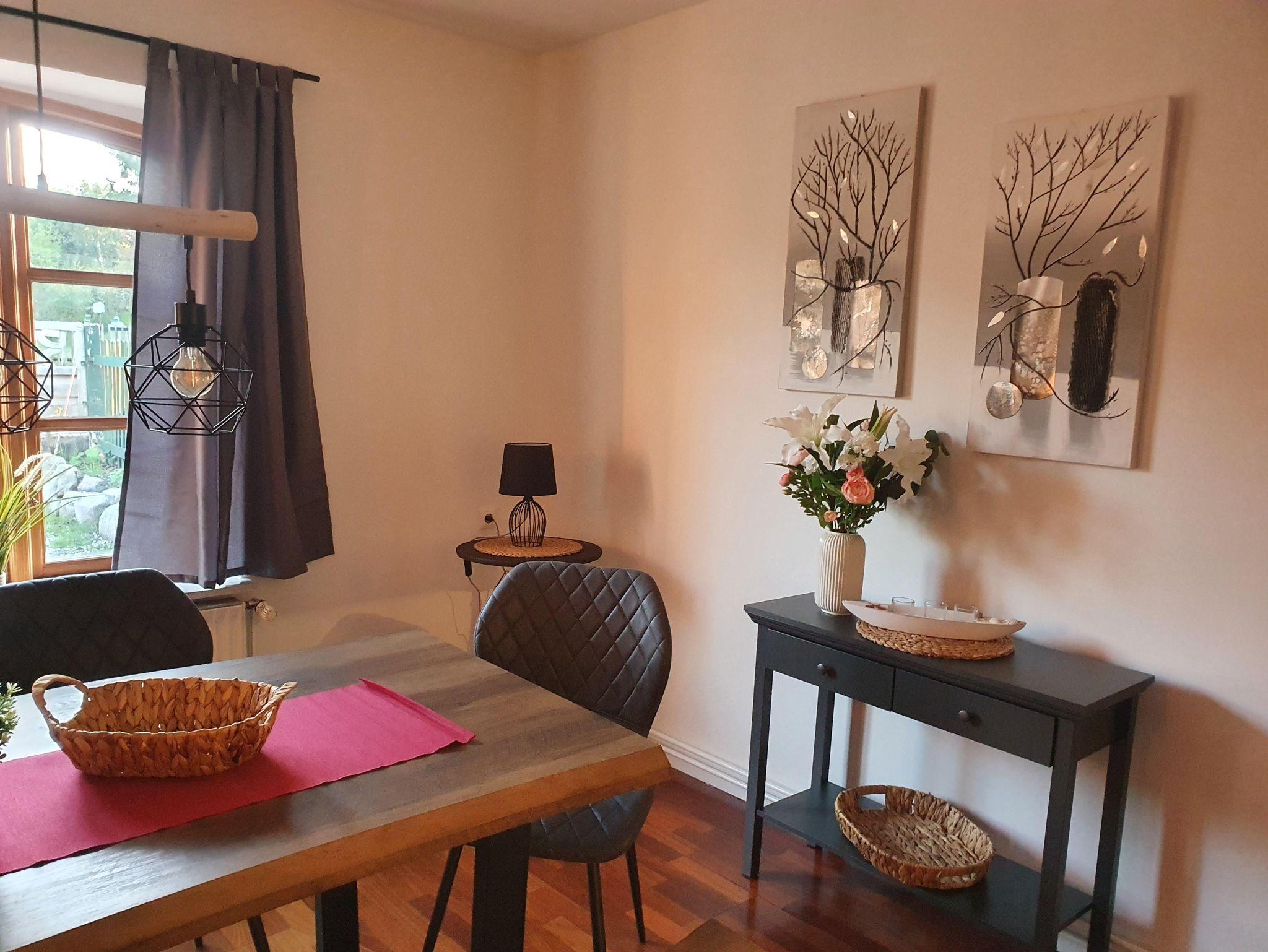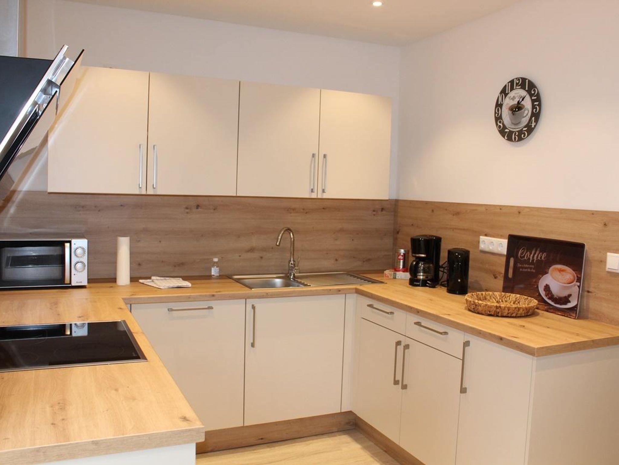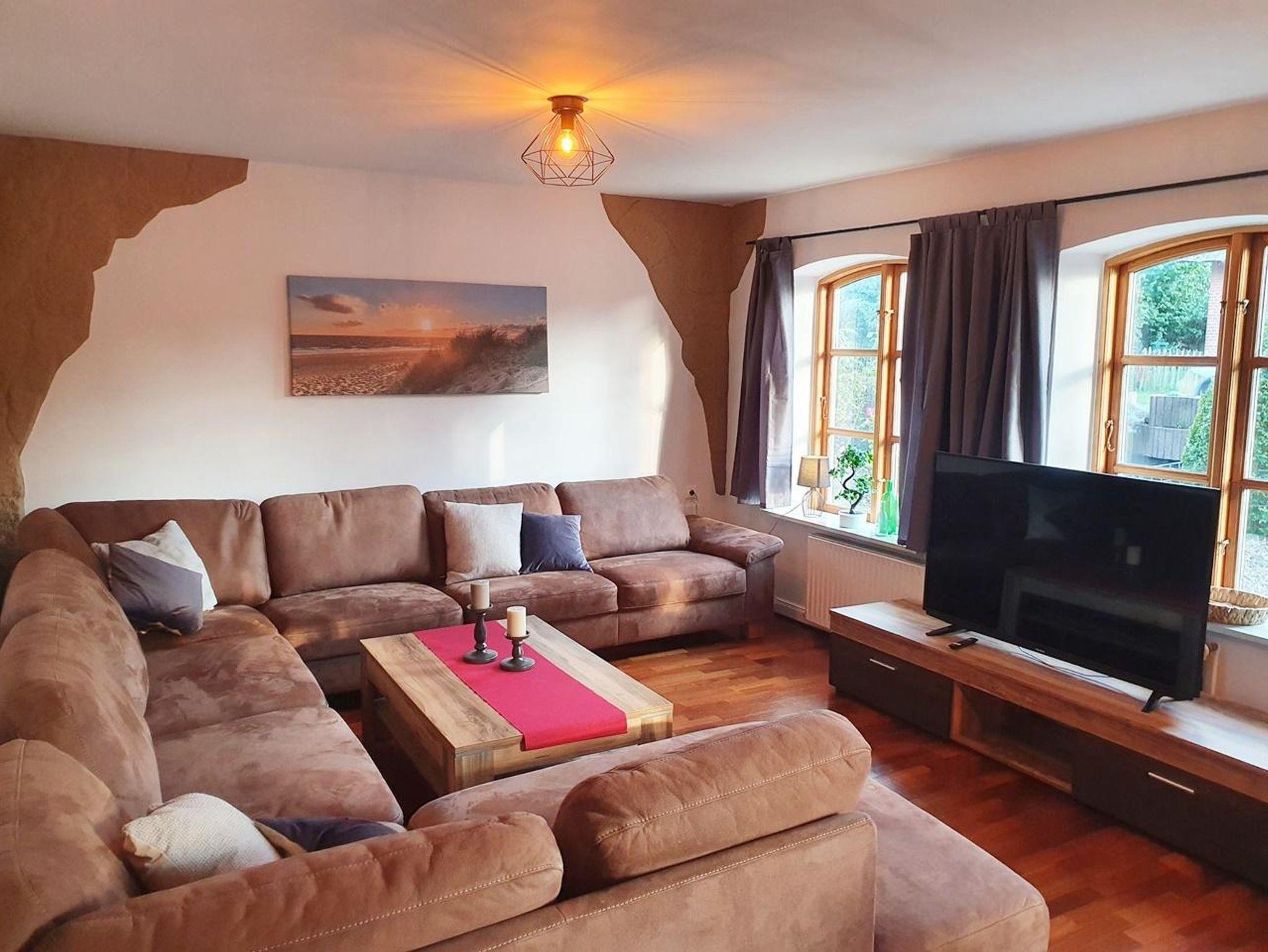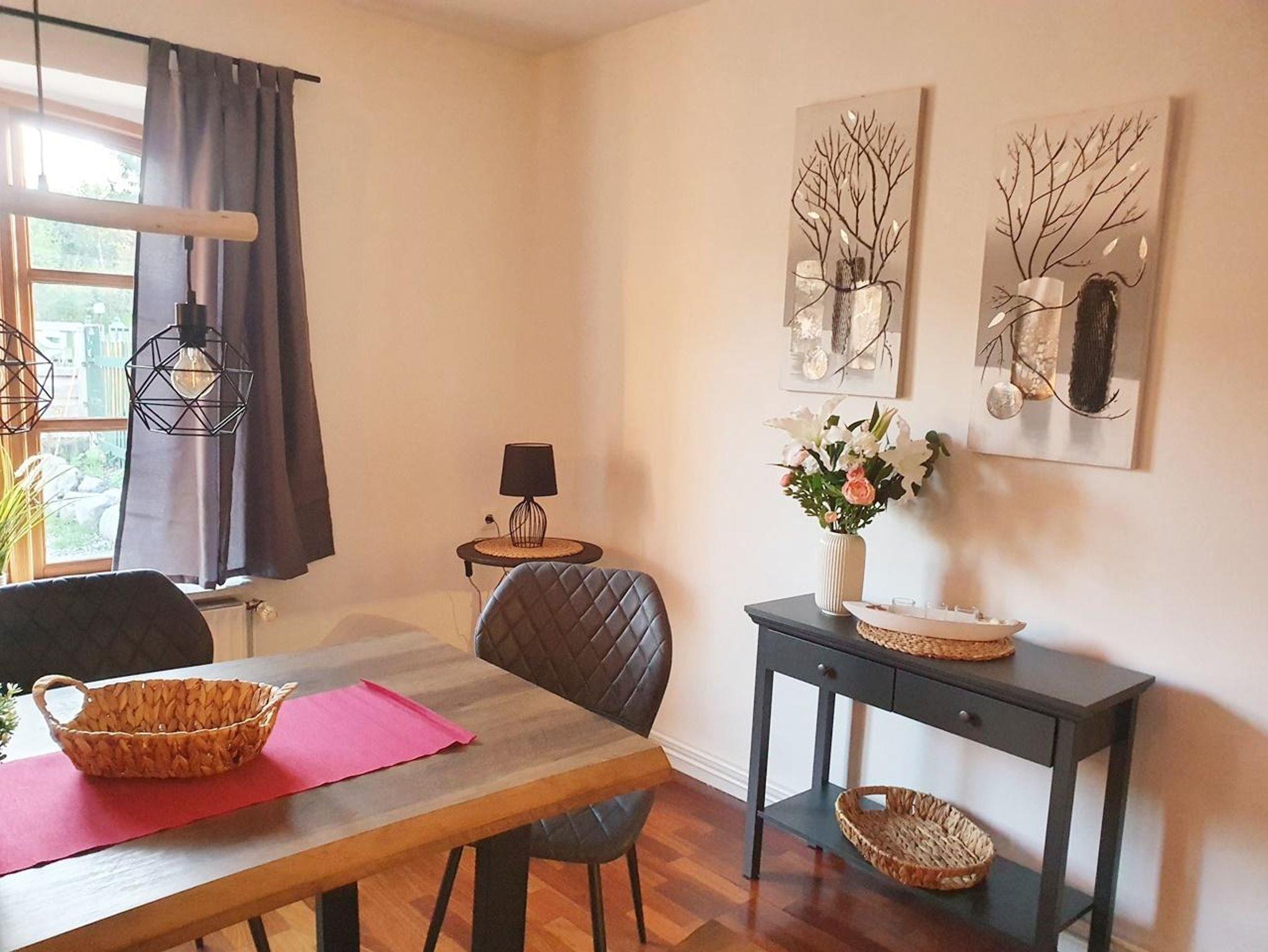Geräumiger Eingangsbereich, Wohnzimmer mit großer Sofalandschaft, Sat-TV mit Flachbildschirm (Smart TV) und einem Essbereich für bis zu 7 Personen zzgl. Kinderhochstuhl. Modernes Duschbad mit Tageslicht. Separate Küche, voll ausgestattet mit Herd, Backofen, Spülmaschine, großem Kühlschrank mit Gefrierfächern, Kaffeemaschine, Wasserkocher, Mixer und Toaster. Von der Küche direkter Zugang zur Terrasse und Hinterhof mit Naturgrundstück.