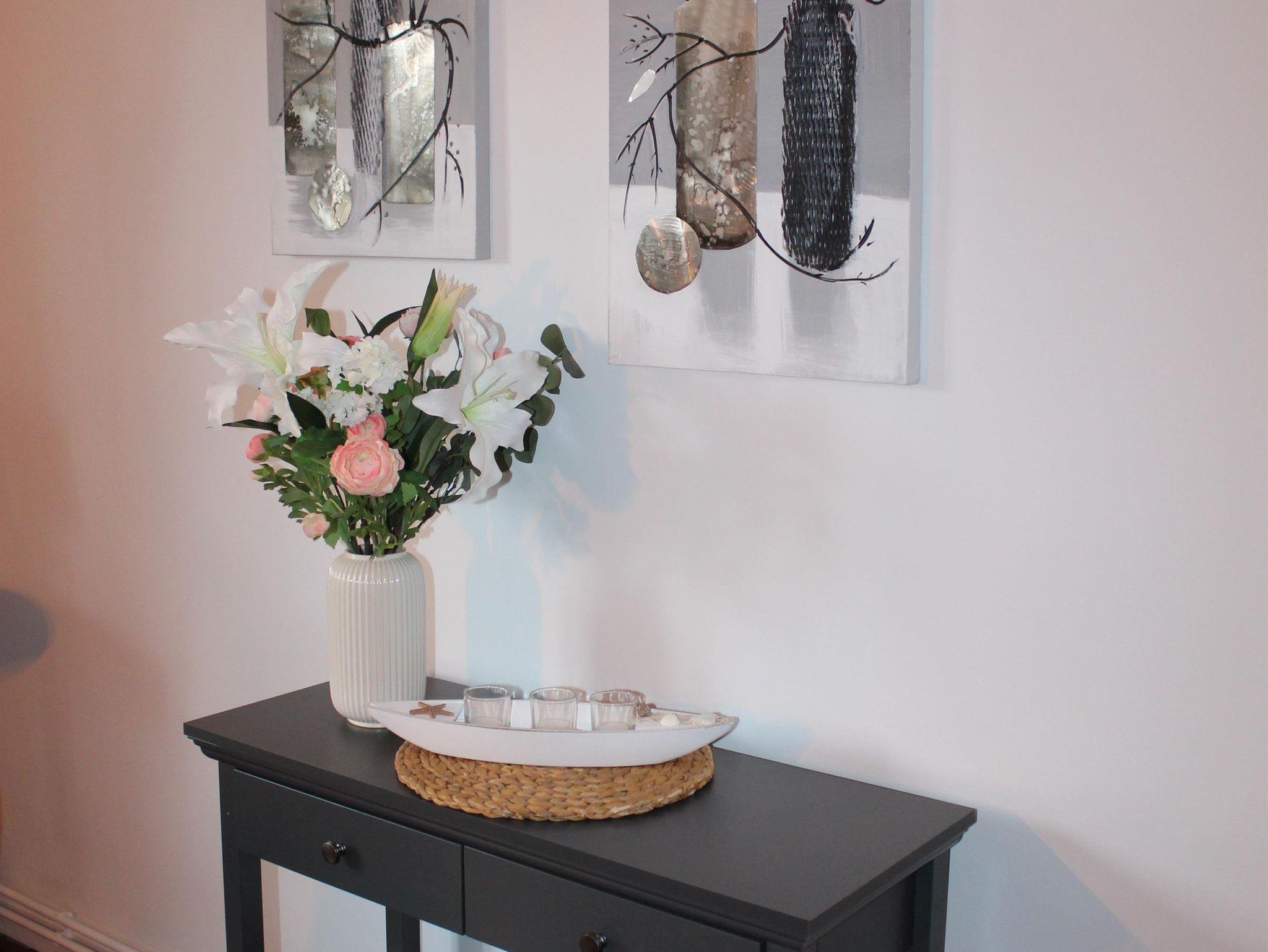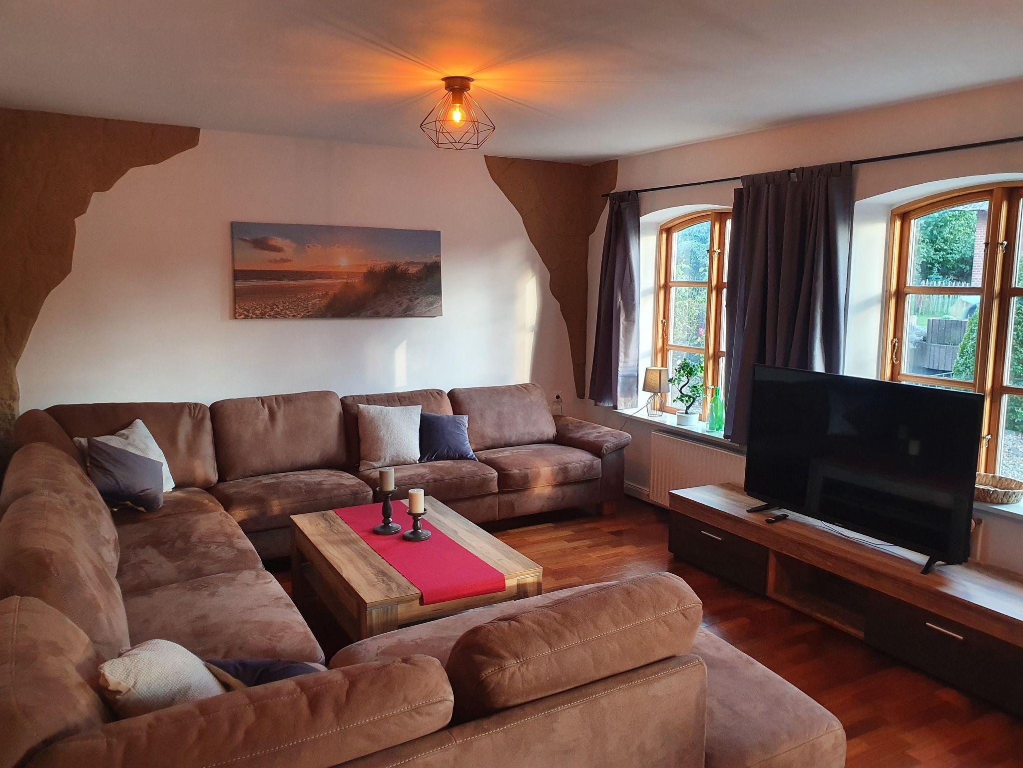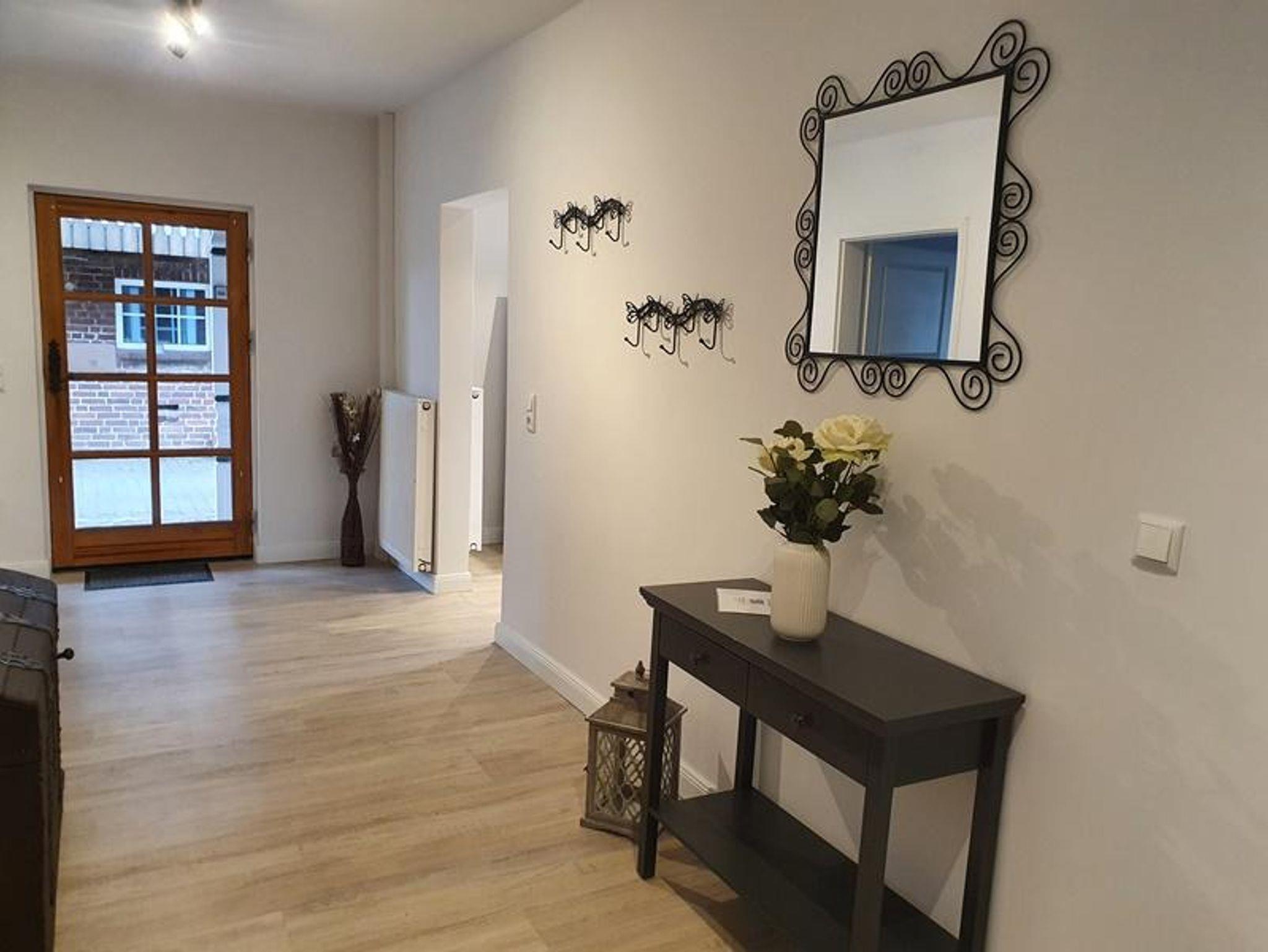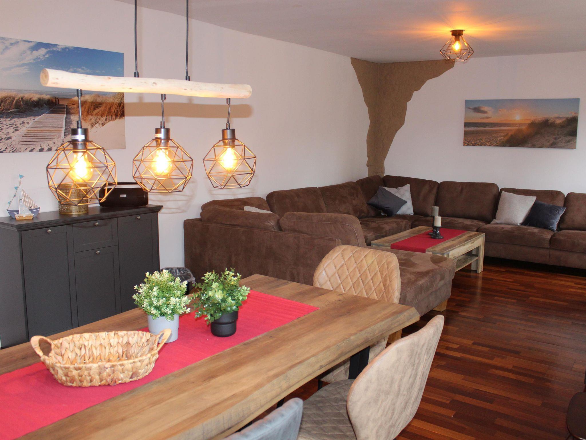 Geräumiger Eingangsbereich, Wohnzimmer mit großer Sofalandschaft, Sat-TV mit Flachbildschirm (Smart TV) und einem Essbereich für bis zu 7 Personen zzgl. Kinderhochstuhl. Modernes Duschbad mit Tageslicht. Separate Küche, voll ausgestattet mit Herd, Backofen, Spülmaschine, großem Kühlschrank mit Gefrierfächern, Kaffeemaschine, Wasserkocher, Mixer und Toaster. Von der Küche direkter Zugang zur Terrasse und Hinterhof mit Naturgrundstück.