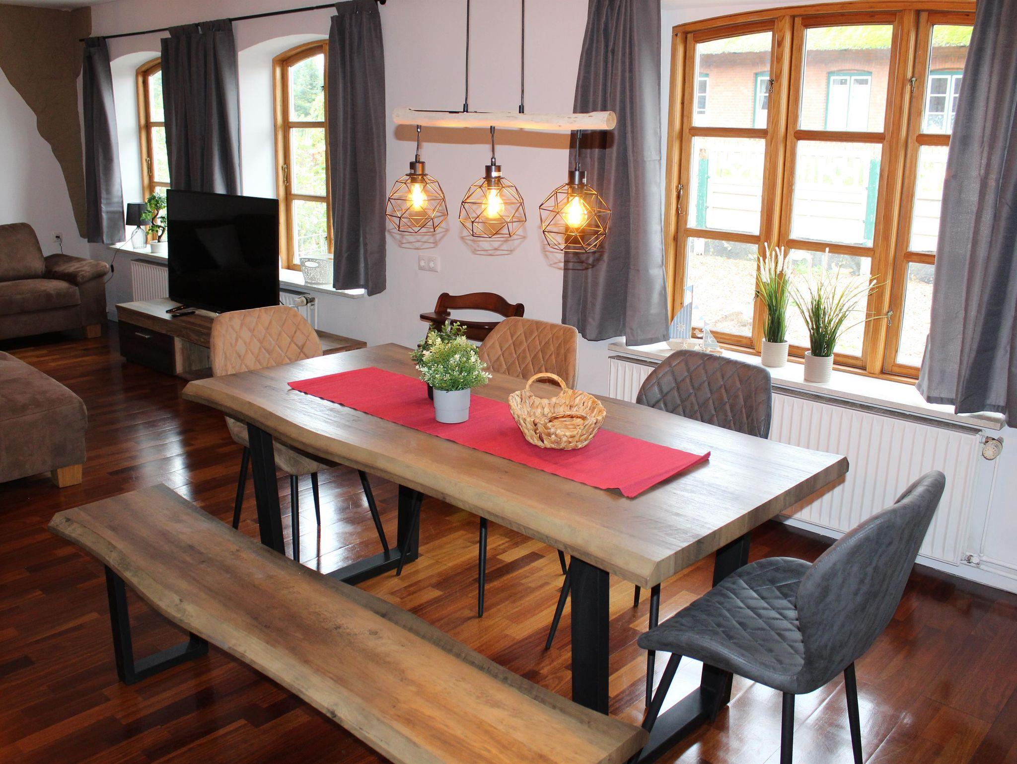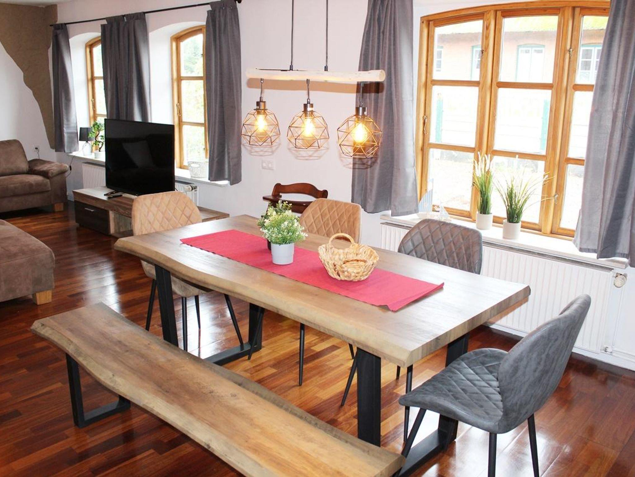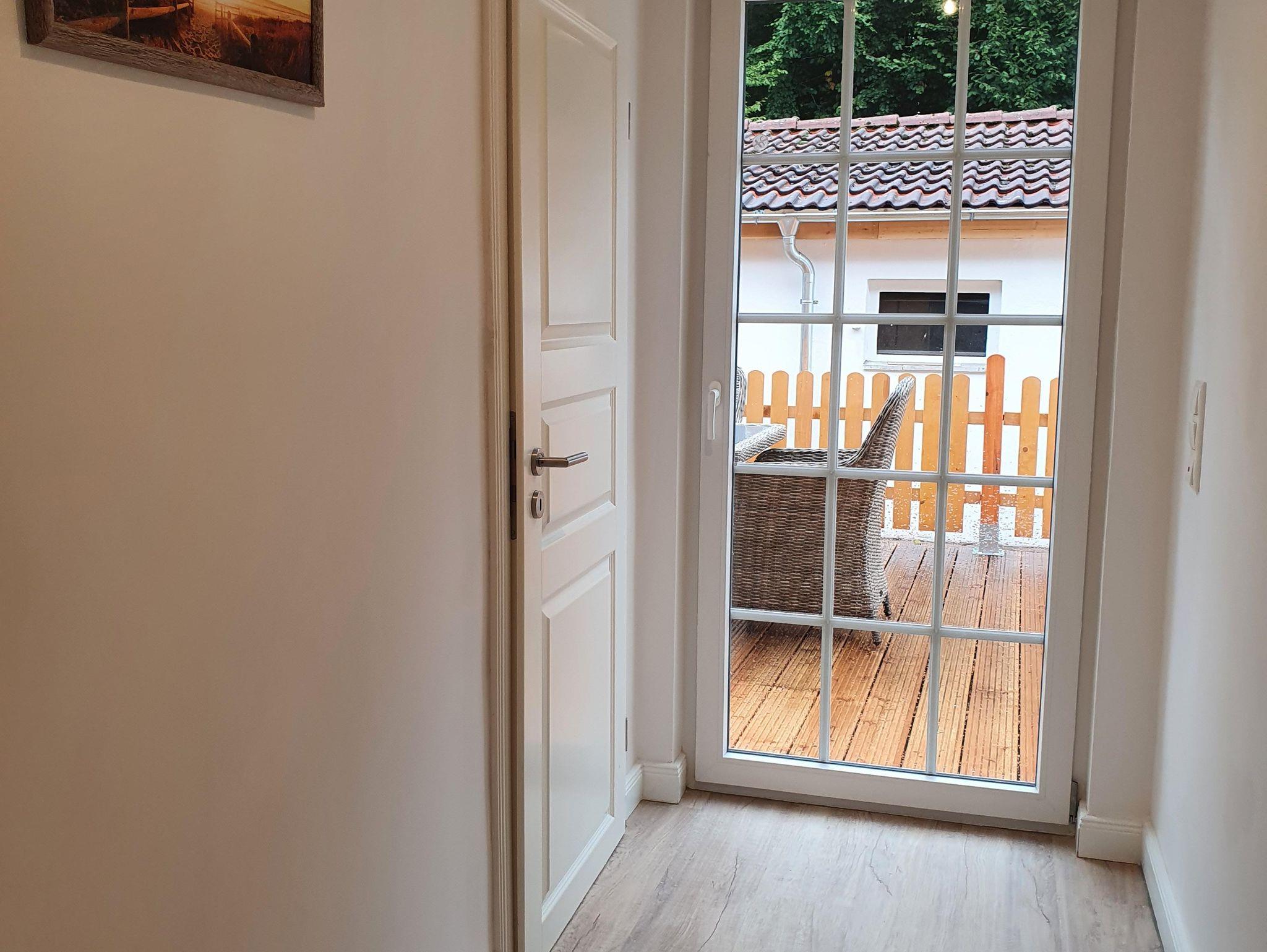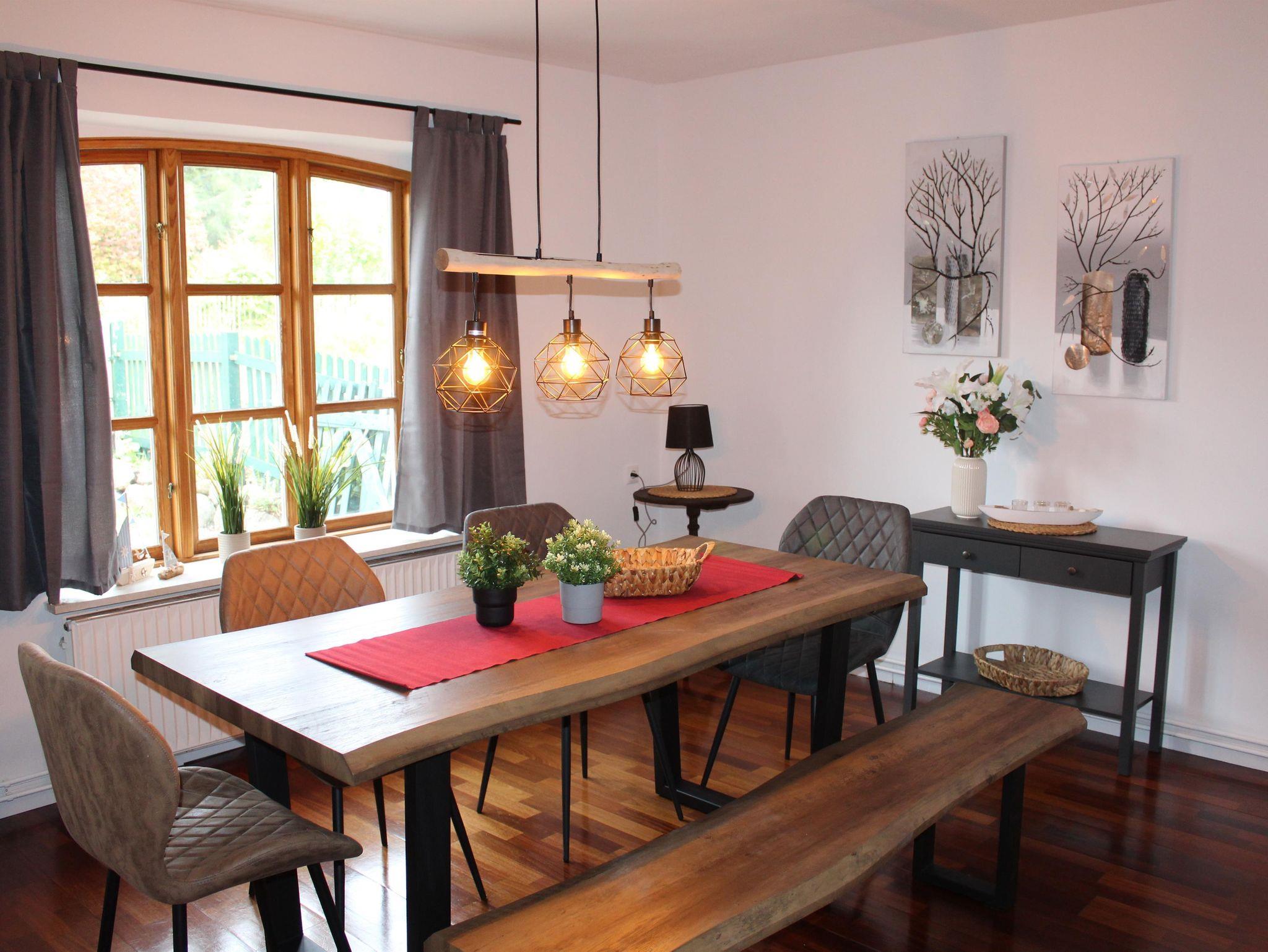 Geräumiger Eingangsbereich, Wohnzimmer mit großer Sofalandschaft, Sat-TV mit Flachbildschirm (Smart TV) und einem Essbereich für bis zu 7 Personen zzgl. Kinderhochstuhl. Modernes Duschbad mit Tageslicht. Separate Küche, voll ausgestattet mit Herd, Backofen, Spülmaschine, großem Kühlschrank mit Gefrierfächern, Kaffeemaschine, Wasserkocher, Mixer und Toaster. Von der Küche direkter Zugang zur Terrasse und Hinterhof mit Naturgrundstück.
