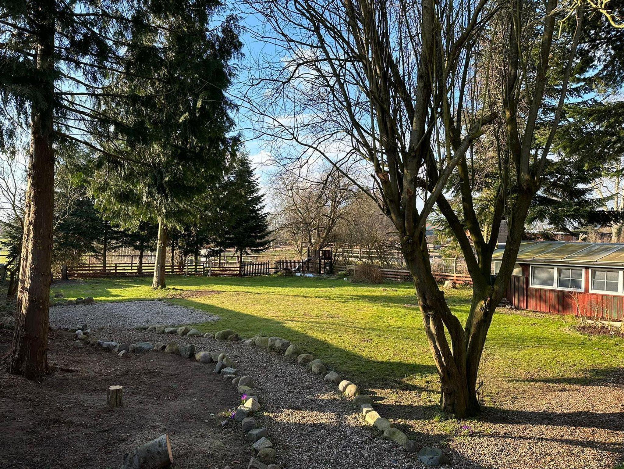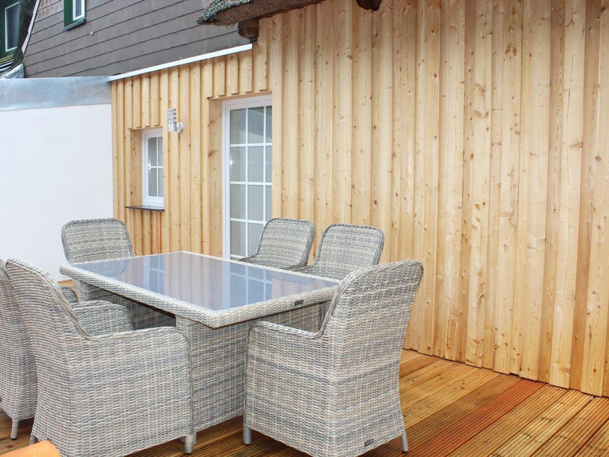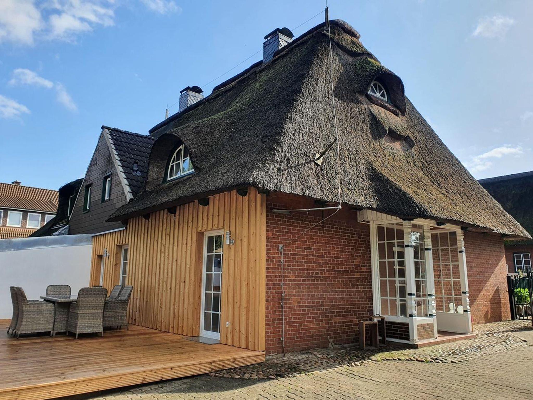 Die Terrasse verfügt über einen Tisch mit sechs Stühlen sowie zwei weiteren Stühlen bei voller Belegung. Da es sich um ein Reetdachhaus handelt und offene Feuer nicht gestattet sind, steht ein Elektrogrill für unsere Gäste bereit. Im Garten stehen Sonnenliegen, Trampolin und Kinderspielgerät für unsere Gäste zur Verfügung.