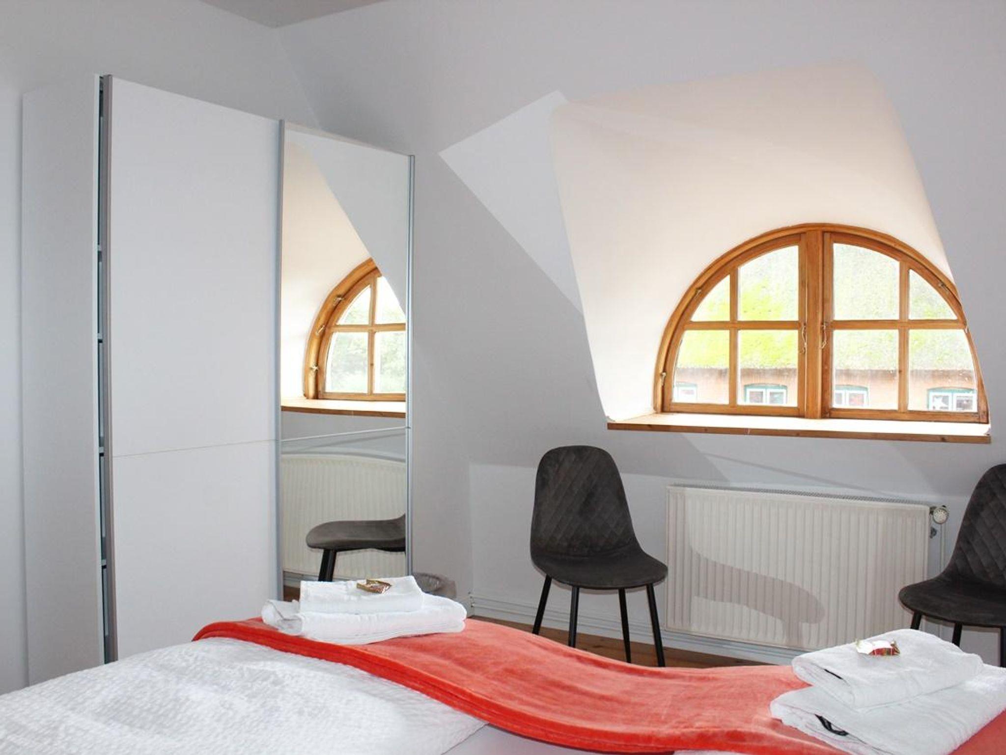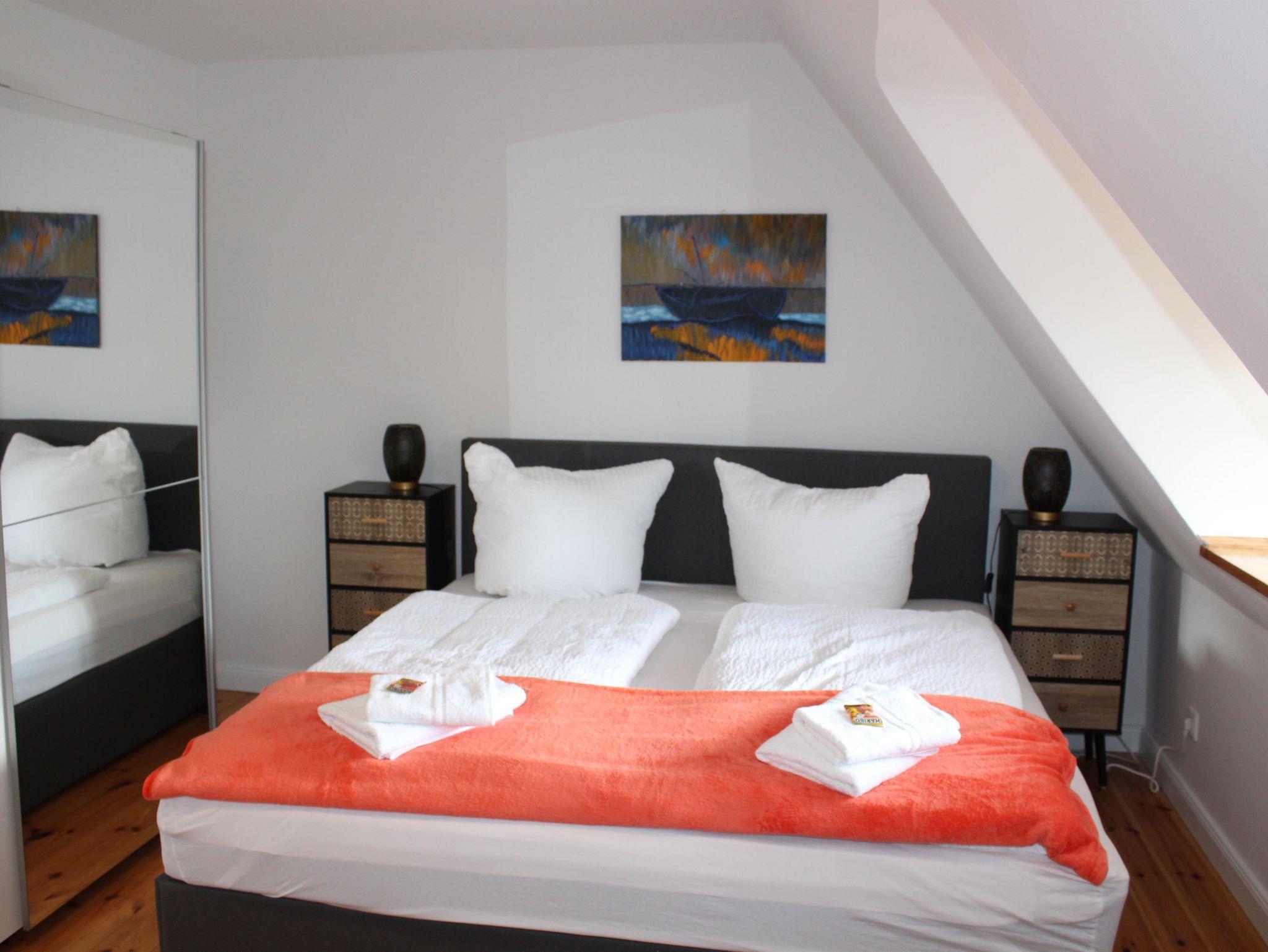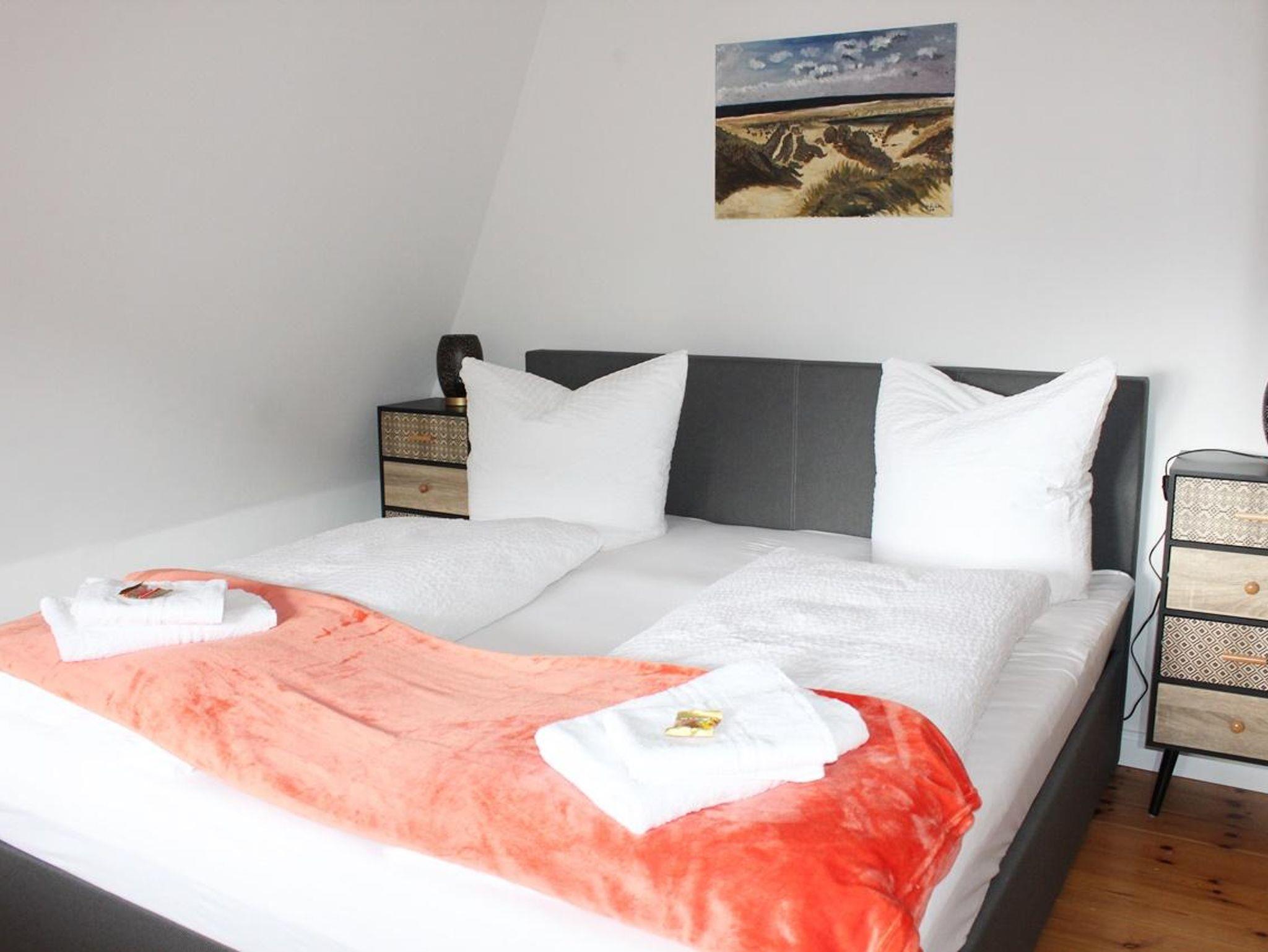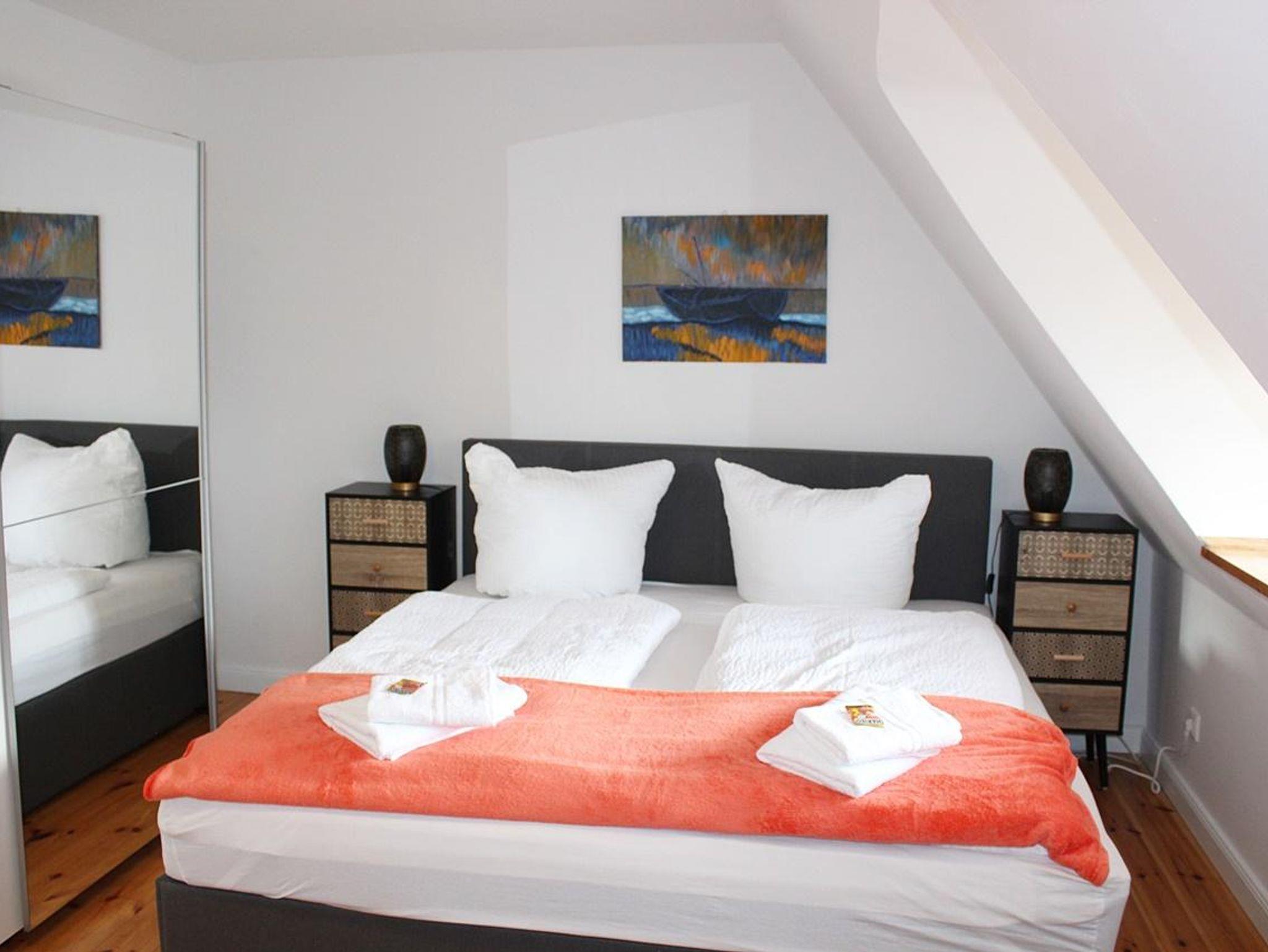 1. Schlafzimmer: Doppelbett (1,80 x 2,00m), zweitüriger Spiegelschrank, Kommode