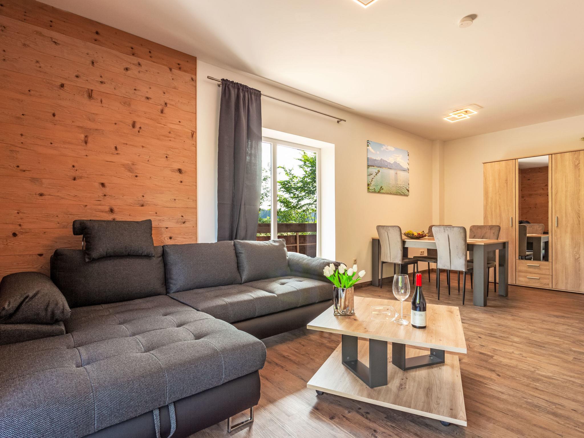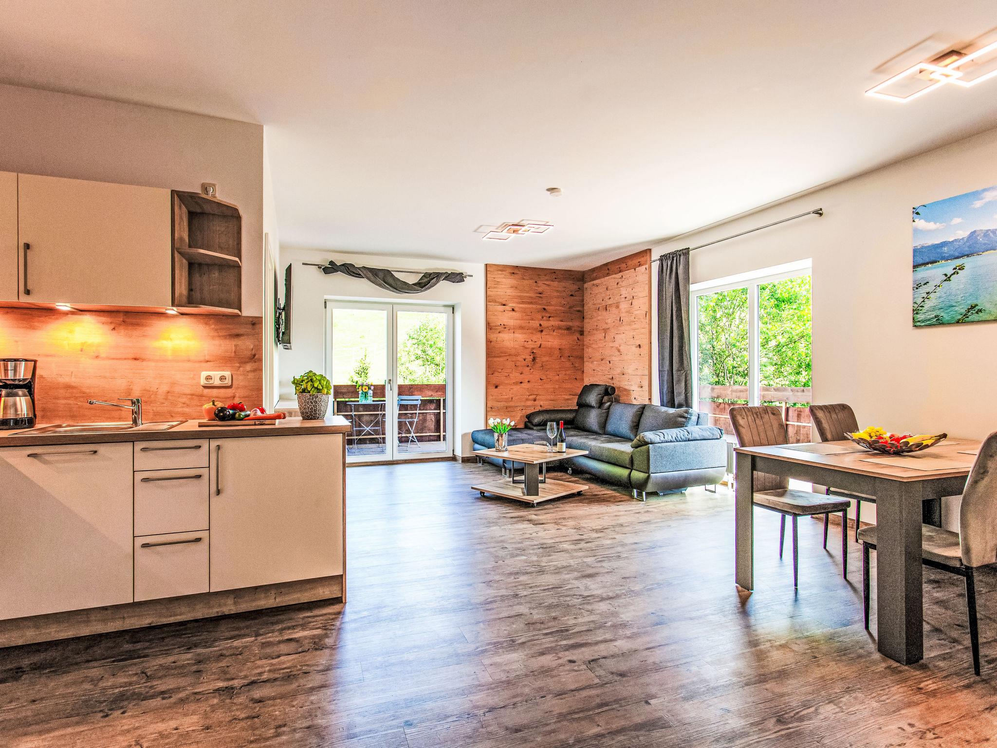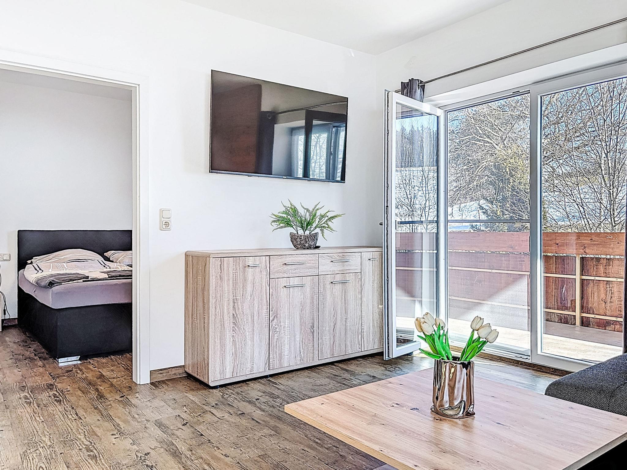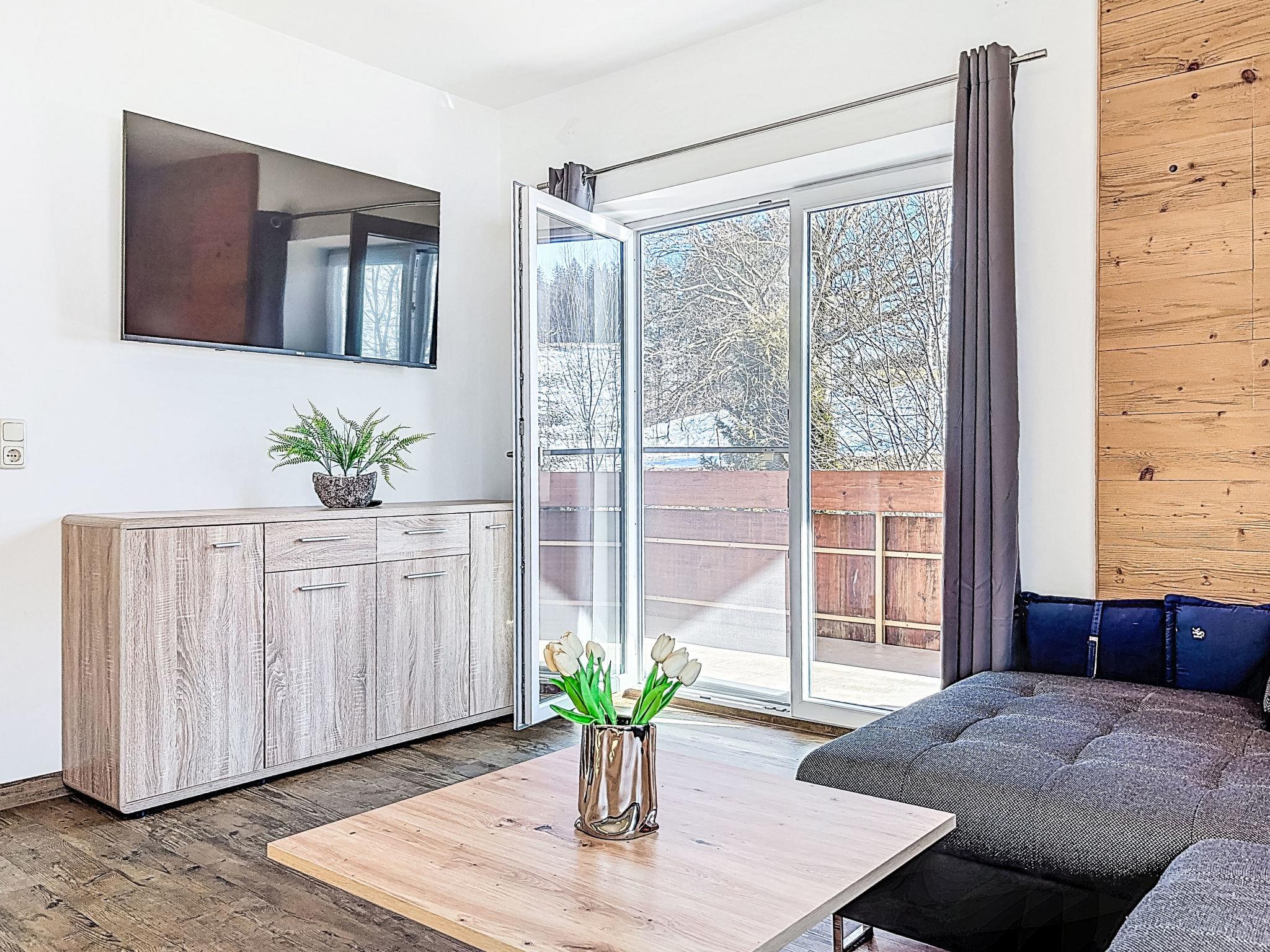 "Alpenlodge Rotspitze", 2-room apartment 60 m2, on the upper floor. Bright, modern and cosy furnishings: living/sleeping room with 1 double sofabed and cable TV (flat screen). Exit to the balcony. 1 room with 1 double bed (180 cm, length 200 cm), cable TV (flat screen). Exit to the balcony. Open kitchen (oven, dishwasher, 4 ceramic glass hob hotplates, toaster, kettle, electric coffee machine) with dining table. Shower/WC, double hand-basin. Heating. Large balcony. Balcony furniture, deck chairs (1). Beautiful view of the countryside. Facilities: hair dryer. Internet (WiFi, free). Parking (1 car), garage (extra) at the house. Please note: not suitable for children under 6 years. Non-smokers only. Maximum 2 pets/ dogs allowed. Smoke alarm.