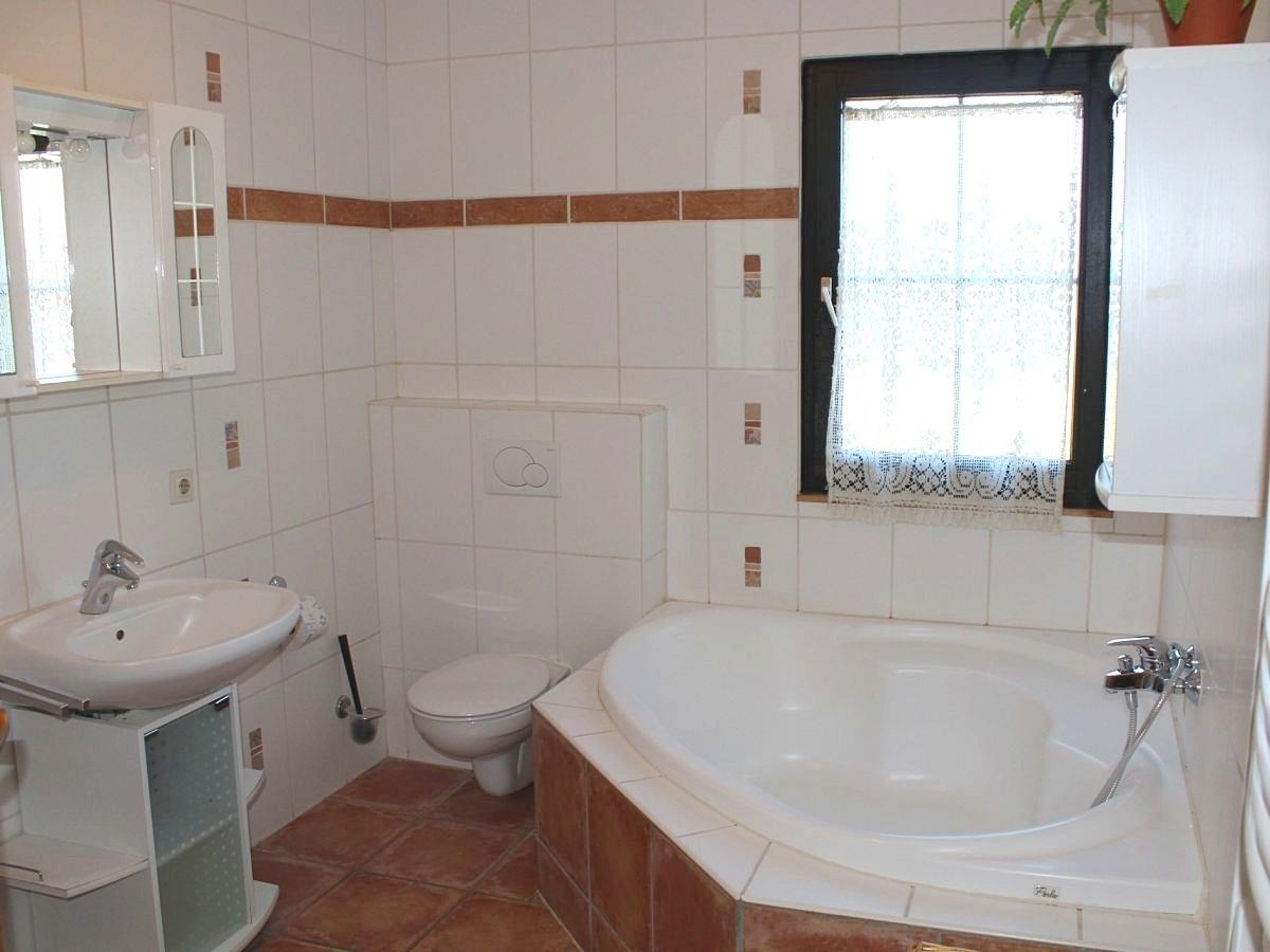 Badezimmer: Eck-Badewanne, Dusche, WC und Waschtisch, breite Badezimmertüre