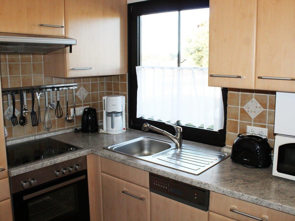 Voll ausgestattete Küche: Kühlschrank mit Gefrierfach, Herd (Ceranfeld), Dunstabzug, Geschirrspüler, Backofen, Wasserkocher, Toaster, Kaffeemaschine, Besteck, Geschirr, Gläser, Töpfe und alle gebräuchlichen Küchenutensilien.
