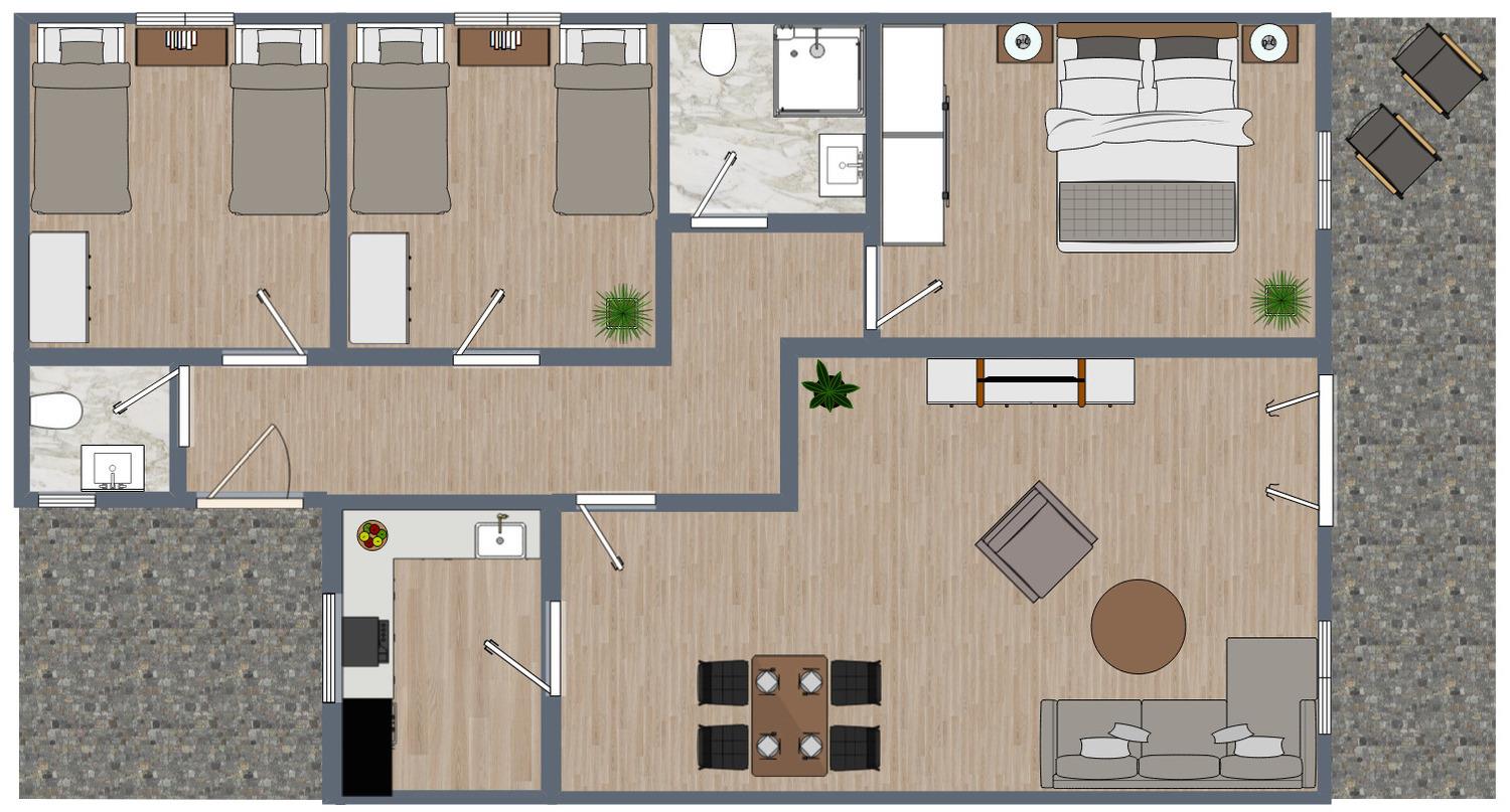 Das hell und freundlich eingerichtete Wohnzimmer lädt ein, sich wohl zu fühlen. Die große Sitzgruppe bietet Platz für alle Gäste. Flachbildfernseher und Radio/Musikanlage gehören ebenfalls zur Ausstattung dieses Hauses. Vom Wohnzimmer aus gelangen Sie direkt auf Ihre Terrasse. Grillen mit Ihrem eigenen Grill ist gestattet. Der direkt angrenzende Essbereich bietet Platz für Ihre gemeinsamen Mahlzeiten und gemütliche Abende.