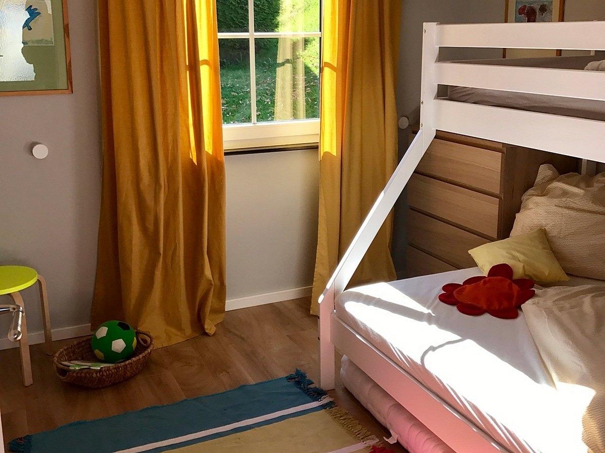 Im zweiten Kinderzimmer (Bärchen-Höhle) mit Stockbett lädt die große untere Matratze (140 x 200 m, oben 90 x200 m) bestens zum Kuscheln mit Mama und Papa ein. Auch hier finden Erwachsene genügend Platz.