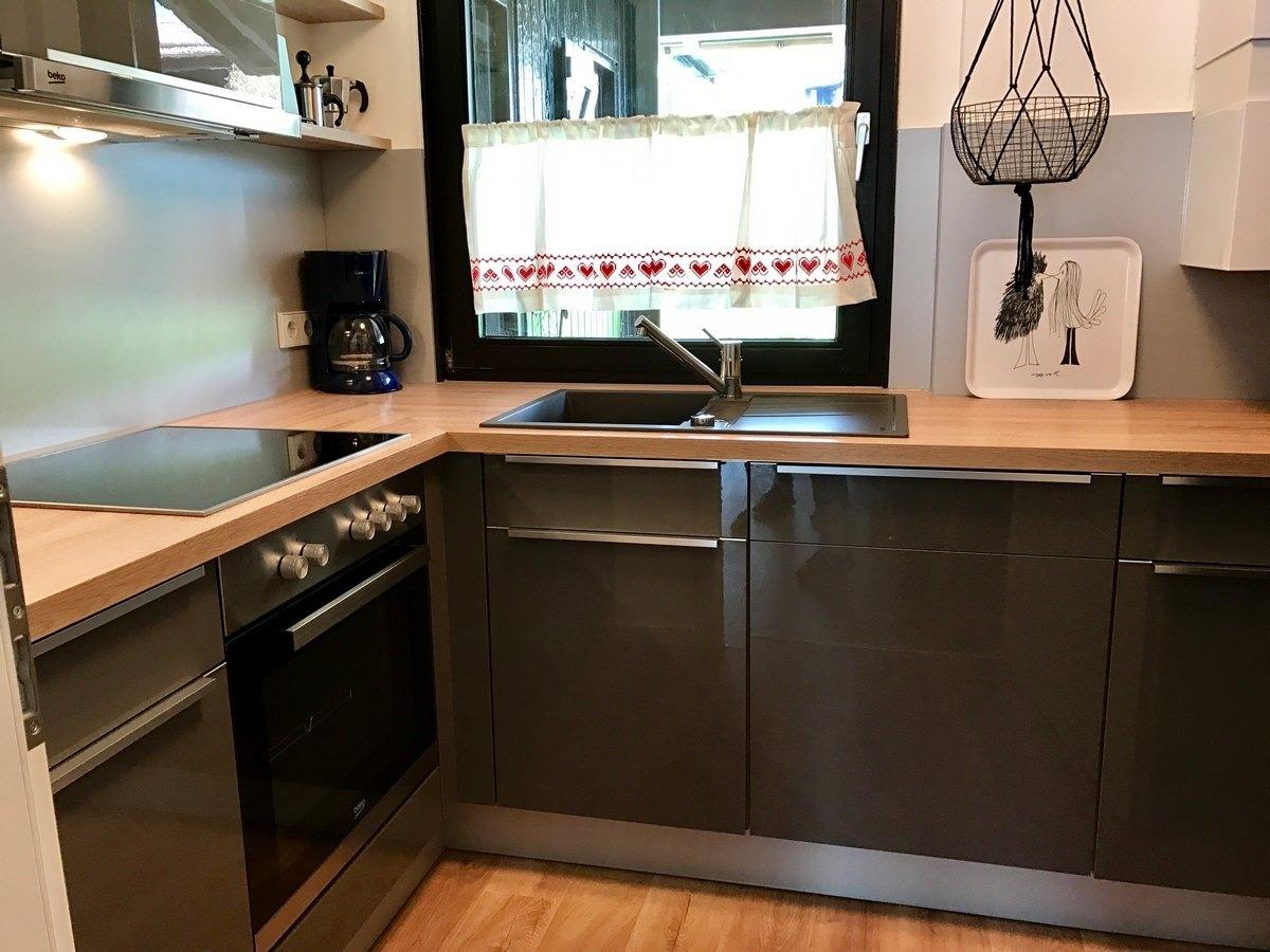 Die voll ausgestattete Einbau-Küche mit Ceran-Kochfeld, Backofen, großer Spülmaschine, Kühlschrank mit Gefrierfach, Kaffeemaschine, Wasserkocher, Toaster und Mikrowelle lädt dank großzügiger Ausstattung zum Kochen ein.