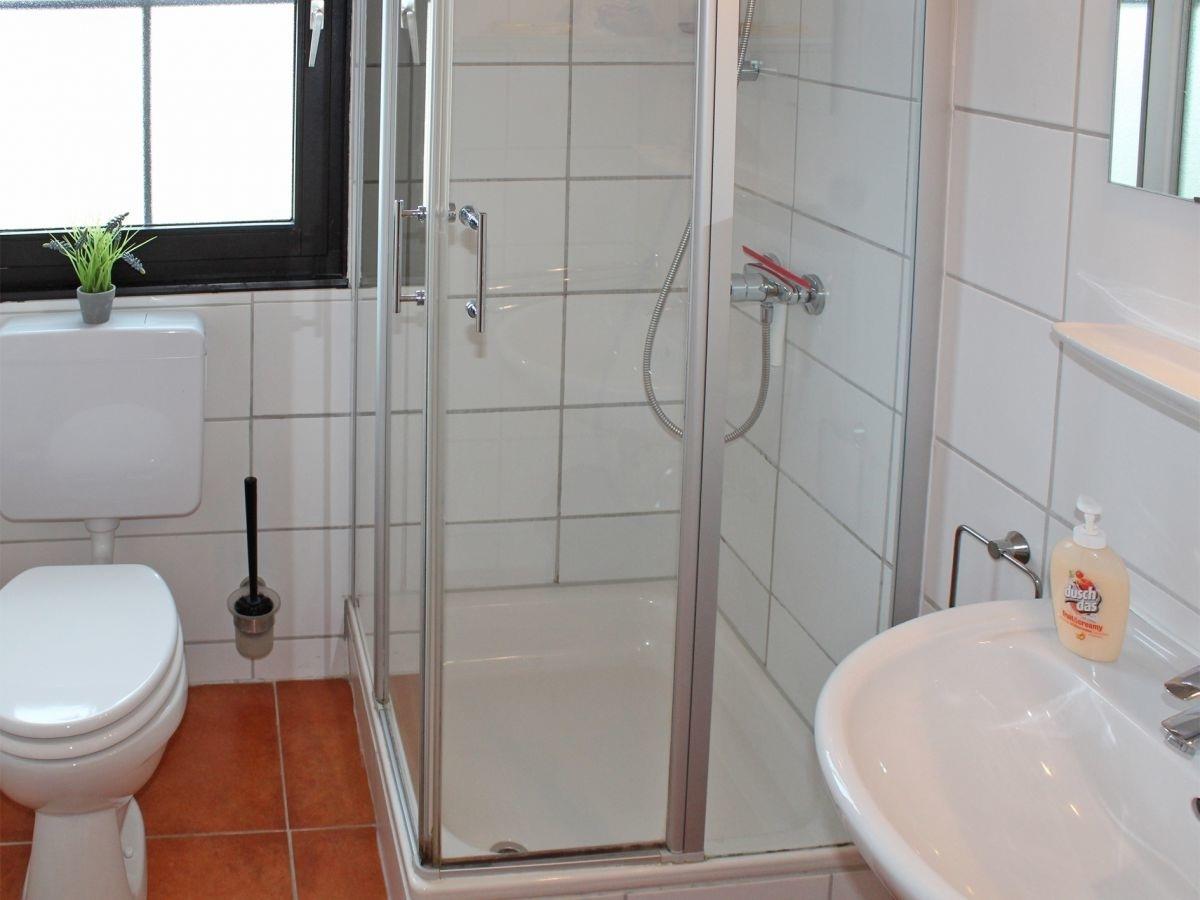 mit Dusche, Waschbecken und WC, mit Fenster.