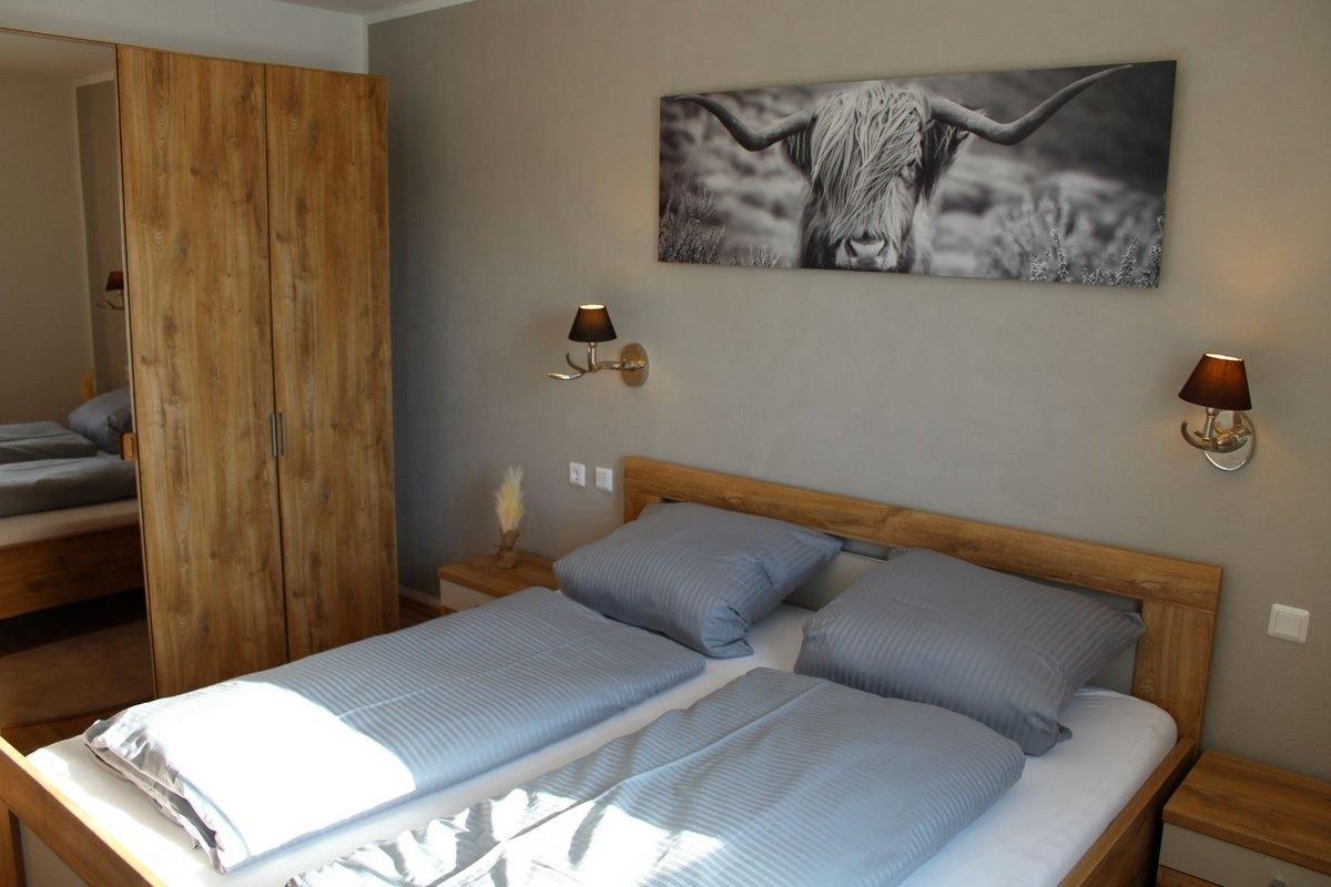 mit Doppelbett und geräumigem Kleiderschrank. Auch von diesem Zimmer aus haben Sie Zutritt zur Terrasse.