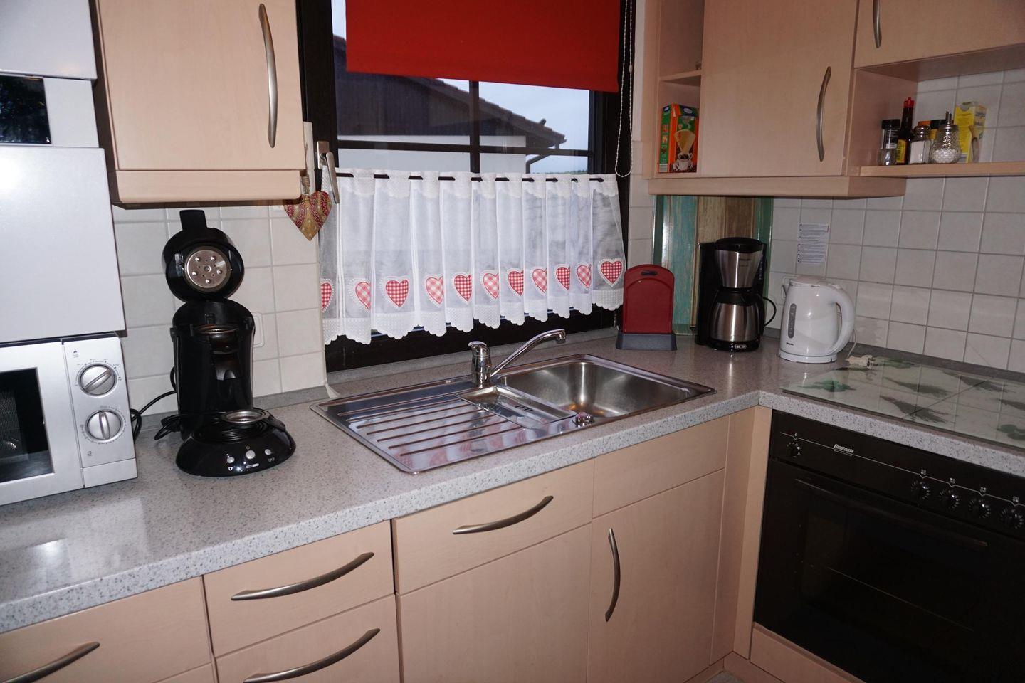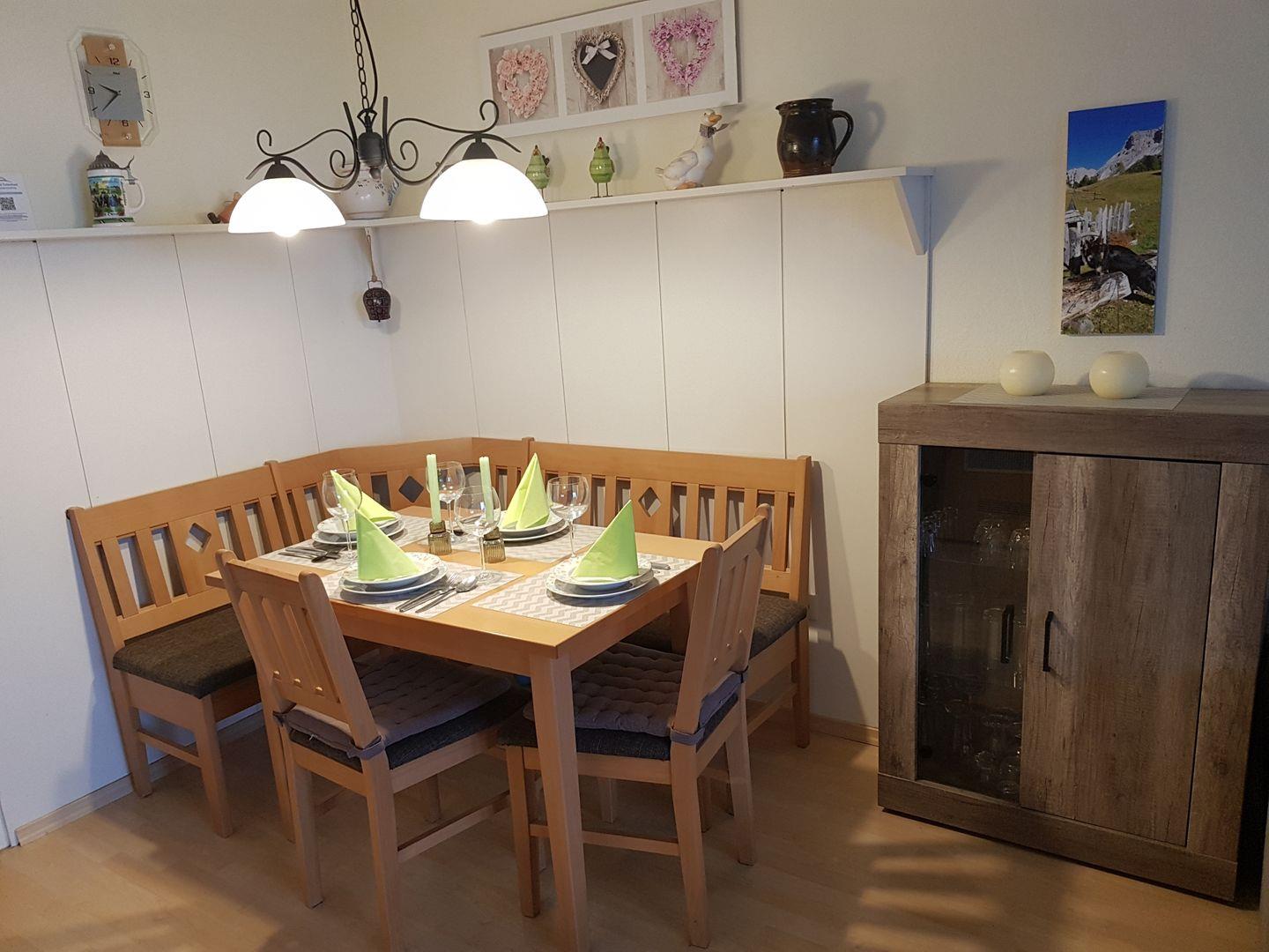 Die Ferienwohnung verfügt über zwei komfortable Schlafzimmer, eines mit Doppelbett, eines mit zwei Einzelbetten, die mit Laminat ausgelegt sind. Sie können sich hier nach einem erlebnisreichen Tag bestens entspannen. Das großzügige Wohnzimmer lädt zum Verweilen ein und ist mit einer Sofaecke ausgestattet, wo Sie gemütliche Abende mit Familie oder Freunden verbringen können. Hier befindet sich auch ein Essbereich, an dem Sie köstliche Mahlzeiten genießen können, die Sie in der voll ausgestatteten, geschlossenen Küche zubereiten. Diese beinhaltet moderne Geräte wie einen Cerankochfeld, Kühlschrank, Backofen, Mikrowelle und Geschirrspüler.