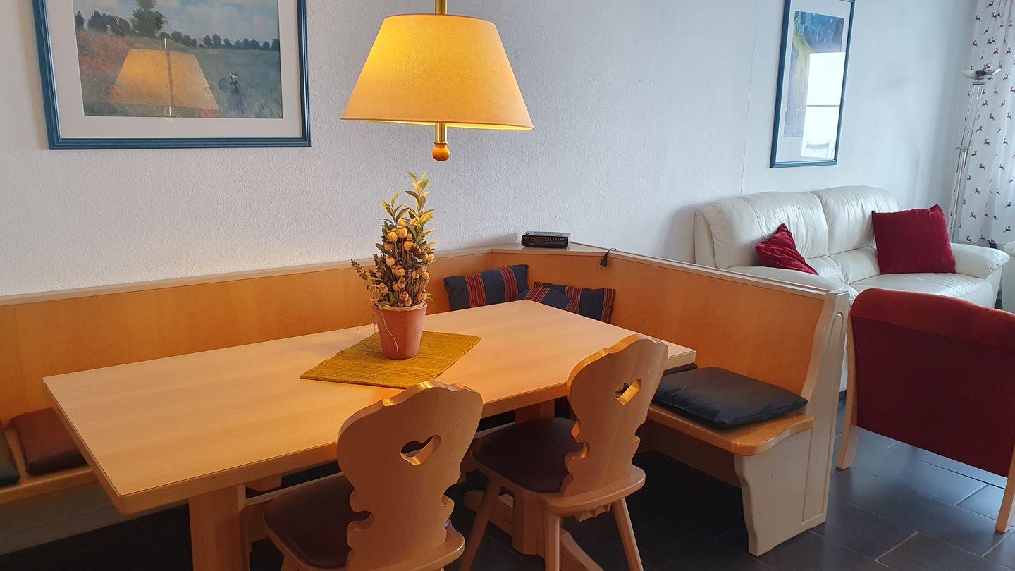 Die gemütliche Wohnung verfügt über drei komfortable Schlafzimmer, eines mit Doppelbett, zwei mit je zwei Einzelbetten, die mit einem modernen Laminatboden ausgestattet sind und für erholsame Nächte sorgen. Der großzügige Wohnbereich mit einer Sofaecke und einem Fliesenboden schafft eine einladende Atmosphäre, perfekt zum Entspannen nach einem erlebnisreichen Tag. Es gibt auch einen Essbereich, an dem sich die gesamte Familie versammeln kann, um gemeinsame Mahlzeiten zu genießen.