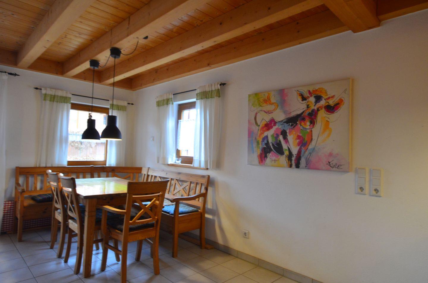 Mittelpunkt für fröhliche Runden ist die rustikale, gemütliche Essecke mit Eckbank.