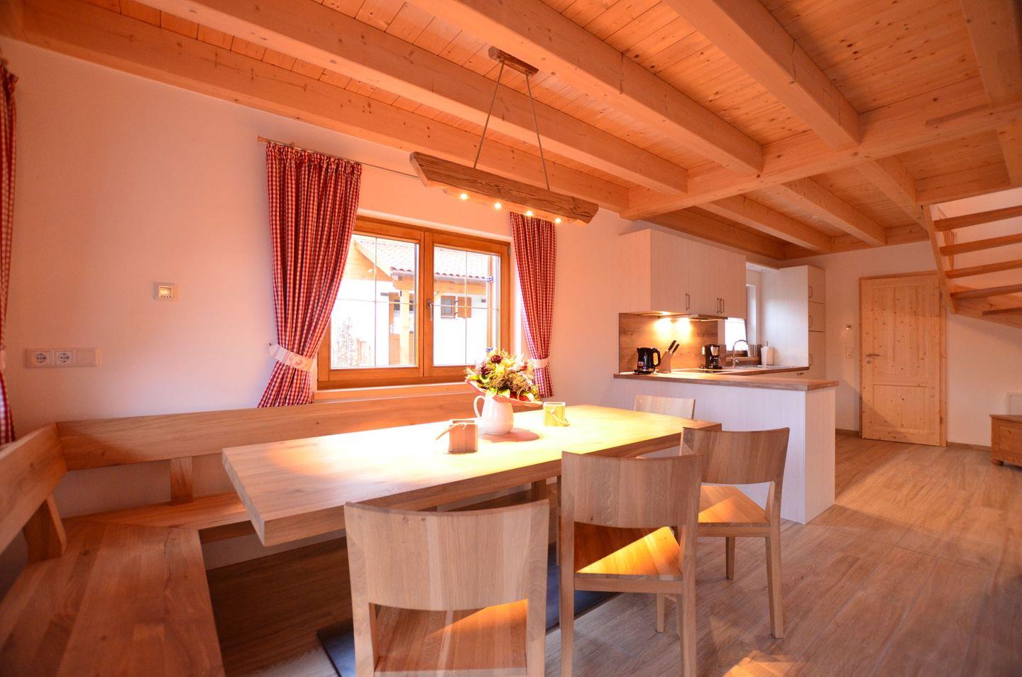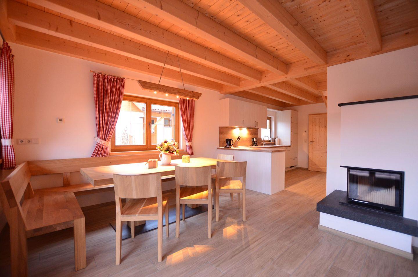 Moderne komfortable Ausstattung mit großem Essbereich und besonderem Highlight dem Kamin für gemütliche Abende. Komplett ausgestattete Küchenzeile und ein angrenzender Abstellraum mit Waschmaschine.