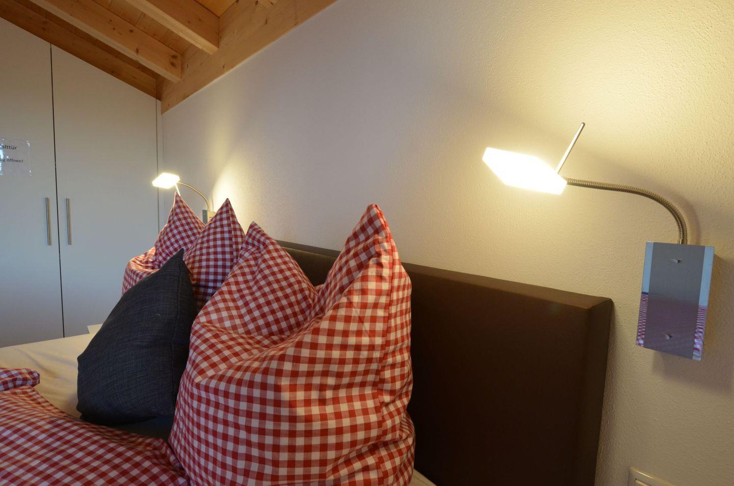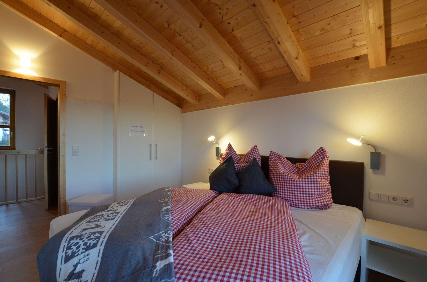 Im Obergeschoss erwarten Sie zwei Schlafzimmer mit gemütlichen Polsterbetten, Kleiderschrank und Zugang zum Balkon mit Berg und Seeblick.