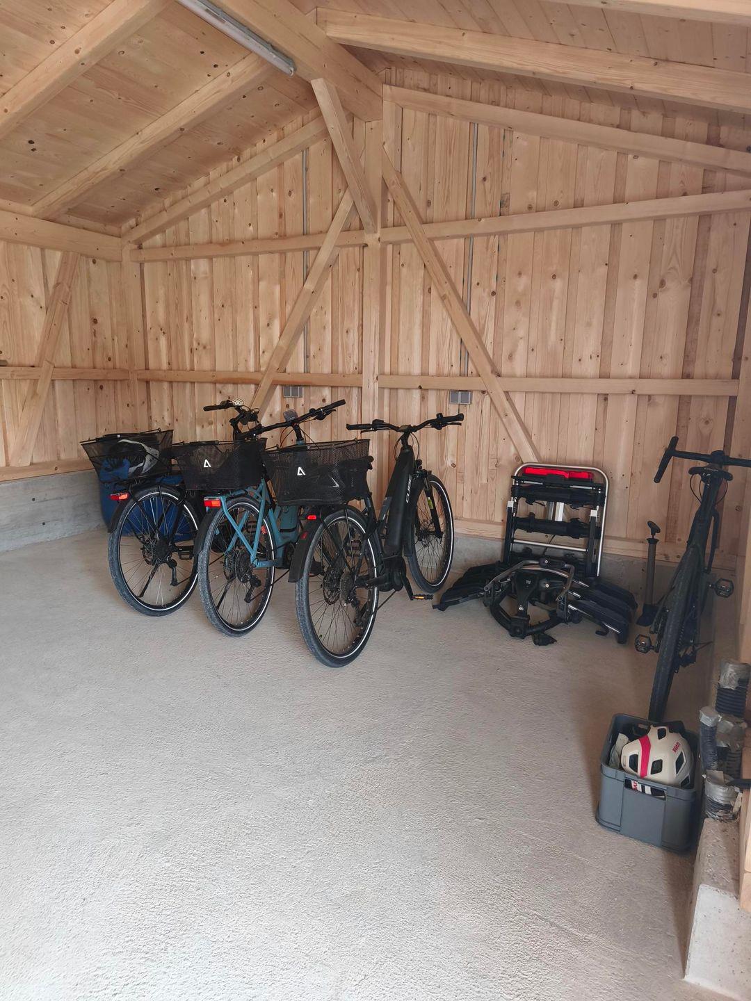 "Sicher parken und e-Bikes bequem laden: Unsere geschützte Fahrradunterstellmöglichkeit (Haus 72 - 75 ) bietet wetterfeste Stellplätze, 24/7 Zugang, Ladeanschlüsse für E-Bikes. Perfekt für Ihren Fahrradurlaub – sicher, komfortabel und zuverlässig."