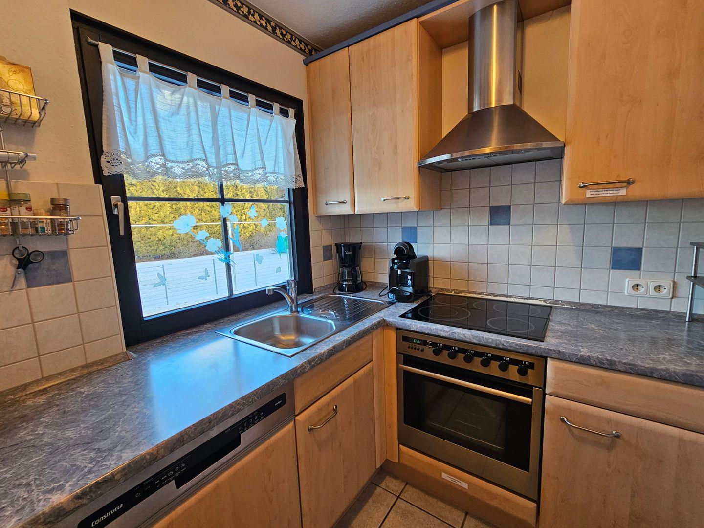 Die geschlossene Küche ist voll ausgestattet und lässt keine Wünsche offen: Cerankochfeld, Backofen, Mikrowelle, Geschirrspüler, Kühlschrank mit Gefrierfach, Kaffeemaschine sowie eine Kapselmaschine, Wasserkocher und Toaster. Geschirr und Besteck sind selbstverständlich ebenfalls vorhanden, sodass gemeinschaftlichen Mahlzeiten im angrenzenden Essbereich nichts im Wege steht. Neben einer Garderobe sorgen eine Kommode sowie ausreichend Stauraum für Komfort. Im Badezimmer erwartet Sie eine moderne Dusche sowie Waschbecken, WC, Fenster und ein Haartrockner.