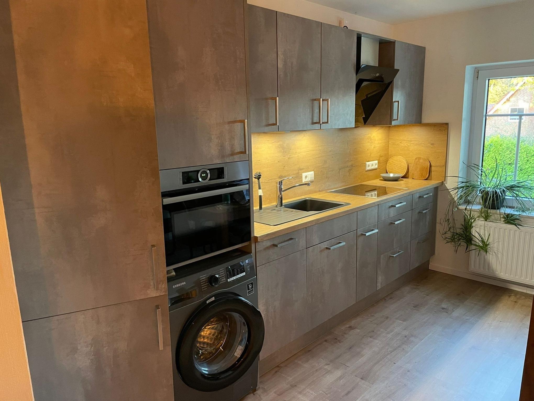 Die Küchenzeile ist mit allem notwendigen ausgestattet, Backofen, Mirkowelle und Wasserkocher sind vorhanden.
