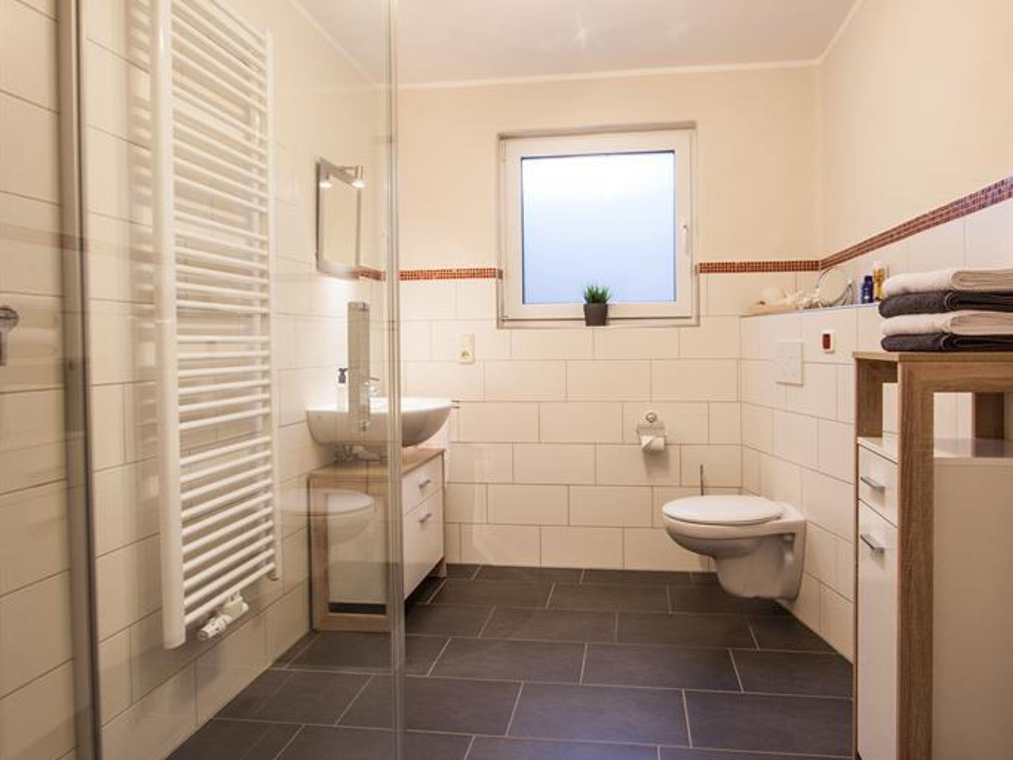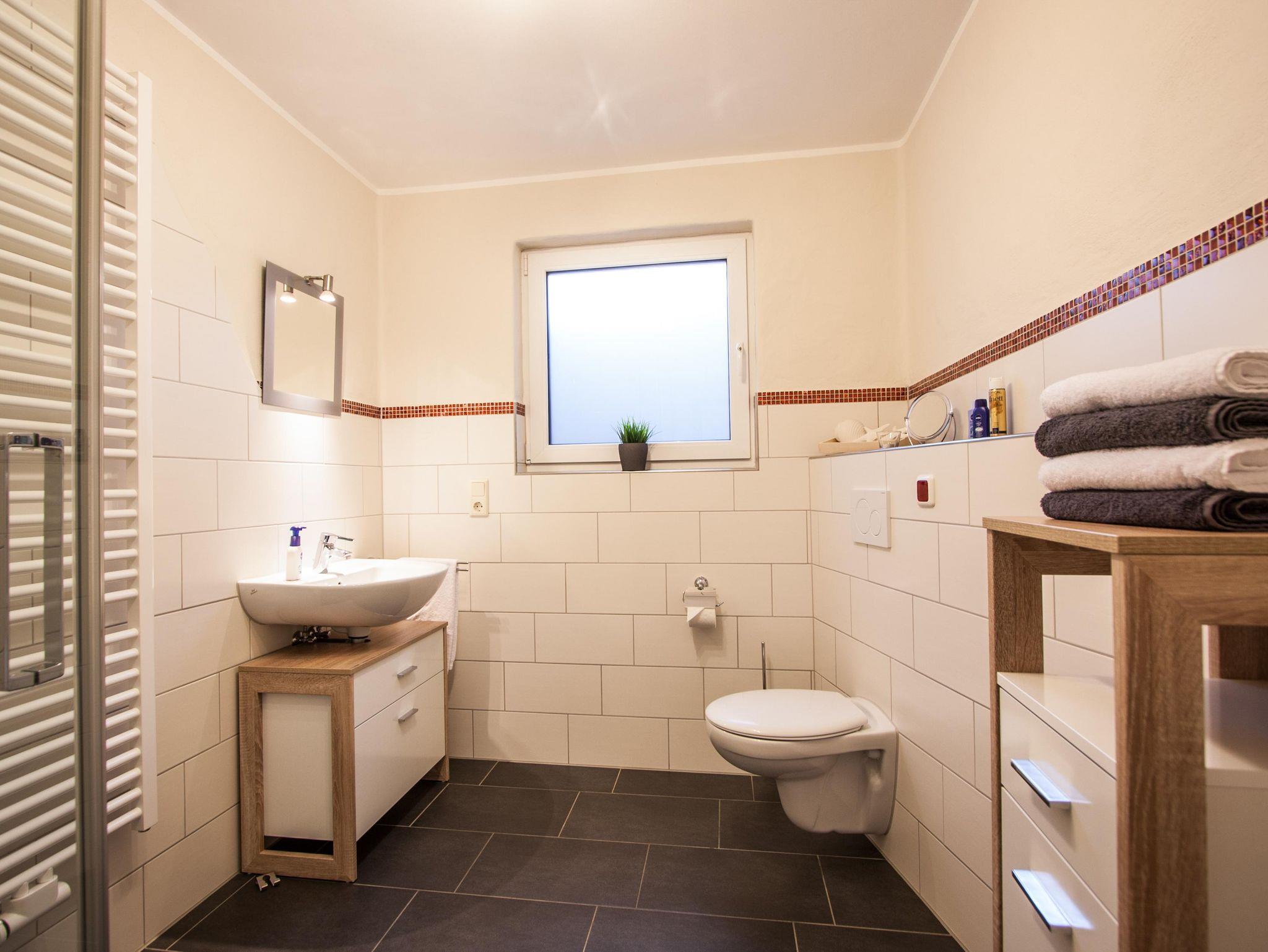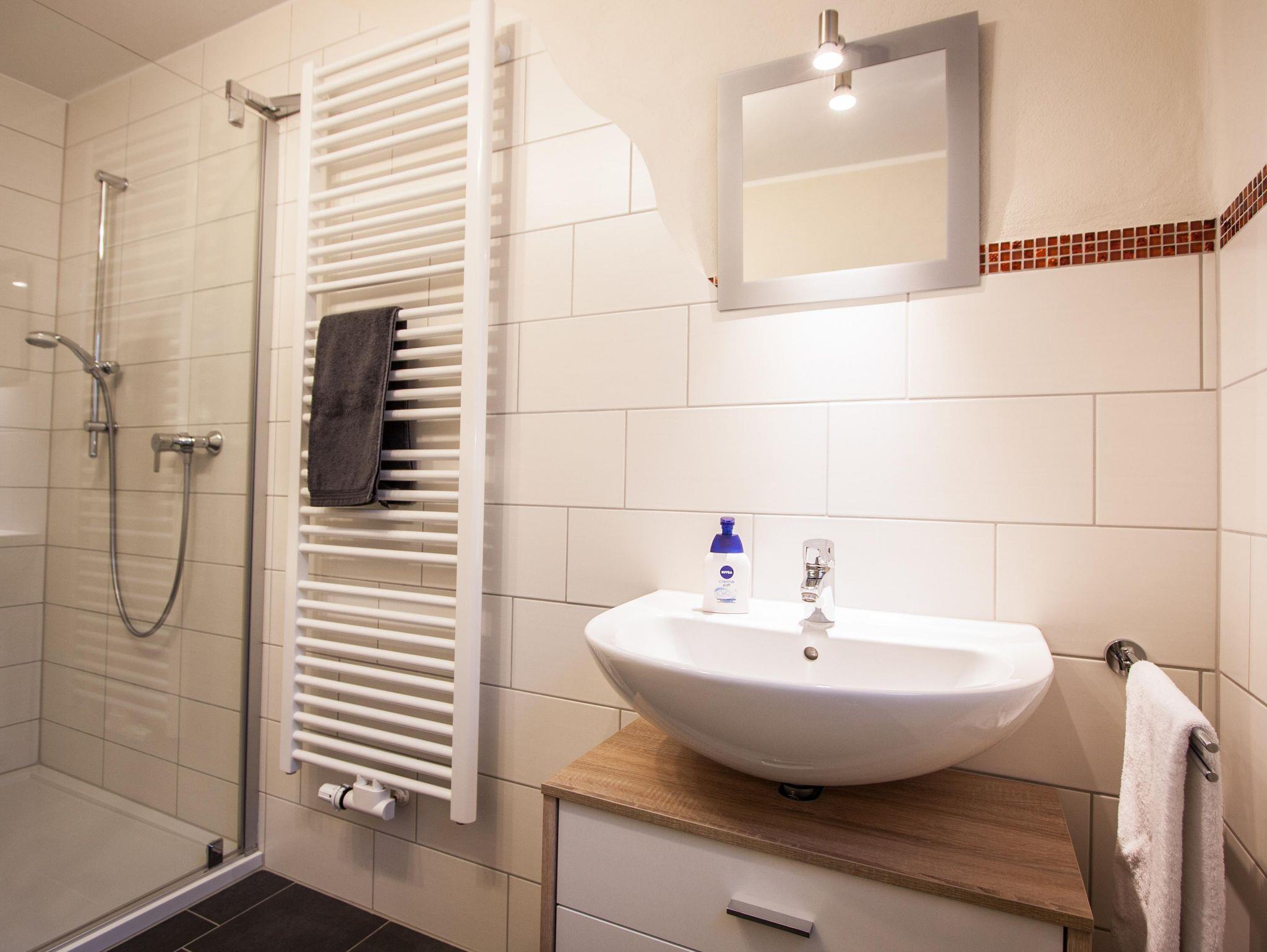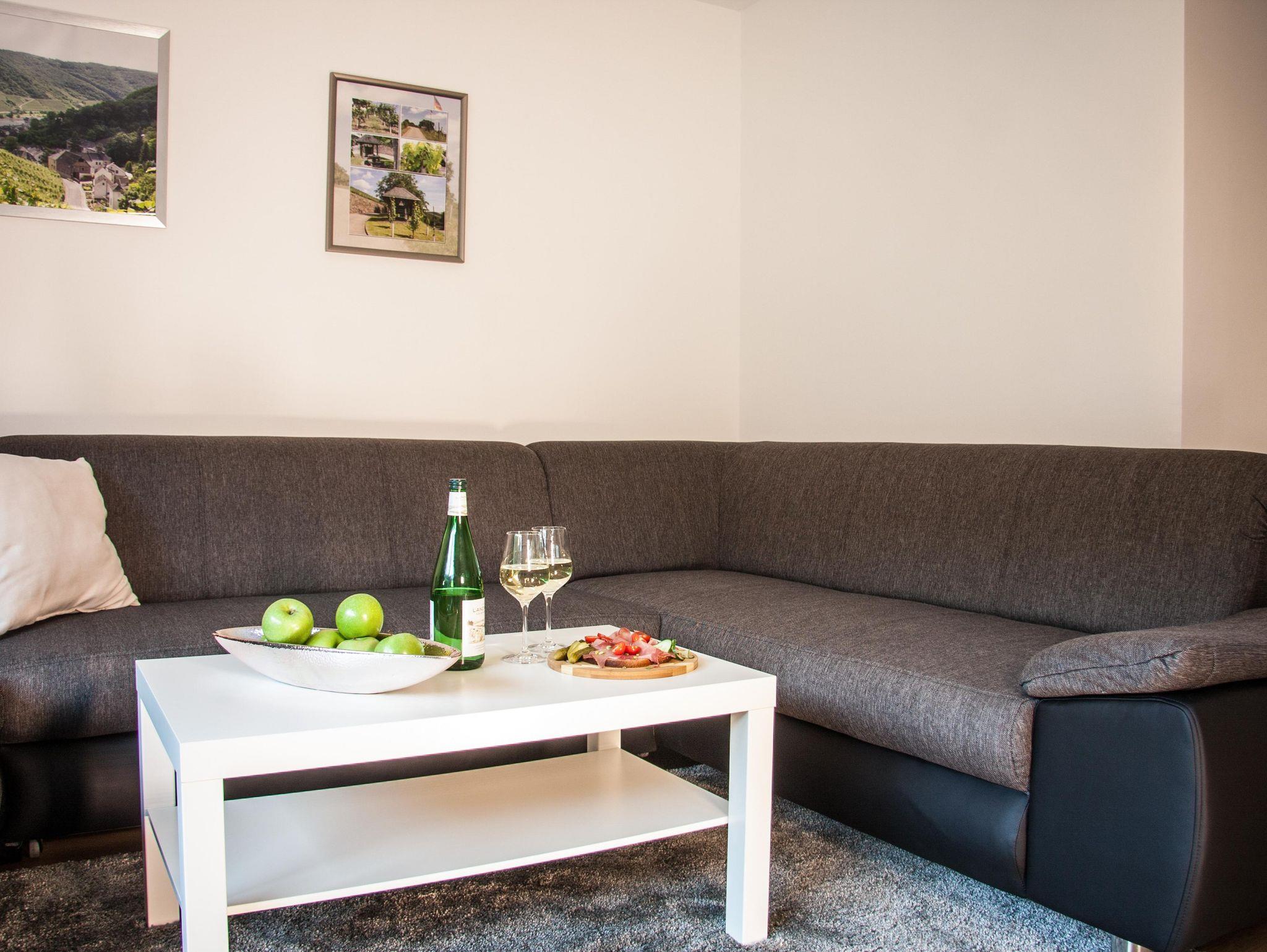 Unsere Komfort-Ferienwohnung bietet Ihnen alles, für einen erholsamen Urlaub an der Mosel an. In der komplett ausgestatten Küche mit Esstisch finden Sie folgendes vor: Backofen, Geschirrspülmaschine, Elektroherd, Kühlschrank mit Gefrierfach, Mikrowelle, Wasserkocher, Toaster, Kaffeemaschine und vieles mehr. Über den Flur erreichen Sie das helle Wohnzimmer. Die einladende Wohnlandschaft ist der Eye-Catcher im Raum. Zudem finden Sie hier ein SAT-TV, eine Hifi Anlage und vieles mehr vor. Zwei Doppelschlafzimmer, jeweils mit einem Kleiderschrank ausgestattet und großen Fenstern zur Terrasse finden Sie vor. Das Badezimmer ist mit einer ebenerdiger Dusche, Handtuchwärmer, Spiegel und WC ausgestattet.