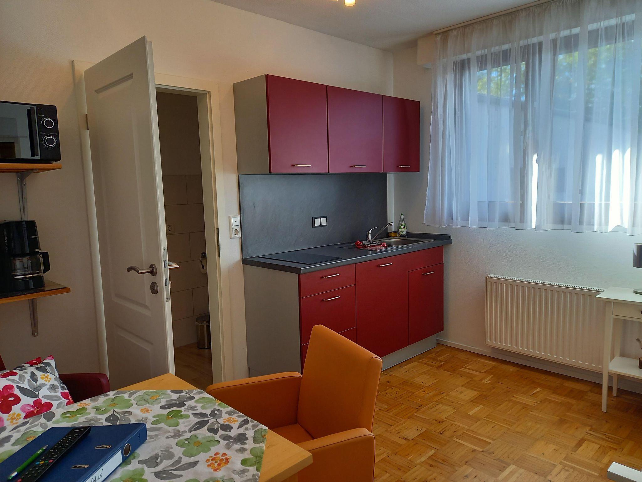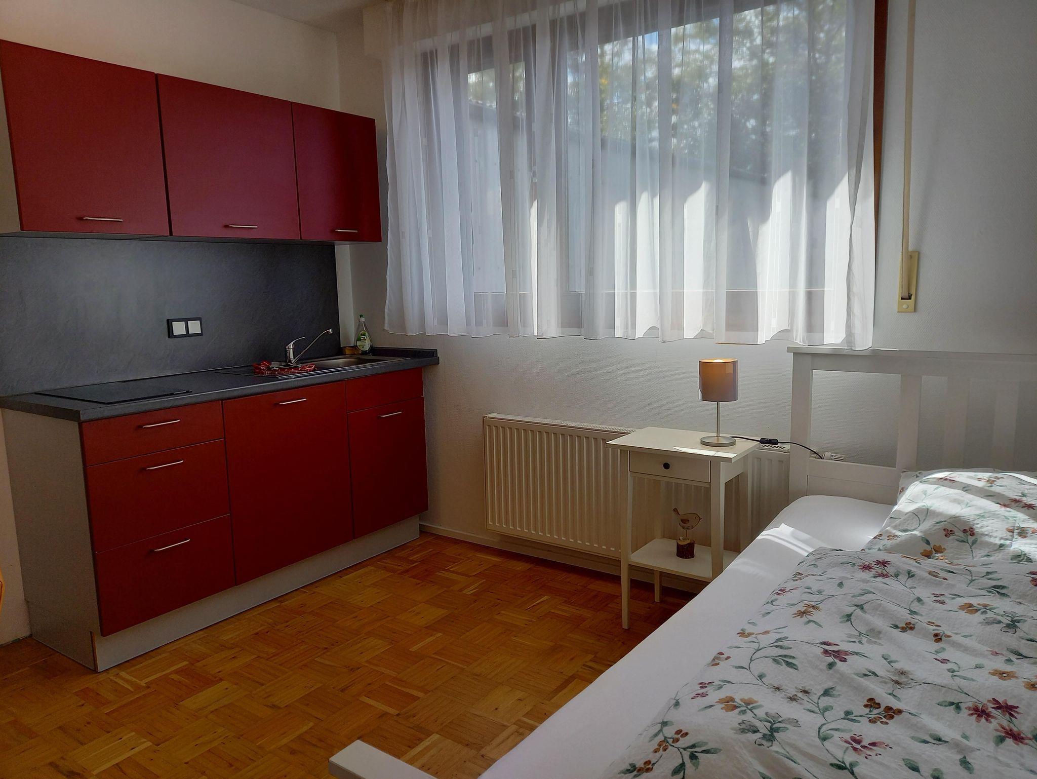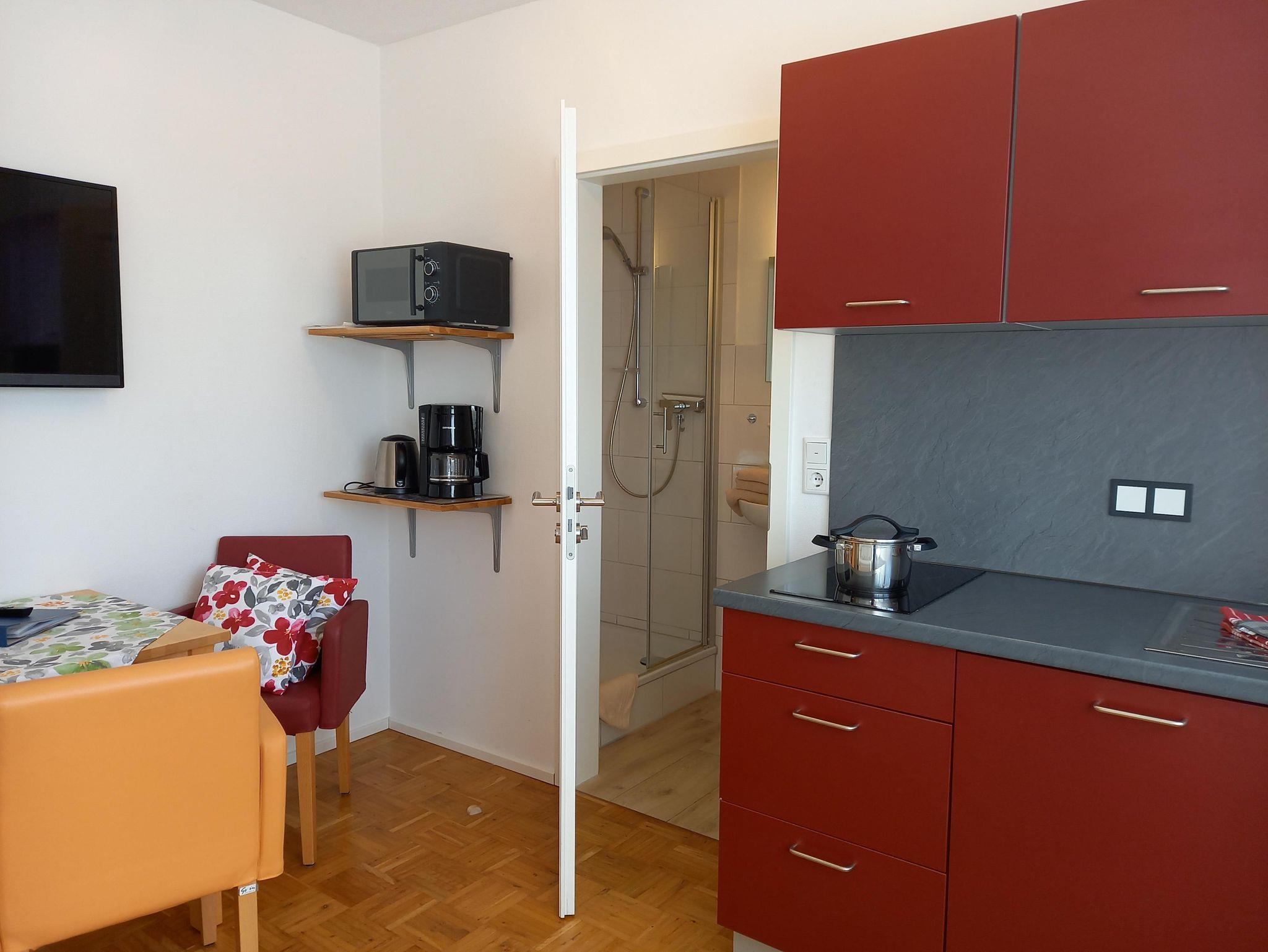 Unser kleines Appartement ist ausgestattet mit einem 1,40 m breiten Bett, Kleiderschrank, Tisch und Stühle sowie einem SAT-Fernseher und verfügt über ein sehr schönes Duschbad. Ihnen steht eine Küchenzeile mit 2-Platten Ceranfeld, Kühlschrank, Mikrowelle, Wasserkocher und Kaffeemaschine zur Verfügung. Für 1 Person ist es ideal, aber auch die Belegung mit 2 Personen ist möglich.