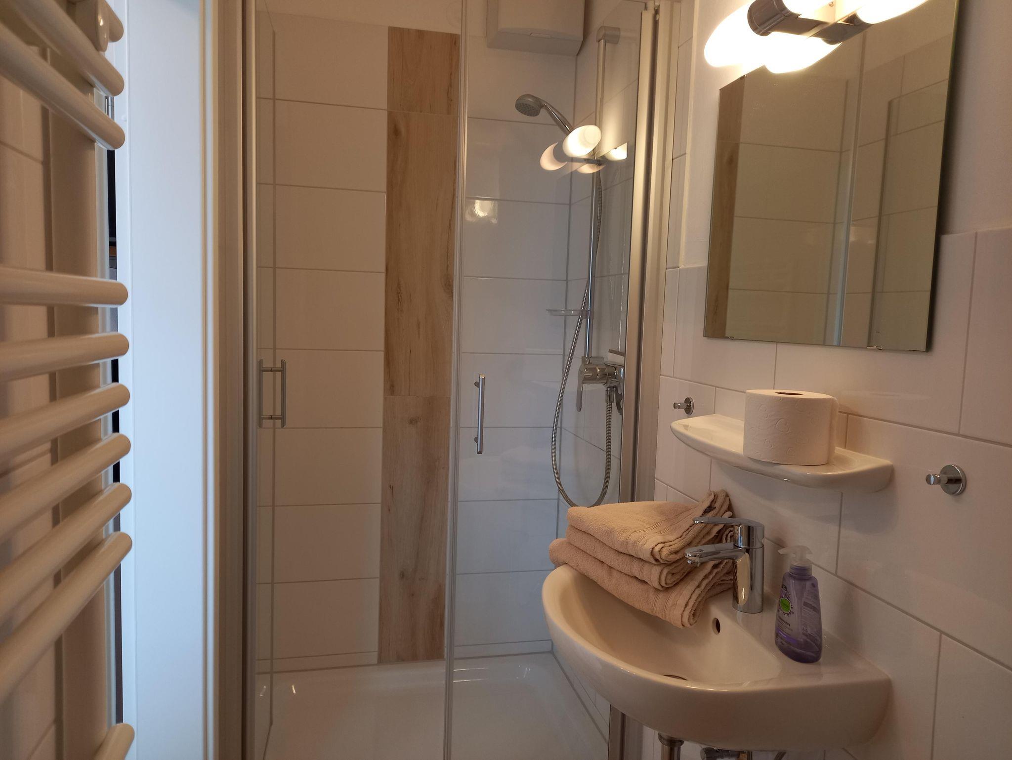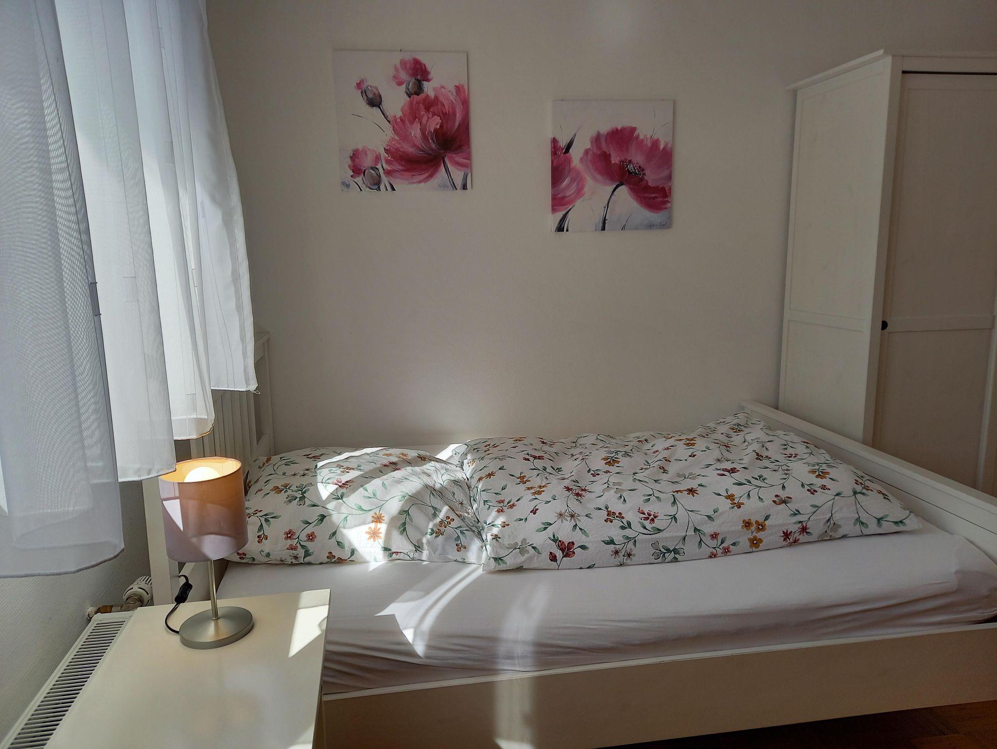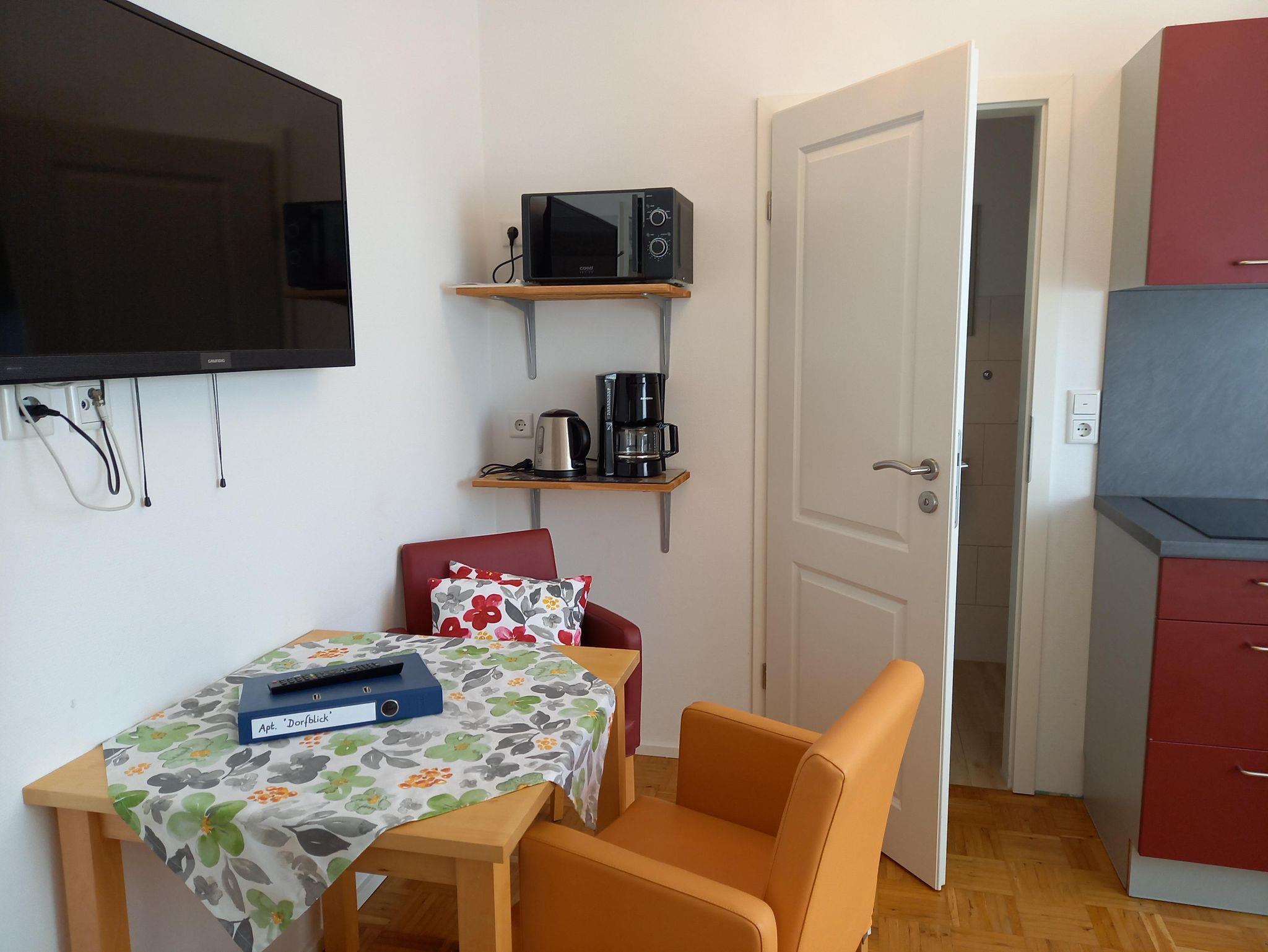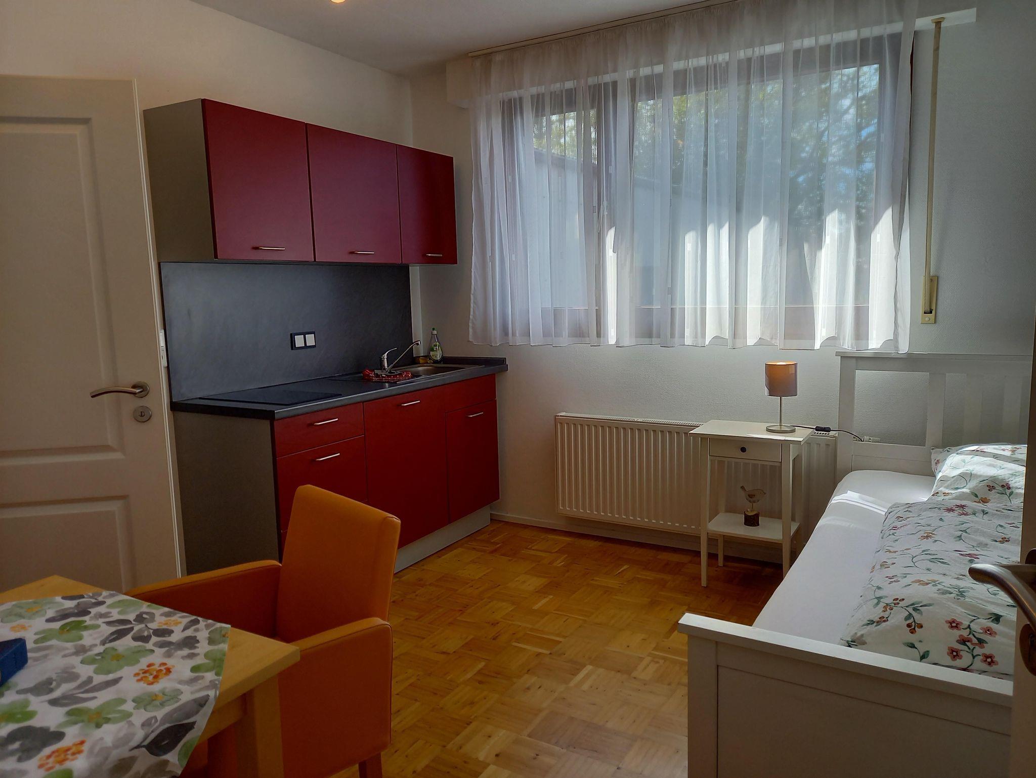 Unser kleines Appartement ist ausgestattet mit einem 1,40 m breiten Bett, Kleiderschrank, Tisch und Stühle sowie einem SAT-Fernseher und verfügt über ein sehr schönes Duschbad. Ihnen steht eine Küchenzeile mit 2-Platten Ceranfeld, Kühlschrank, Mikrowelle, Wasserkocher und Kaffeemaschine zur Verfügung. Für 1 Person ist es ideal, aber auch die Belegung mit 2 Personen ist möglich.
