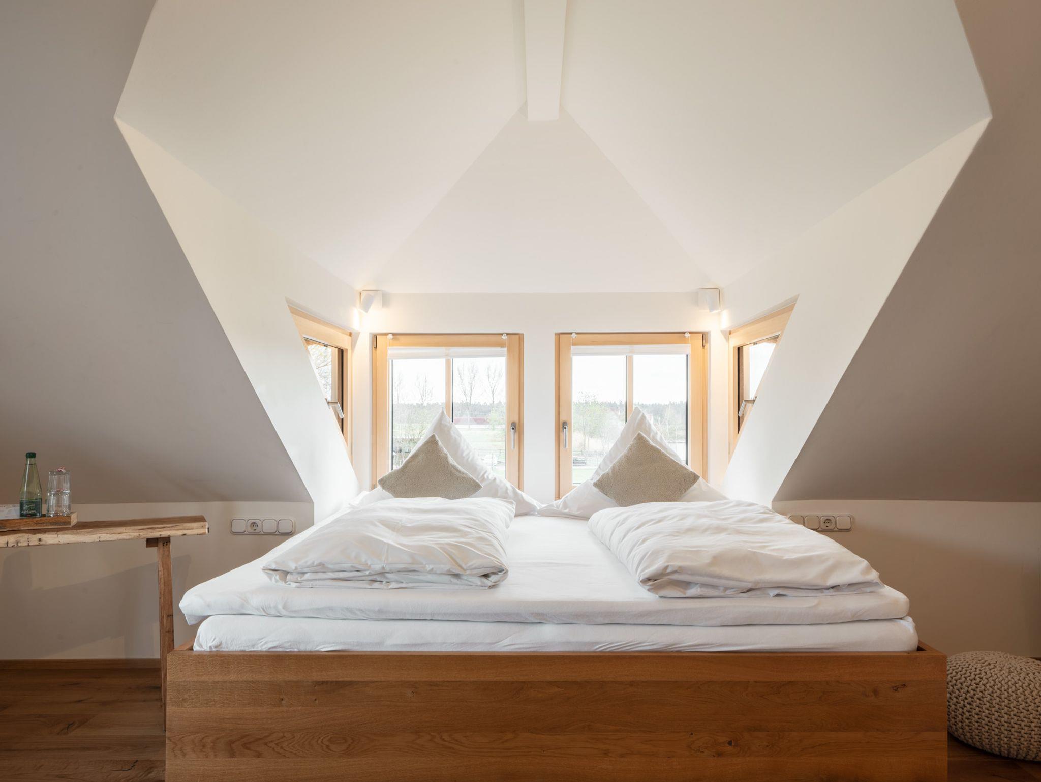 Sie wohnen in individuell eingerichteten Naturholz-Zimmern mit Eichenboden, komfortablen Betten und modernen Bädern. Das Ambiente ist hochwertig und auf Entspannung, Ruhe und Wohlfühlkomfort ausgerichtet – ideal für Geschäftsreisen, Kurzurlaube, Outdoor-Fans, Familien und alle, die eine naturnahe Unterkunft im Nürnberger Land suchen. Hunde sind auf Anfrage willkommen.